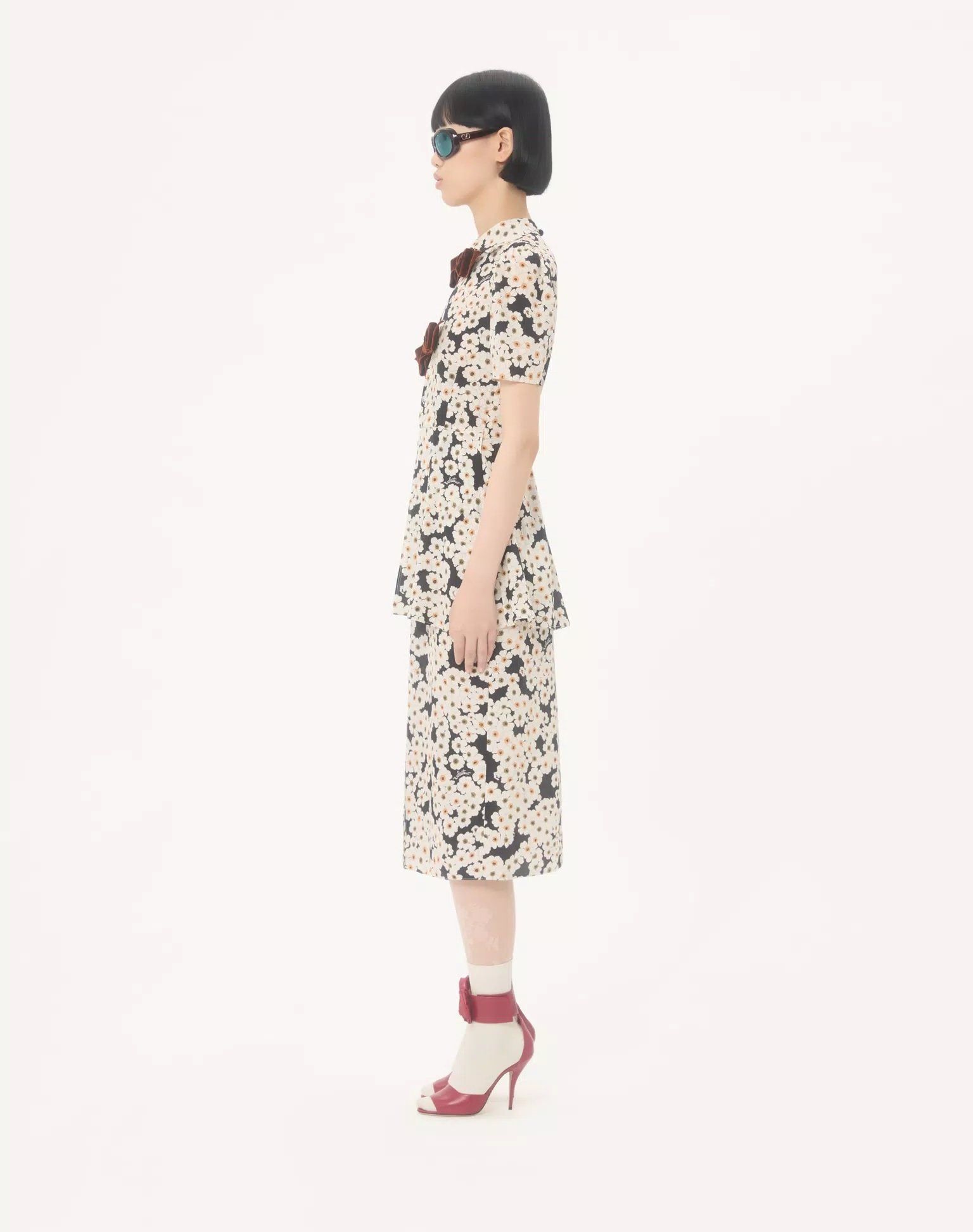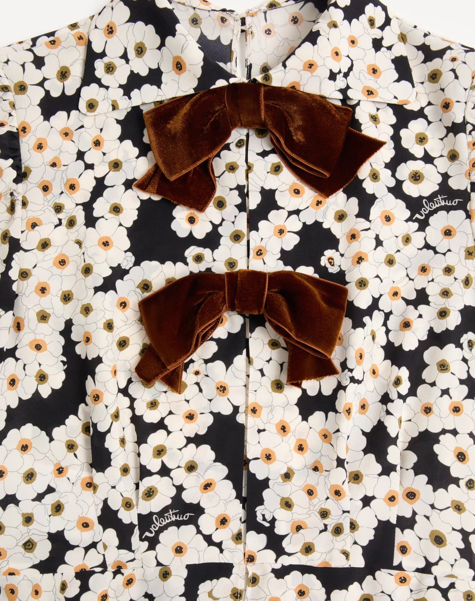 Váy liền cộc tay cổ bẻ nền màu đen toàn thân họa tiết hoa nhỏ màu trắng, ngực gắn 2 nơ, trên trên giả áo.