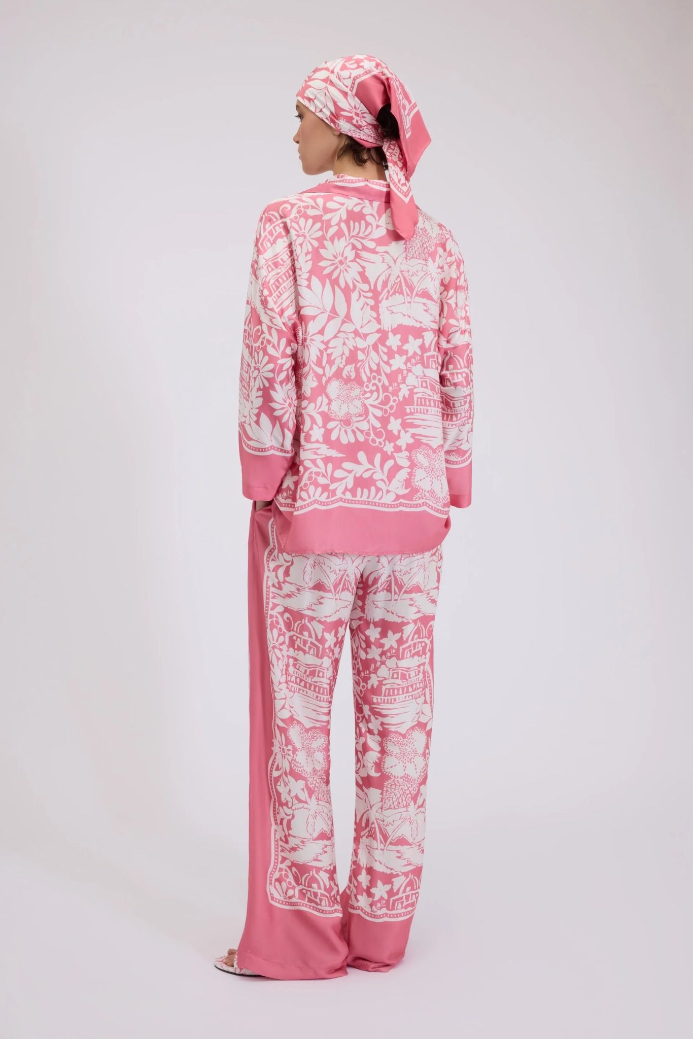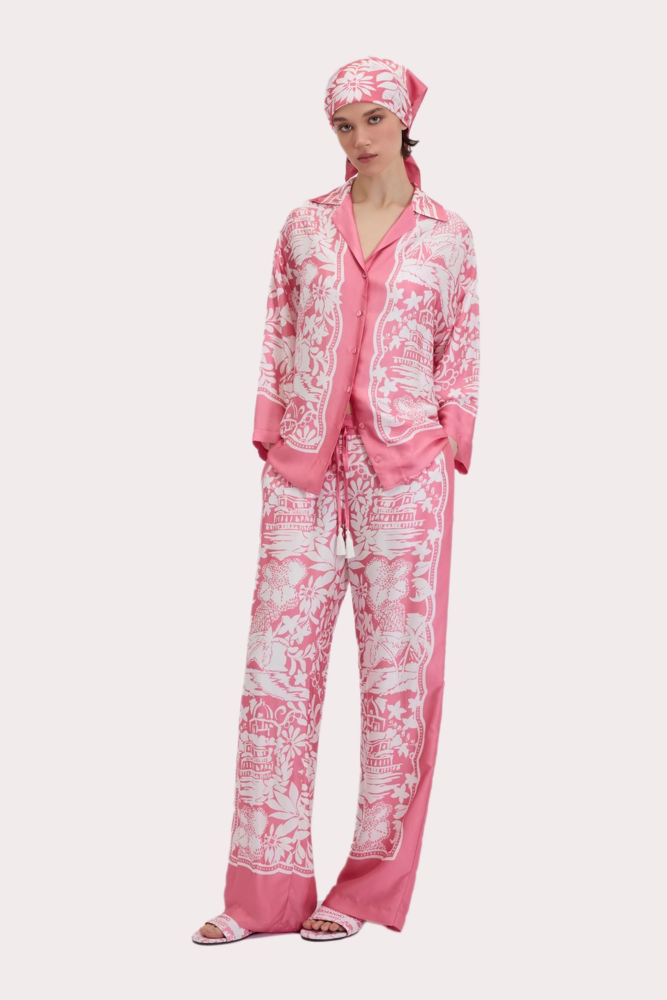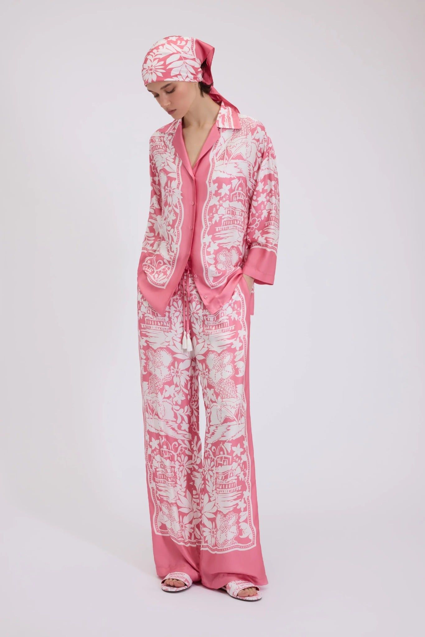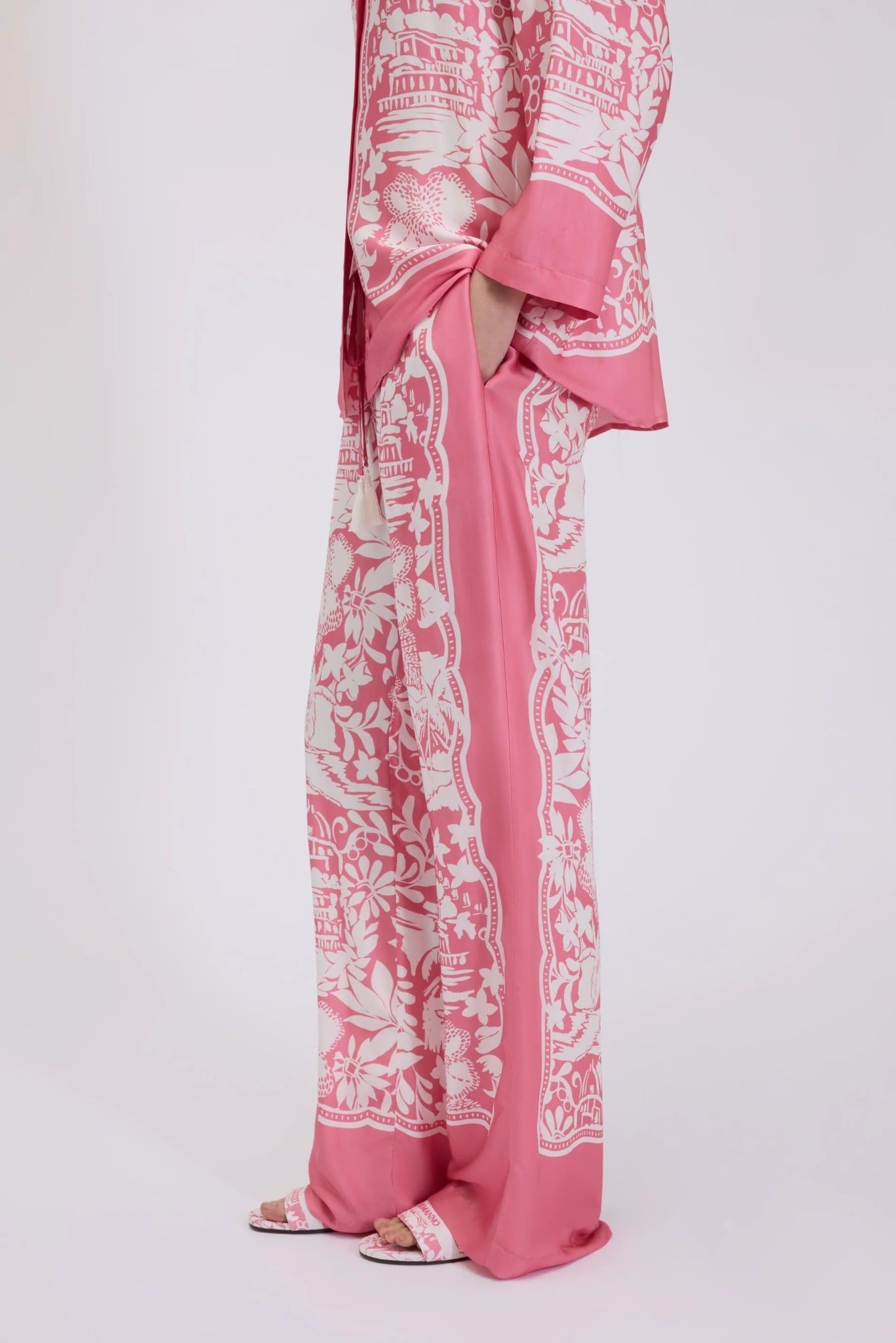 Quần tây nữ chất lụa nền hồng toàn thân họa tiết trắng, cạp pha chun có dây rút