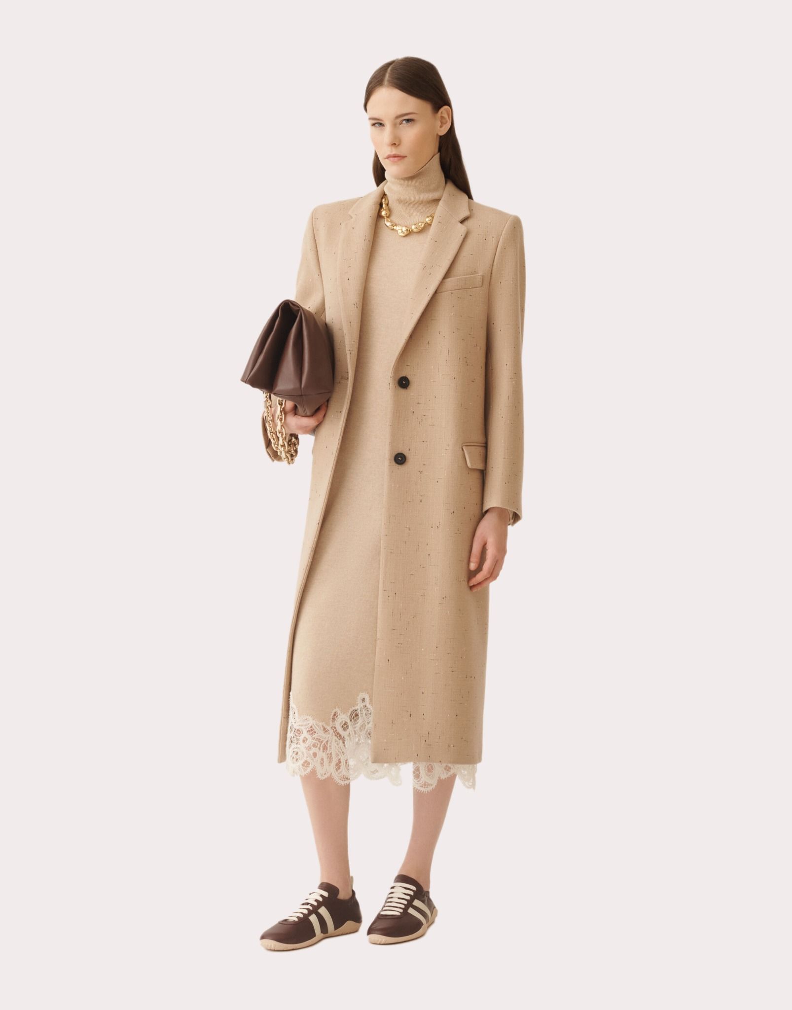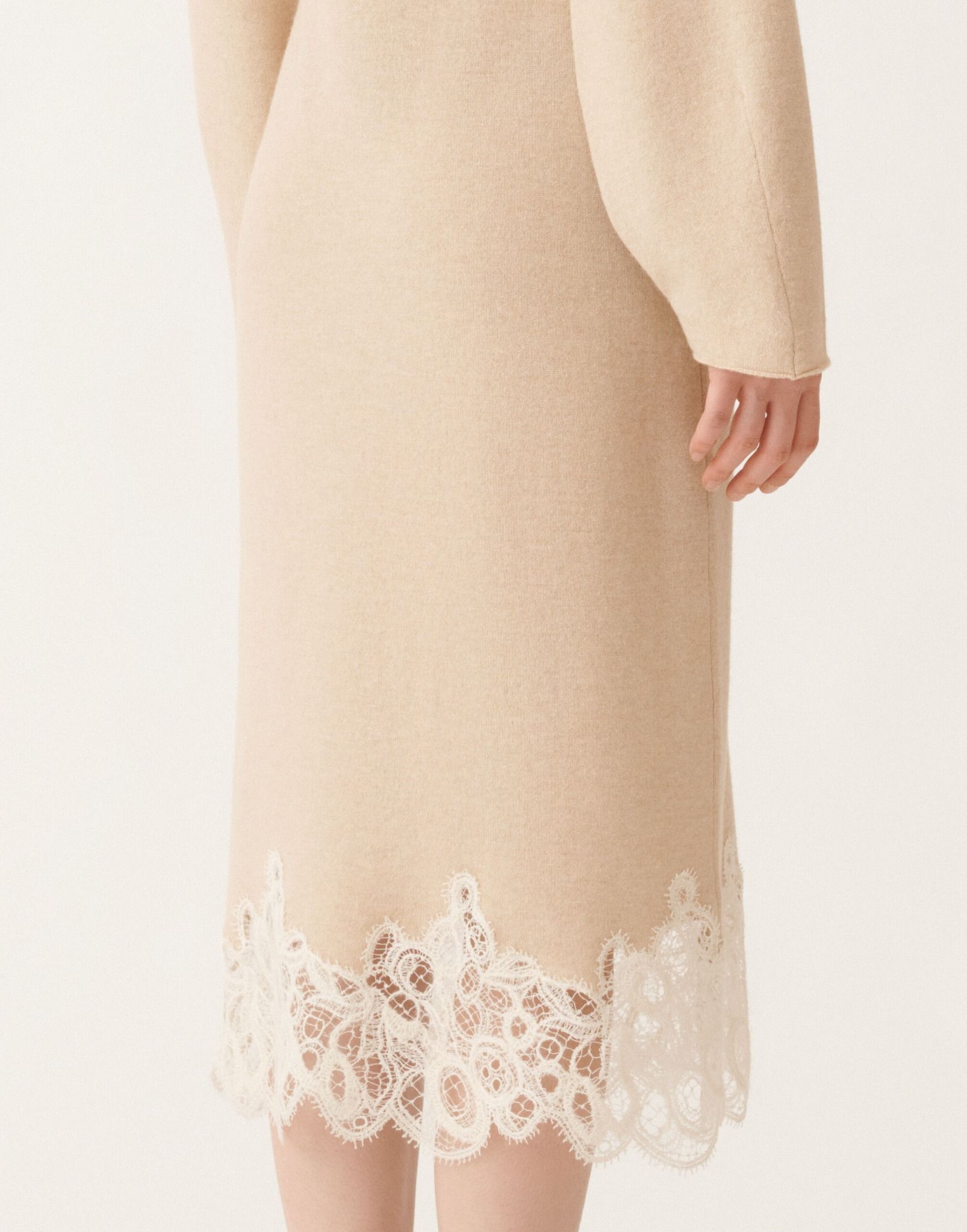 Váy liền chất sợi dài tay cổ lọ màu nâu nhạt, gấu pha ren hoa trắng