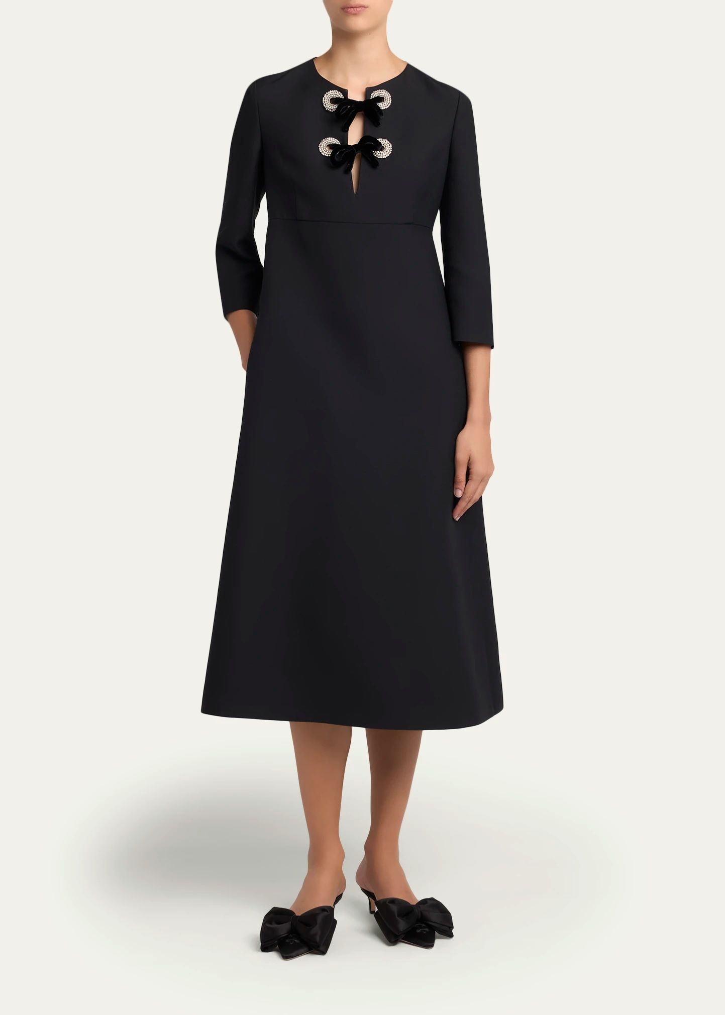 Váy liền dài tay cổ tròn kéo khóa sau màu đen, ngực đục 4 lỗ đính đá trắng luồn dây buộc 2 nơ màu đen