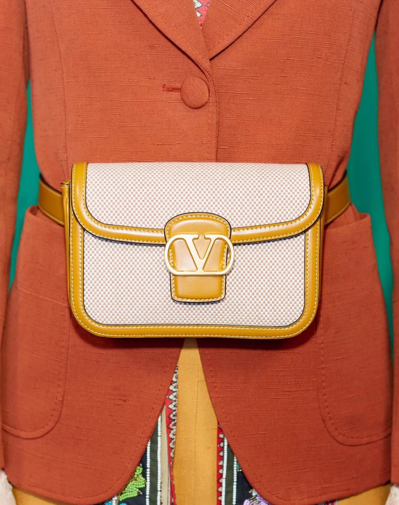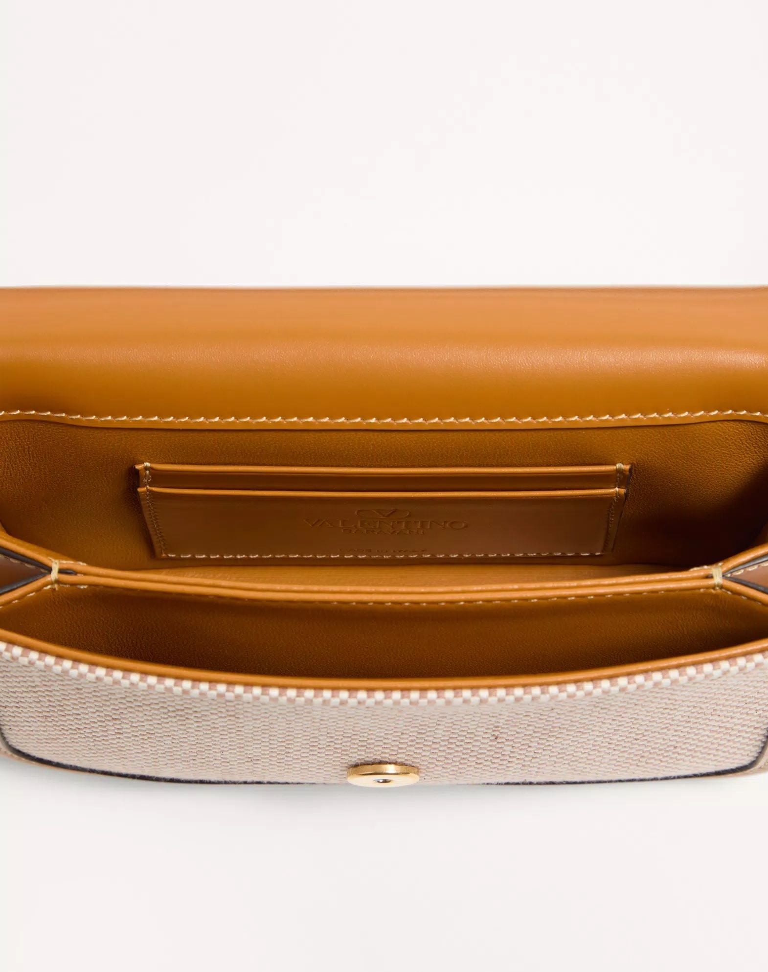 TÚI NỮ KẺ CARO MÀU TRẮNG NÂU, VIỀN DA MÀU NÂU, NẮP LOGO CHỮ V MÀU VÀNG, 1 QUAI ĐEO, SIZE 18X12