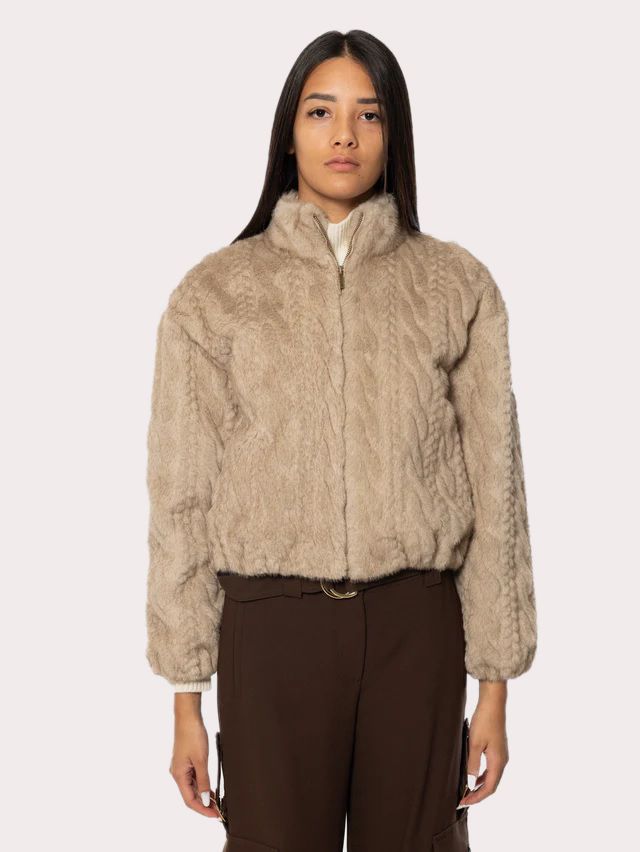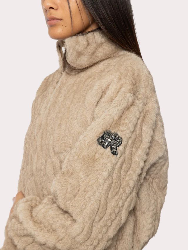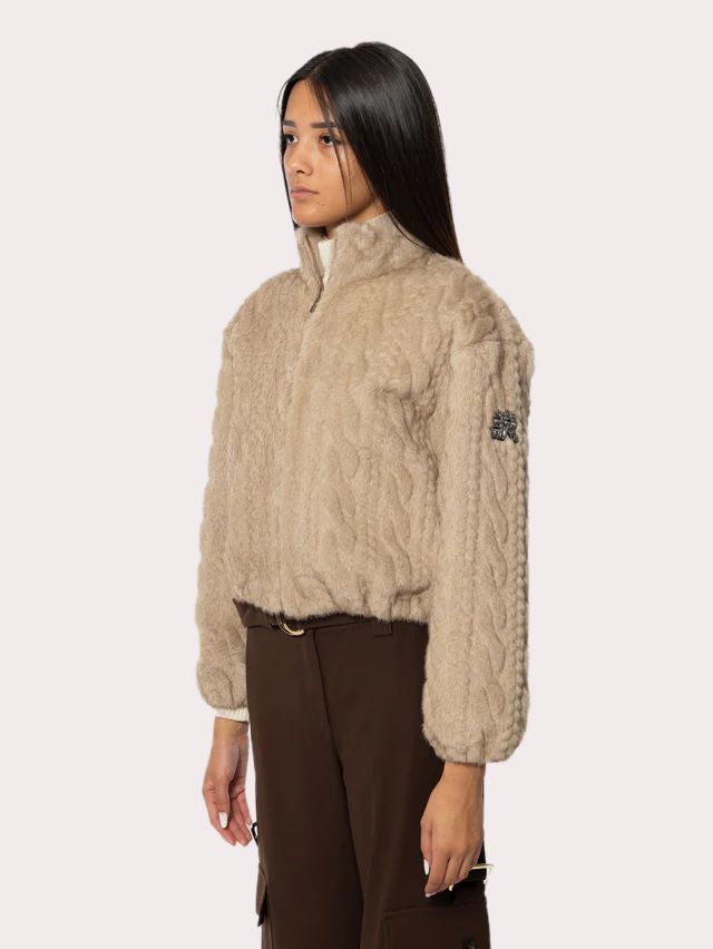 Áo khoác nữ chất len sù màu nâu nhạt, kéo khóa, tay trái gắn đá tạo logo