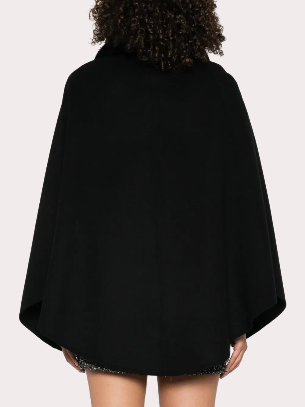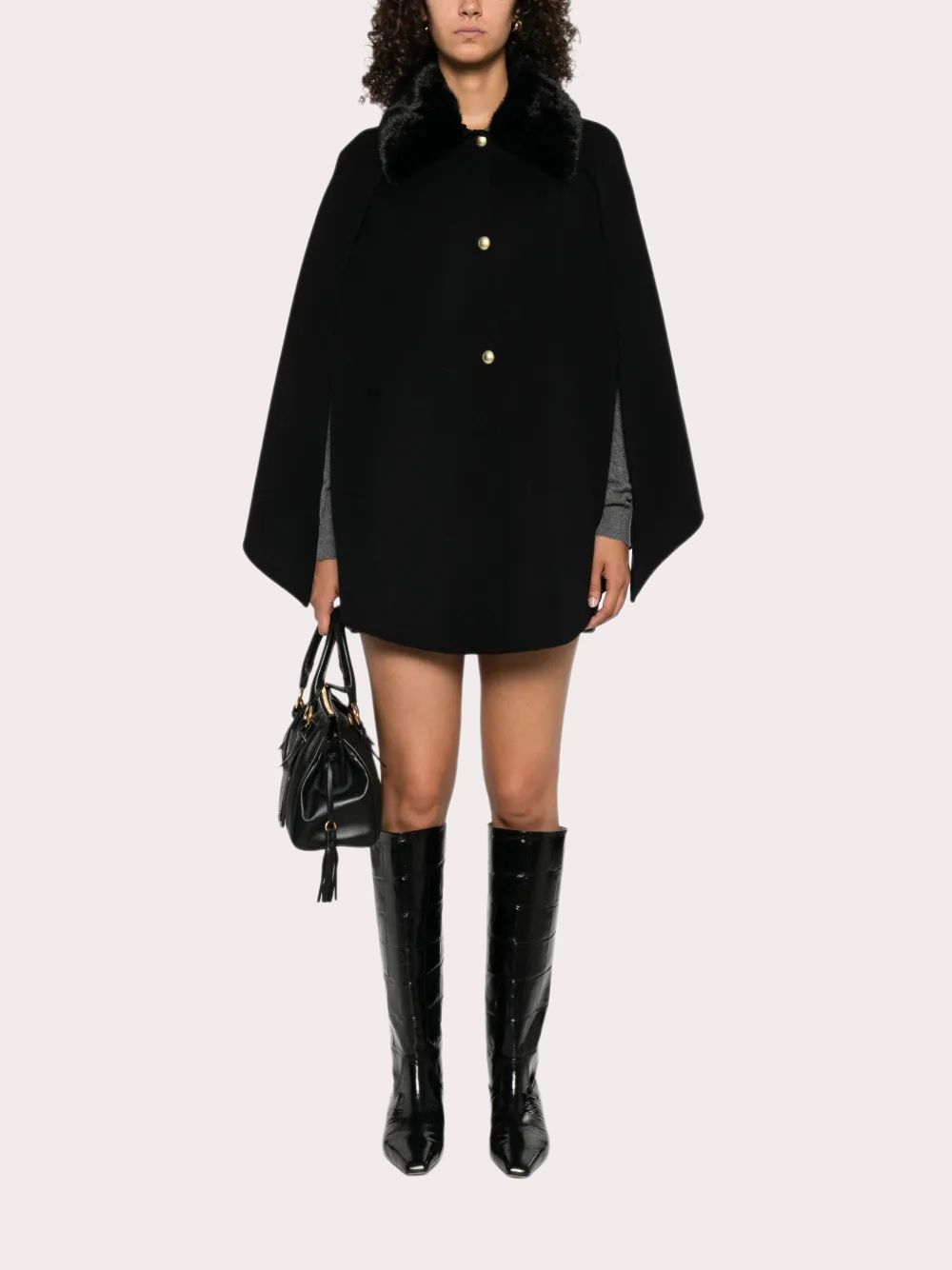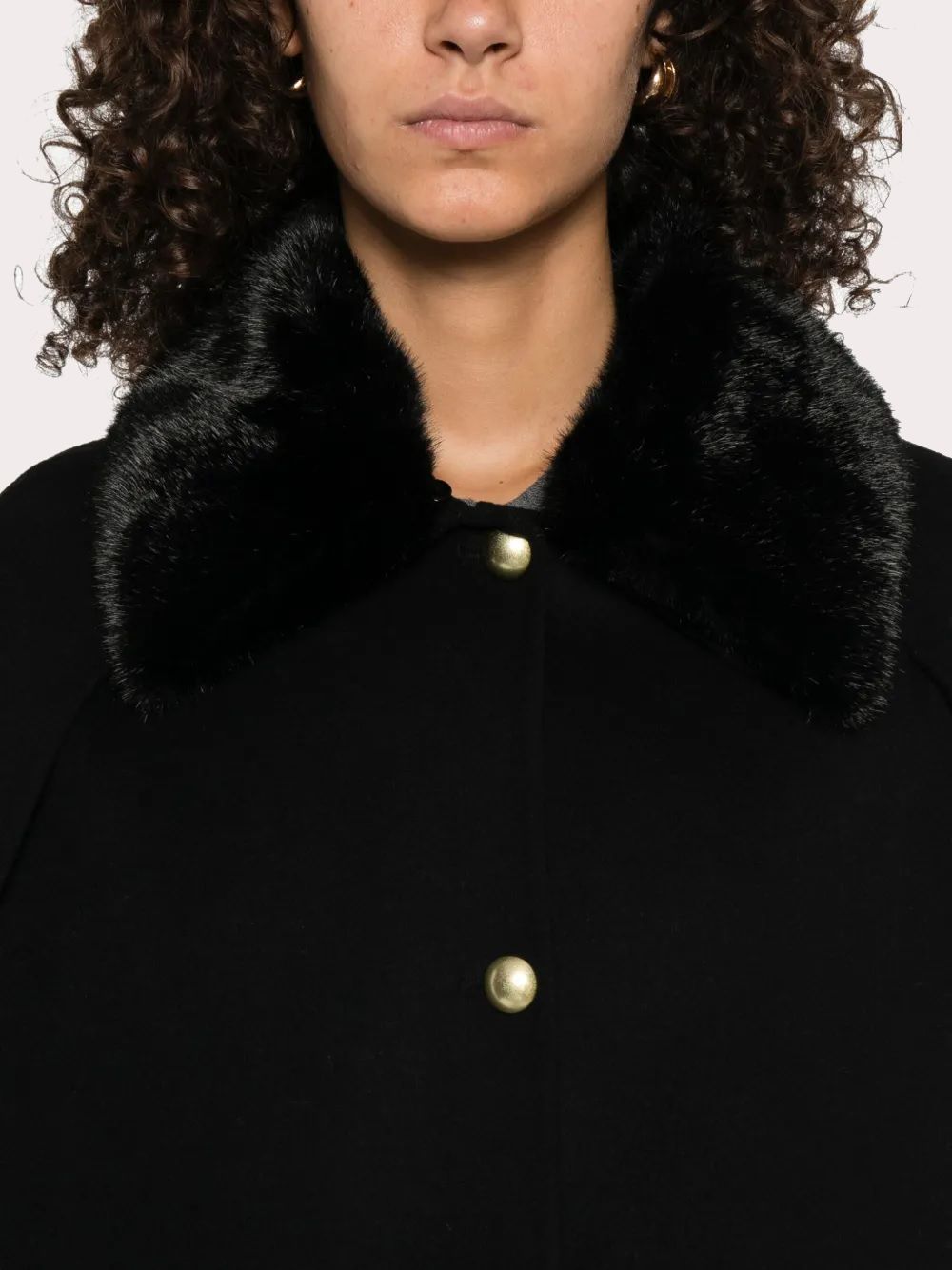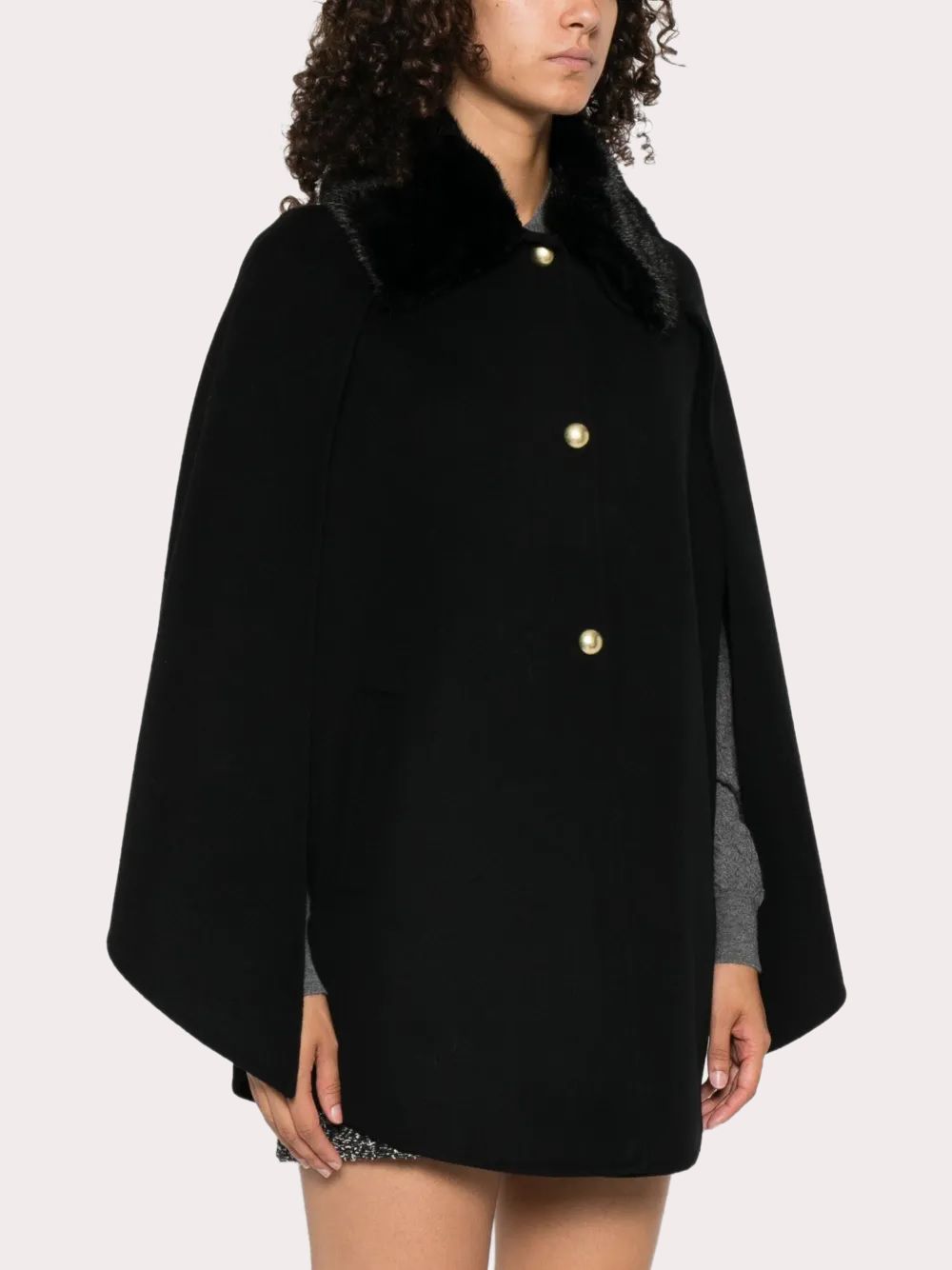 Áo khoác nữ chất dạ màu đen cài 3 khuy kim loại, tay cánh dơi, cổ pha lông đen