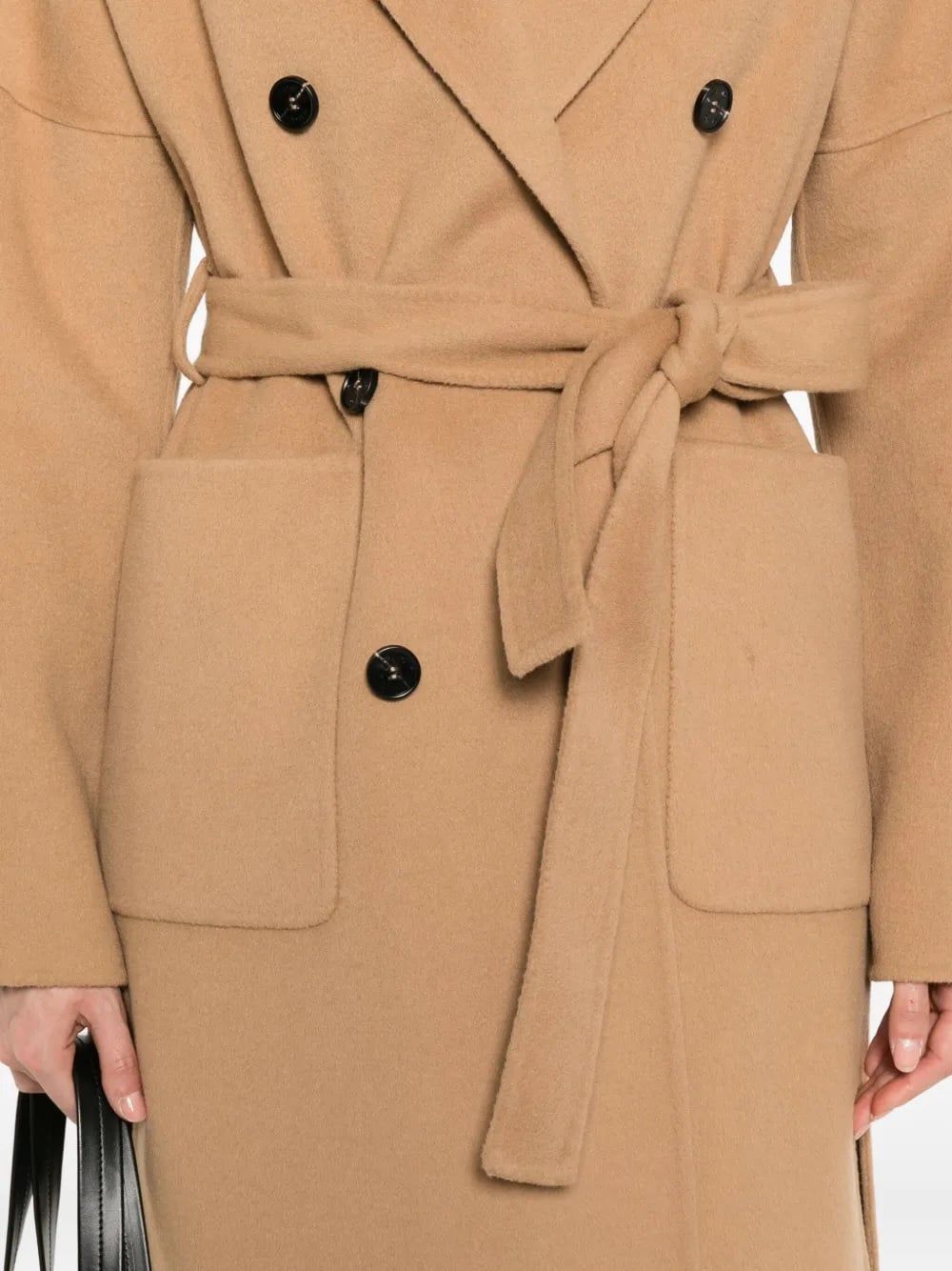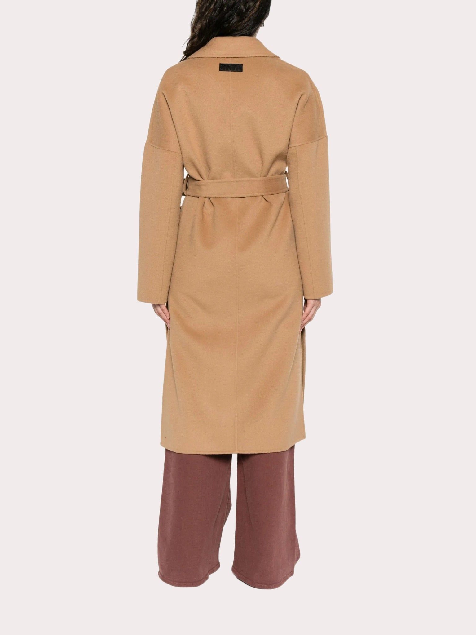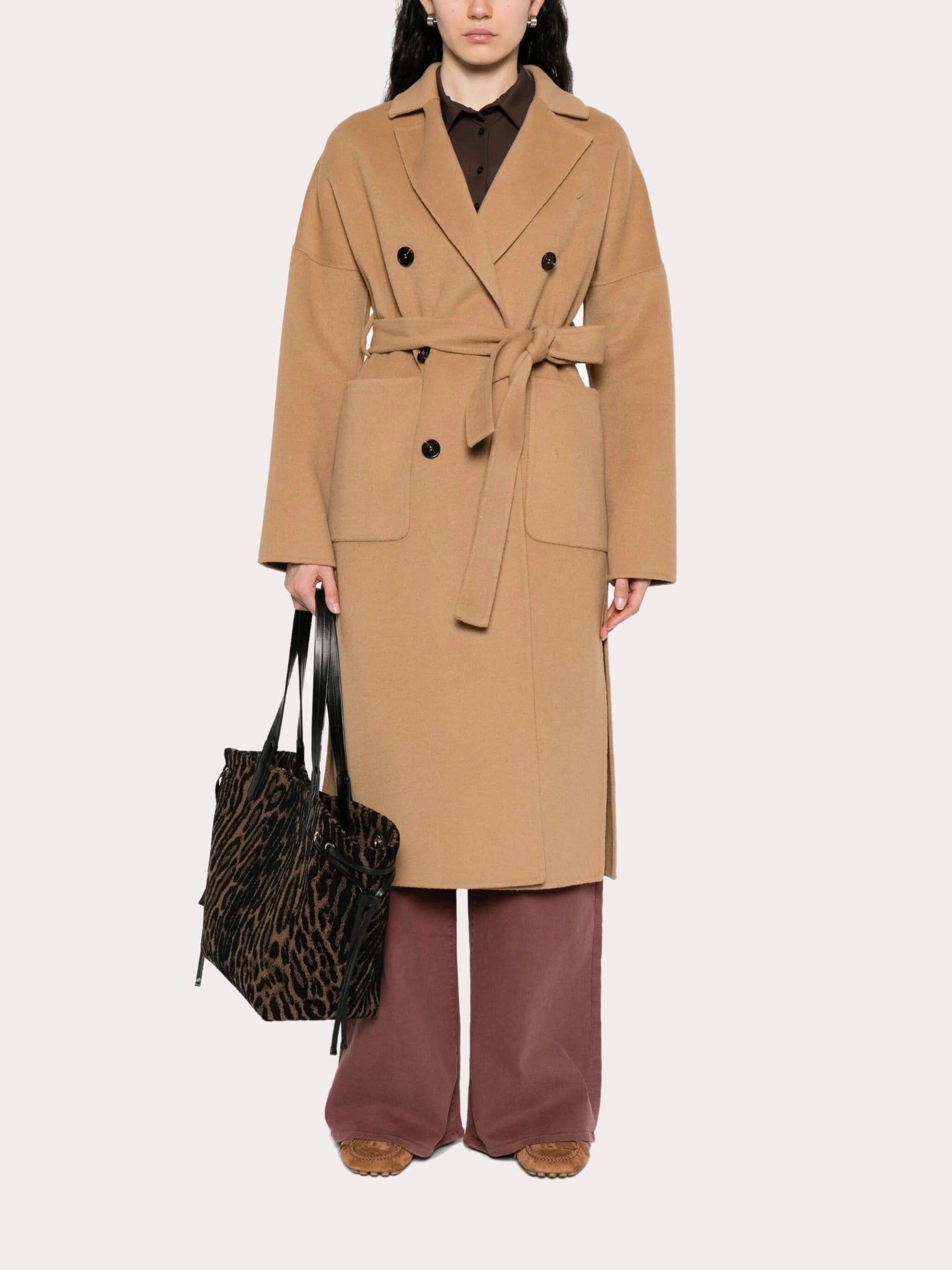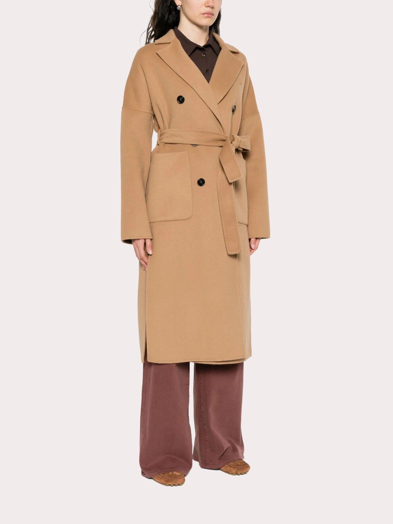 Áo choàng nữ dài tay cổ bẻ kiểu vest màu nâu, trước có 2 túi, cài 4 khuy và đính 2 khuy trang trí, có đai kèm theo