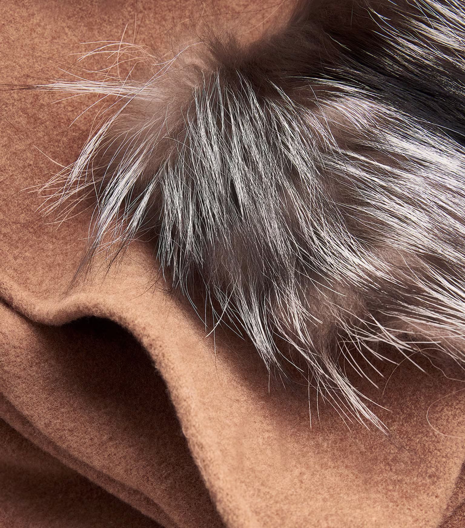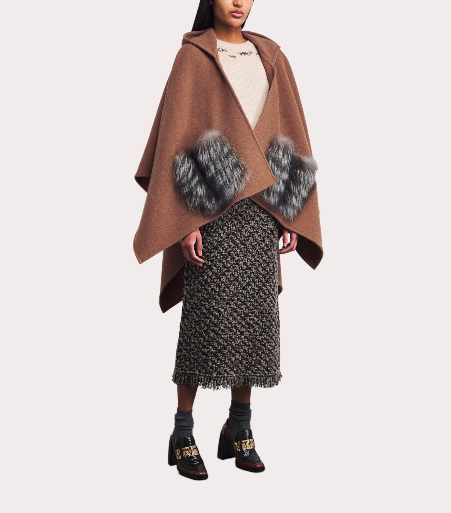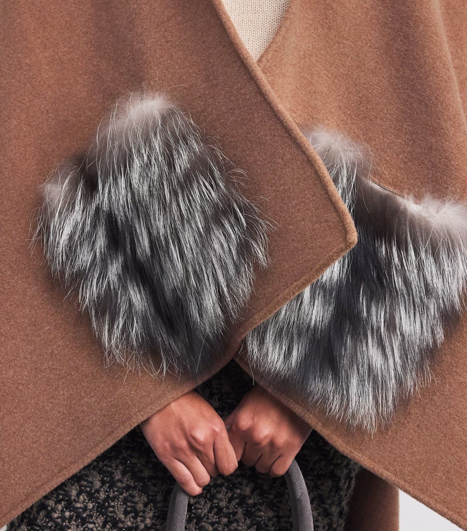 Áo khoác nữ chất dạ màu ghi dáng cánh dơi, trước có 2 túi, túi pha lông màu đen trắng