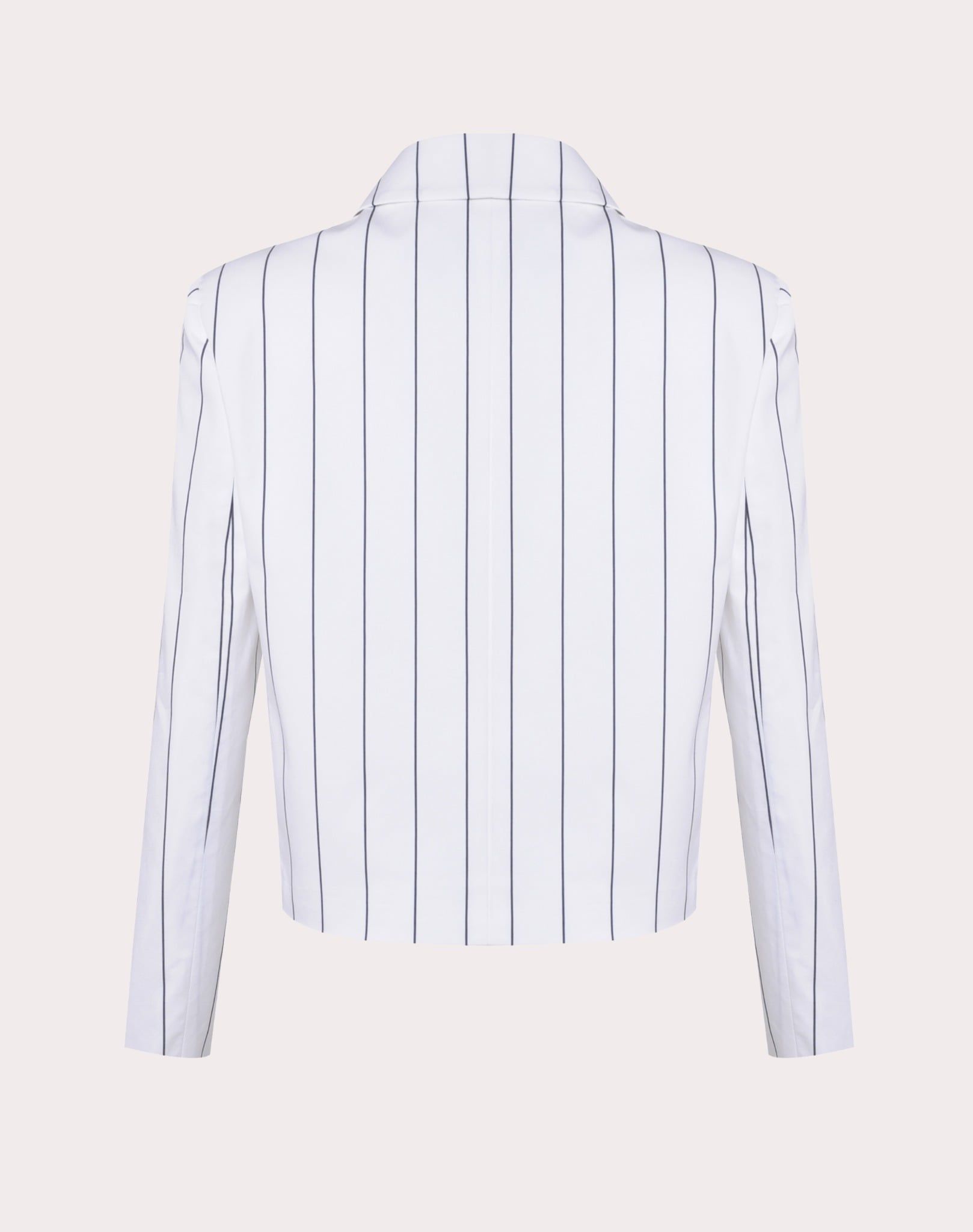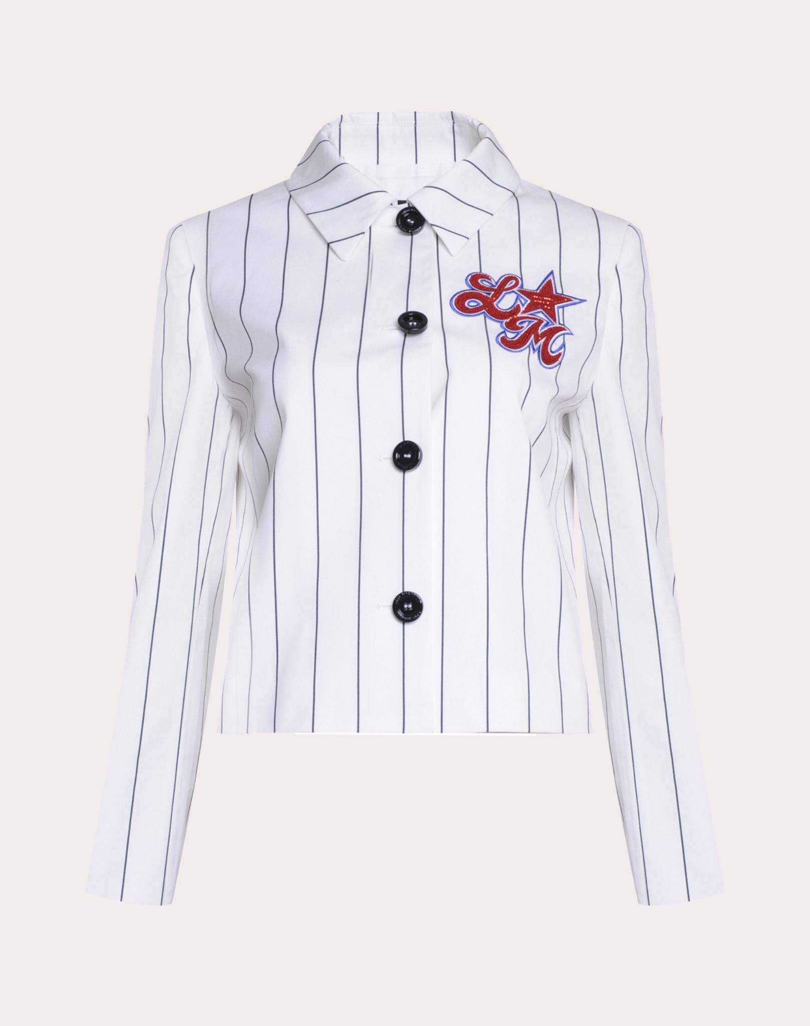 Áo khoác nữ cổ bẻ cài khuy màu trắng bẻ đen ngực xếp cườm màu đỏ hình ngôi sao và chữ LM