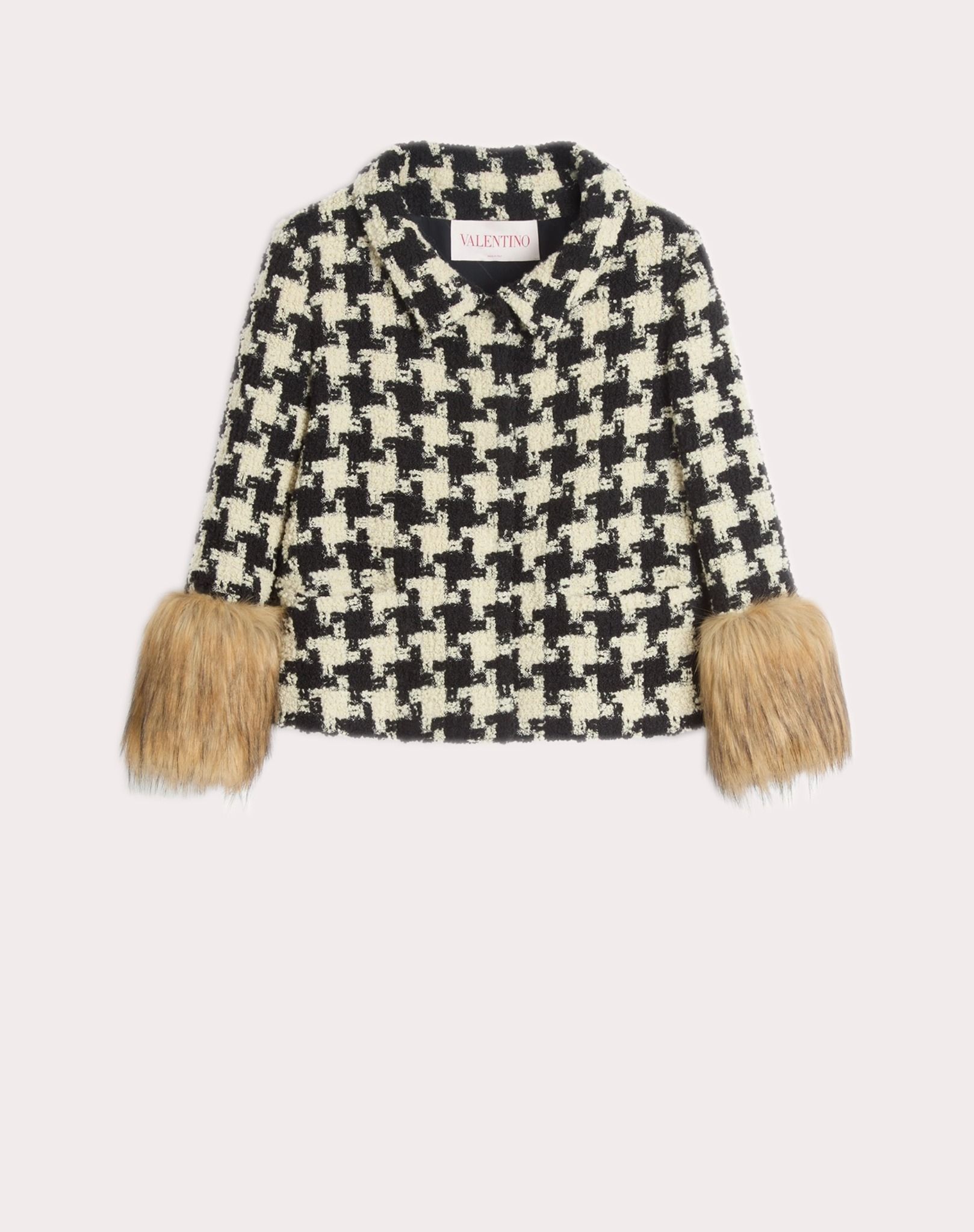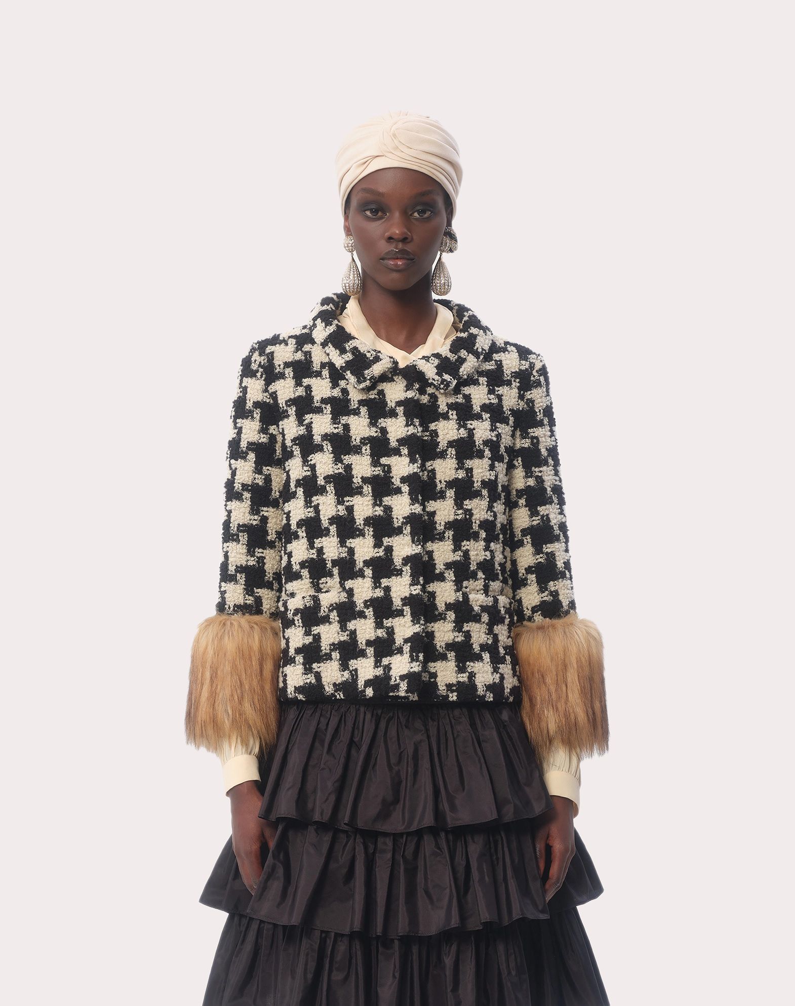 Áo khoác nữ chất dạ kẻ caro đen trắng, có hai túi,cổ tay pha lông nâu