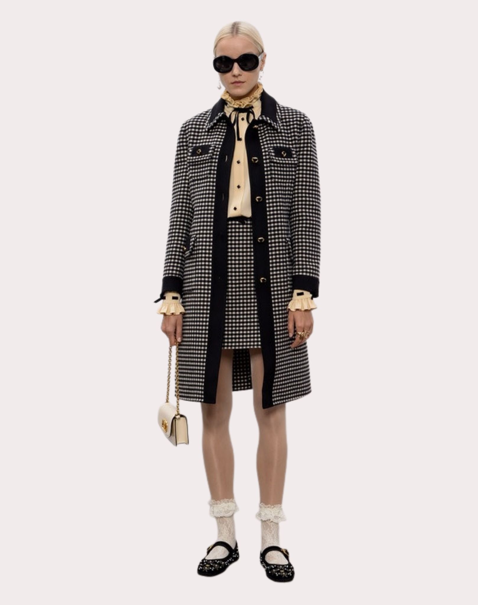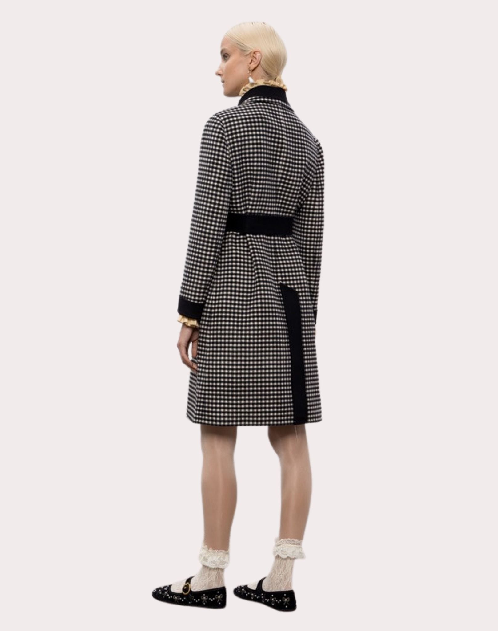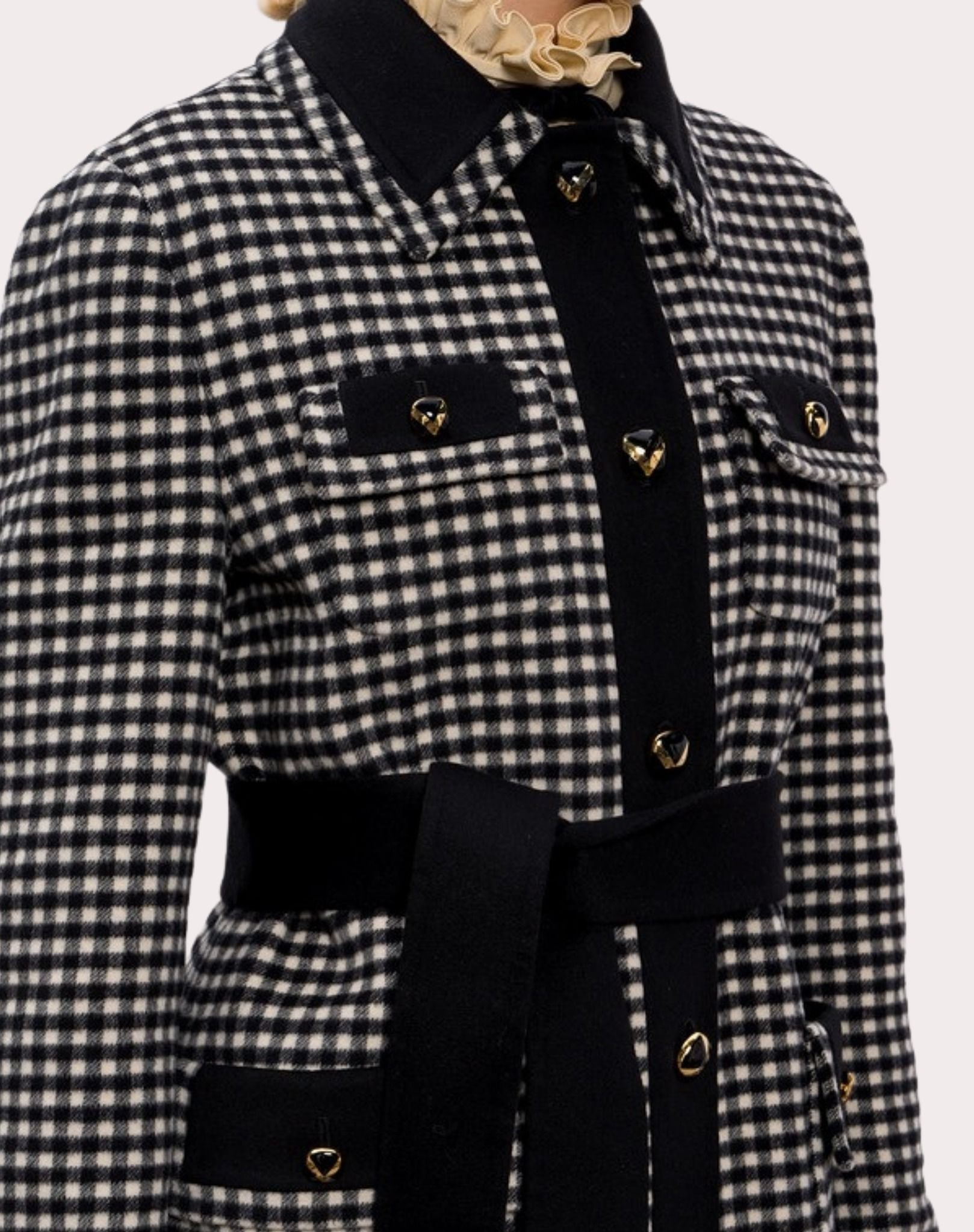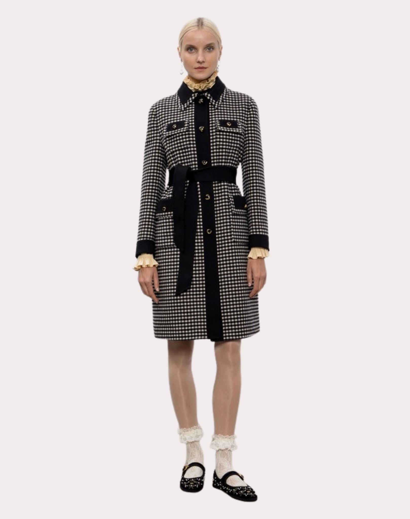 ÁO KHOÁC NỮ DÀI TAY DÁNG DÀI KẺ KARO NHỎ TRẮNG ĐEN , VIỀN CỔ + TAY + NẮP TÚI MẦU ĐEN , CỔ ĐỨC TO CÀI KHUY TRÒN PHÍA TRƯỚC , CÓ 4 TÚI , CÓ ĐAI RỜI
