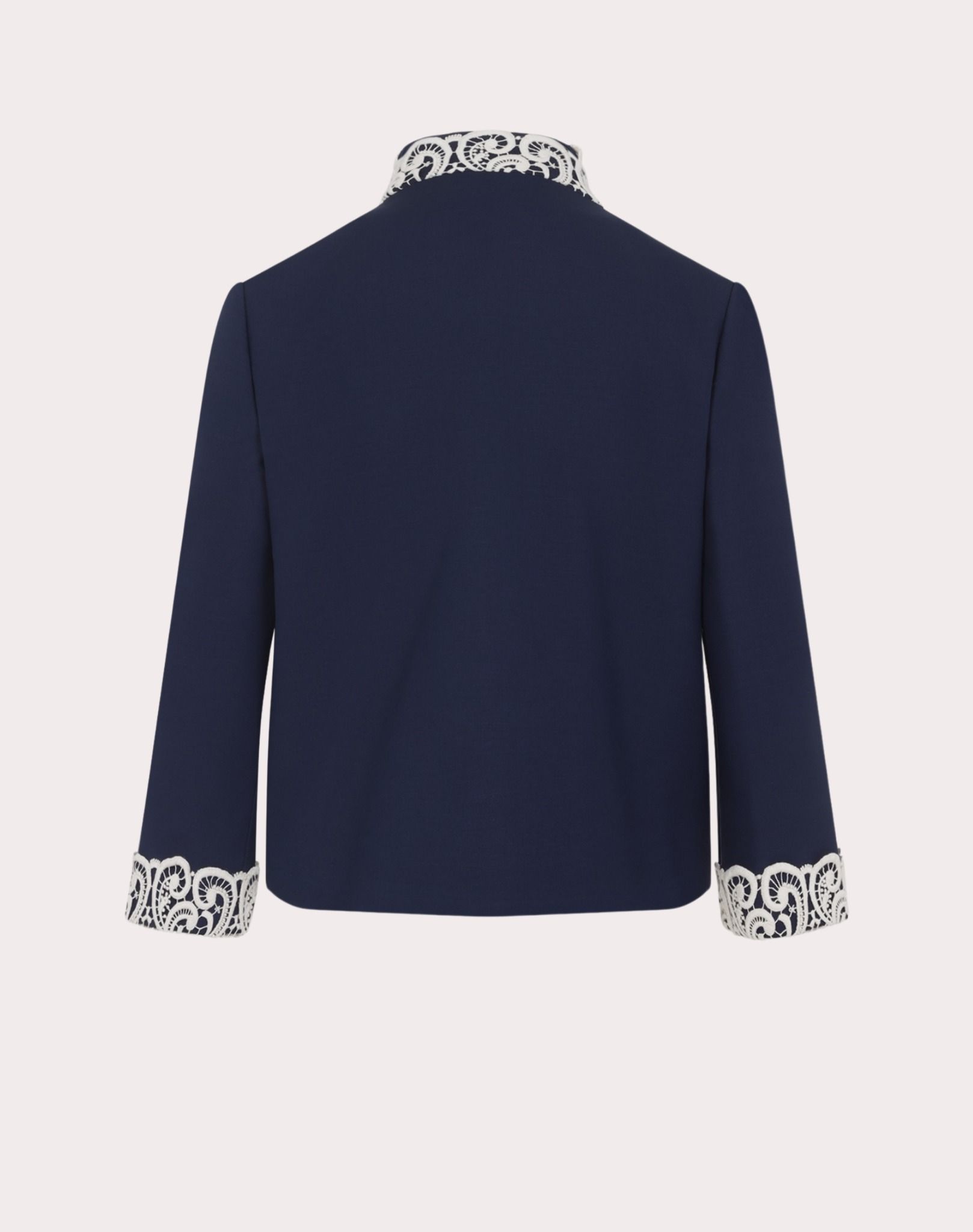 Áo khoác nữ màu xanh tím than, cài 3 khuy to màu vàng đính đá trắng, trước có 2 túi, viền cổ và cổ tay thêu ren hoa trắng