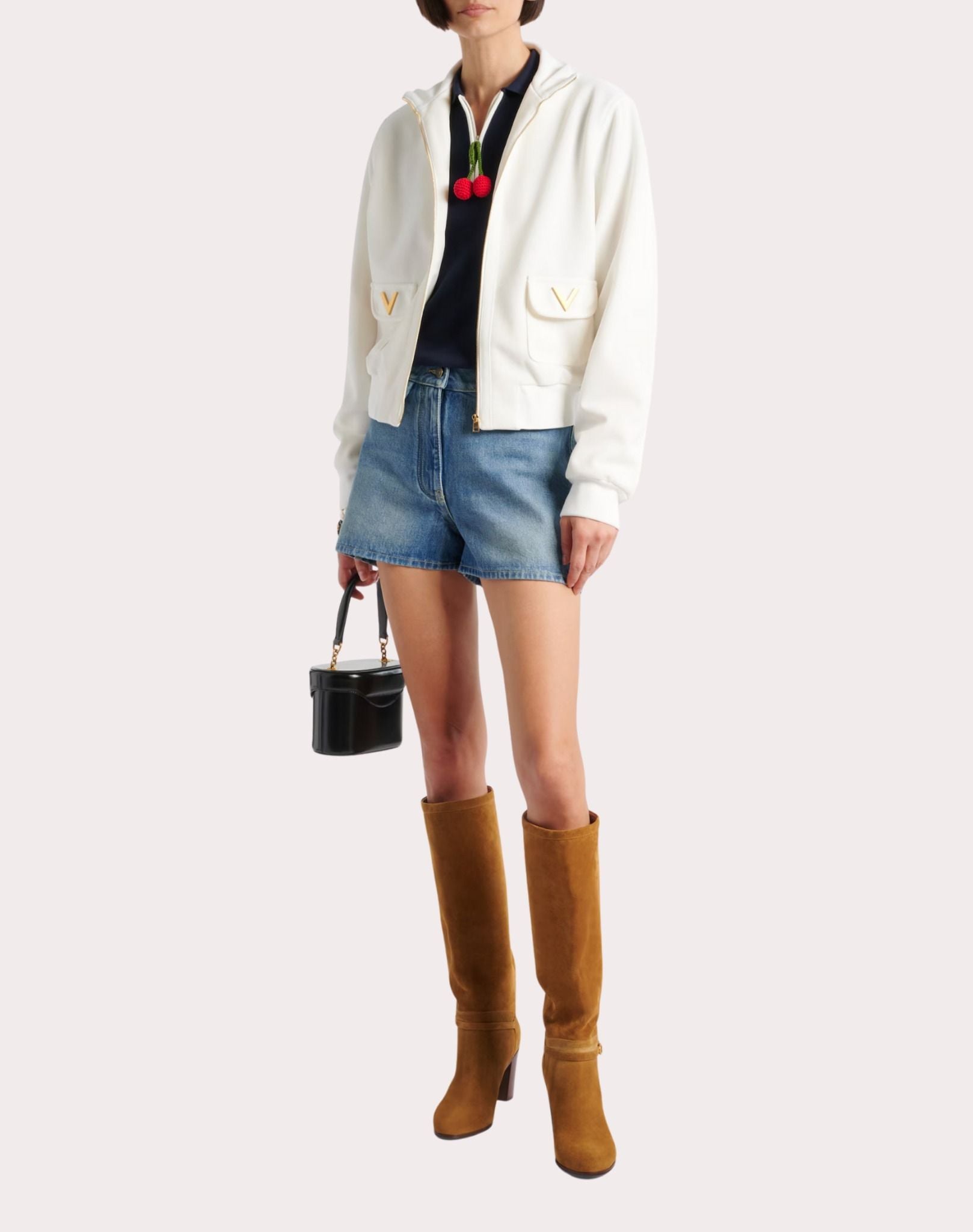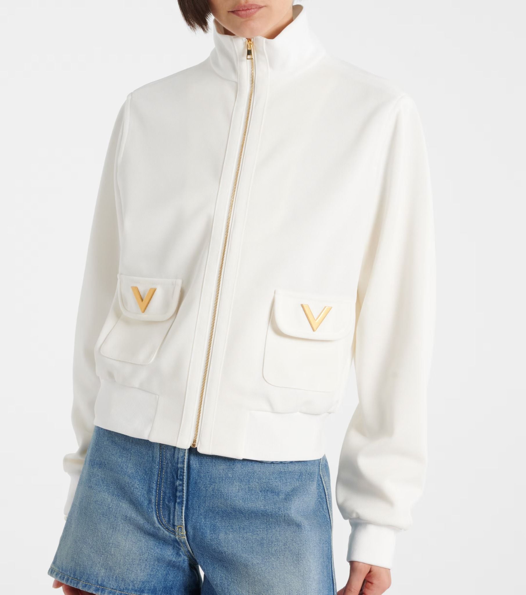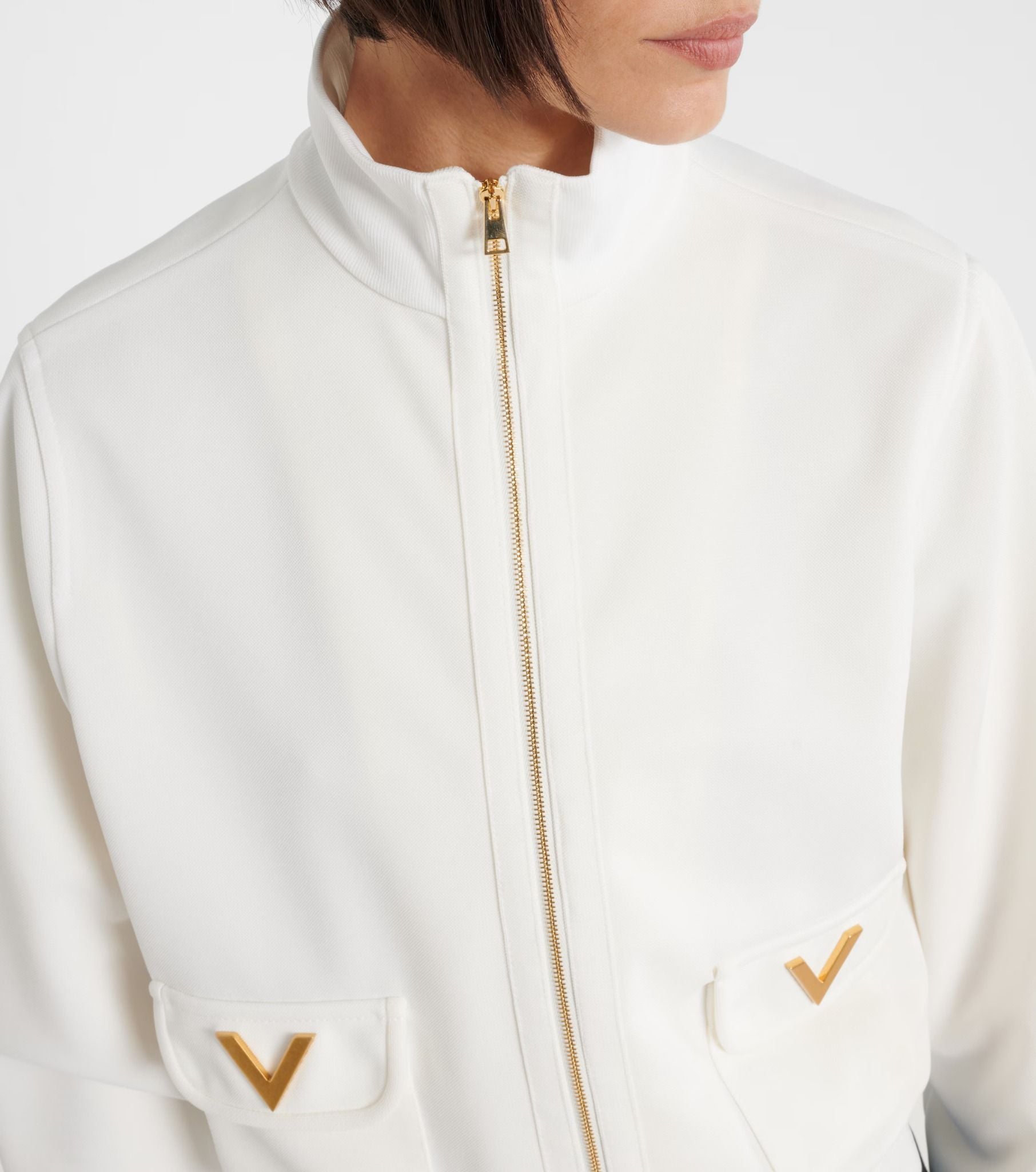 Áo khoác nữ dài tay kéo khóa màu trắng, trước có 2 túi nắp, nắp túi gắn logo chữ V màu vàng, cổ + cổ tay + gấu bo chun