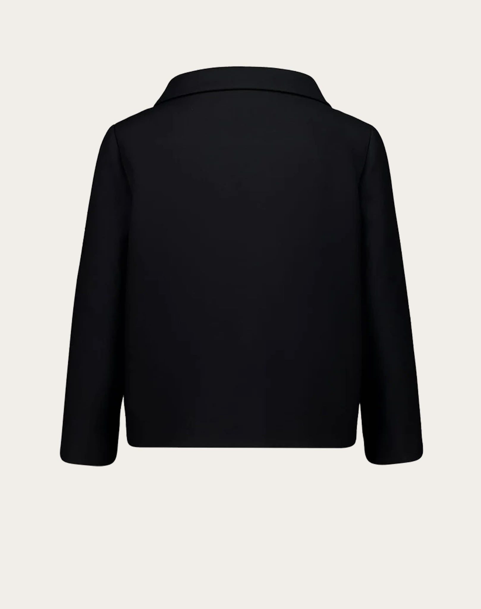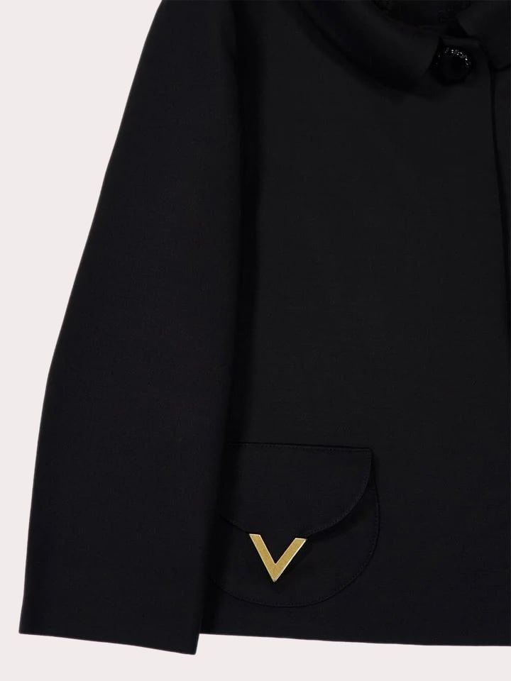 Áo khoác nữ màu đen cổ đính 1 khuy, trước có 2 túi nắp, nắp túi gắn logo chữ V màu vàng