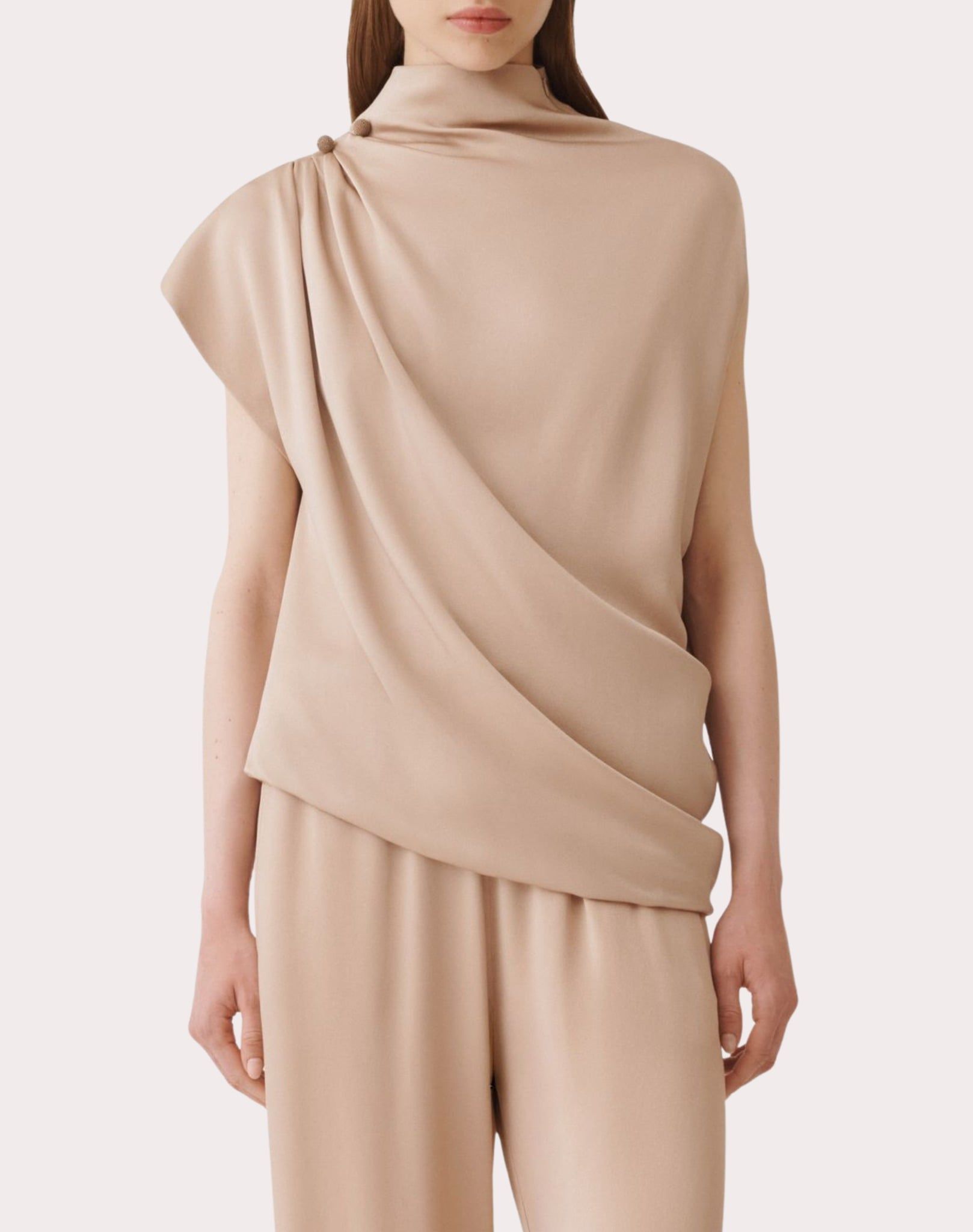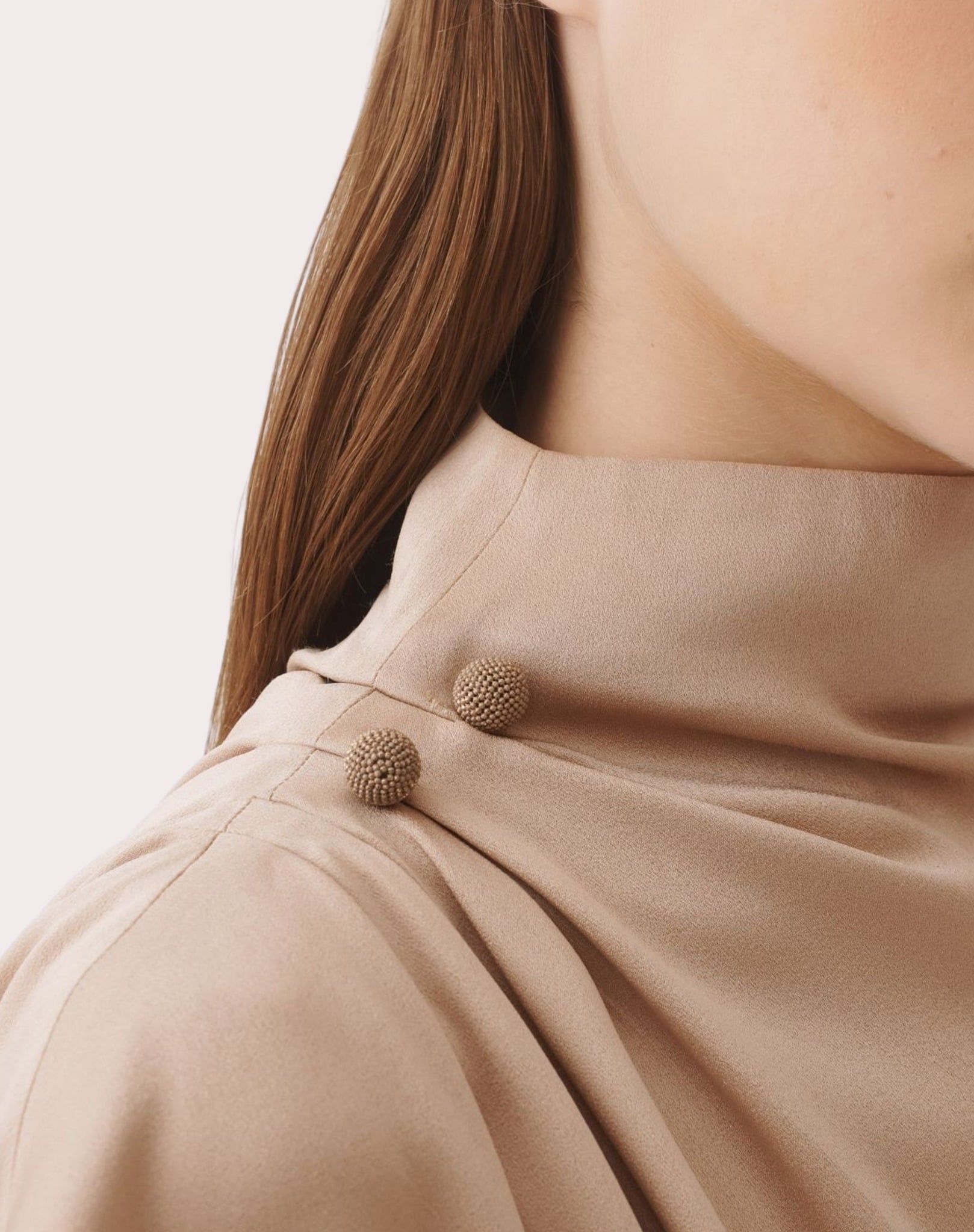 Áo kiểu nữ màu nâu, kéo khóa cổ trái, cổ phải rúm cài khóa kim loại