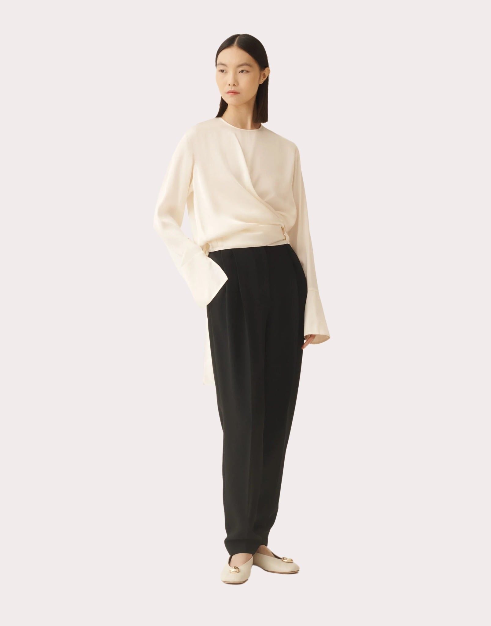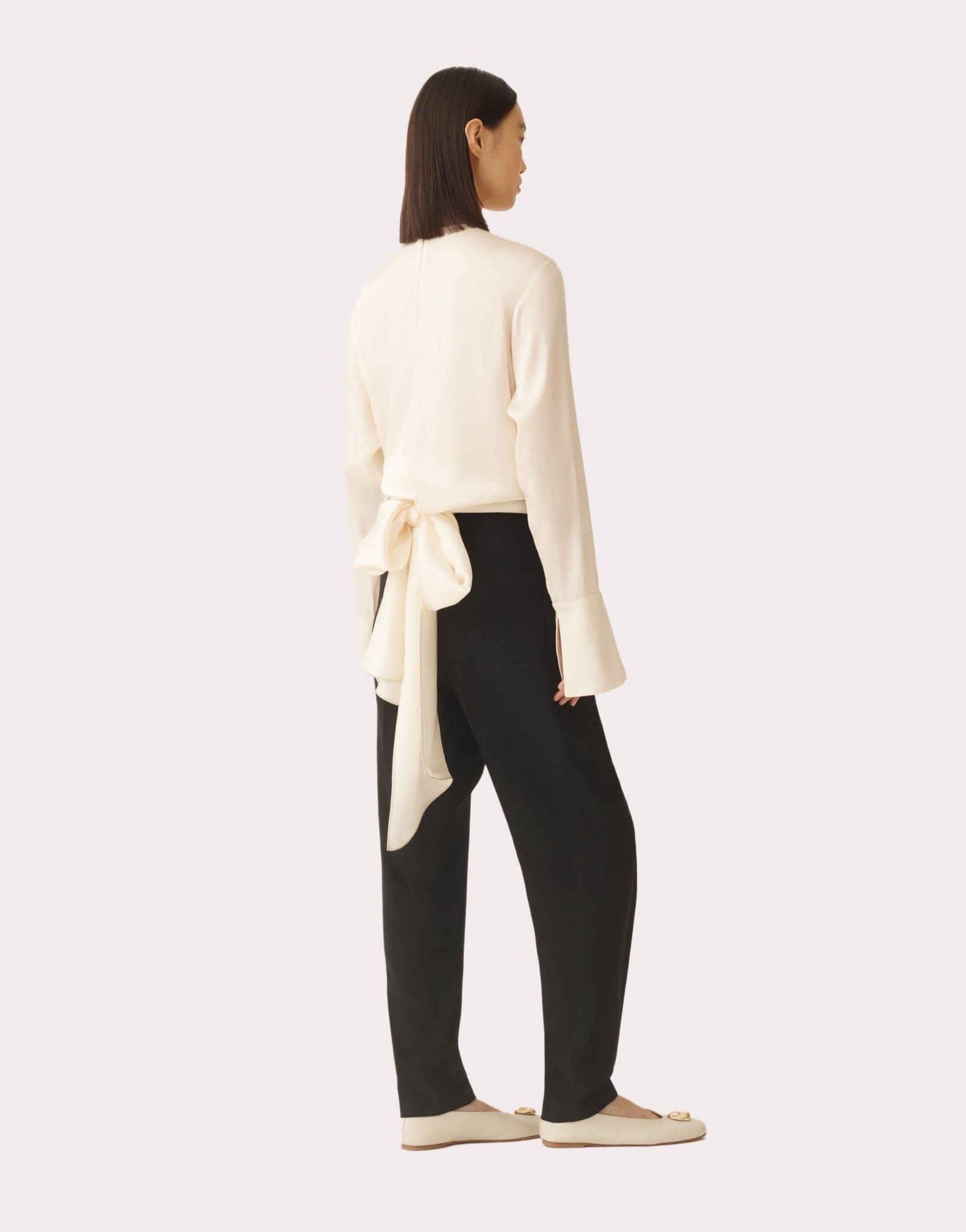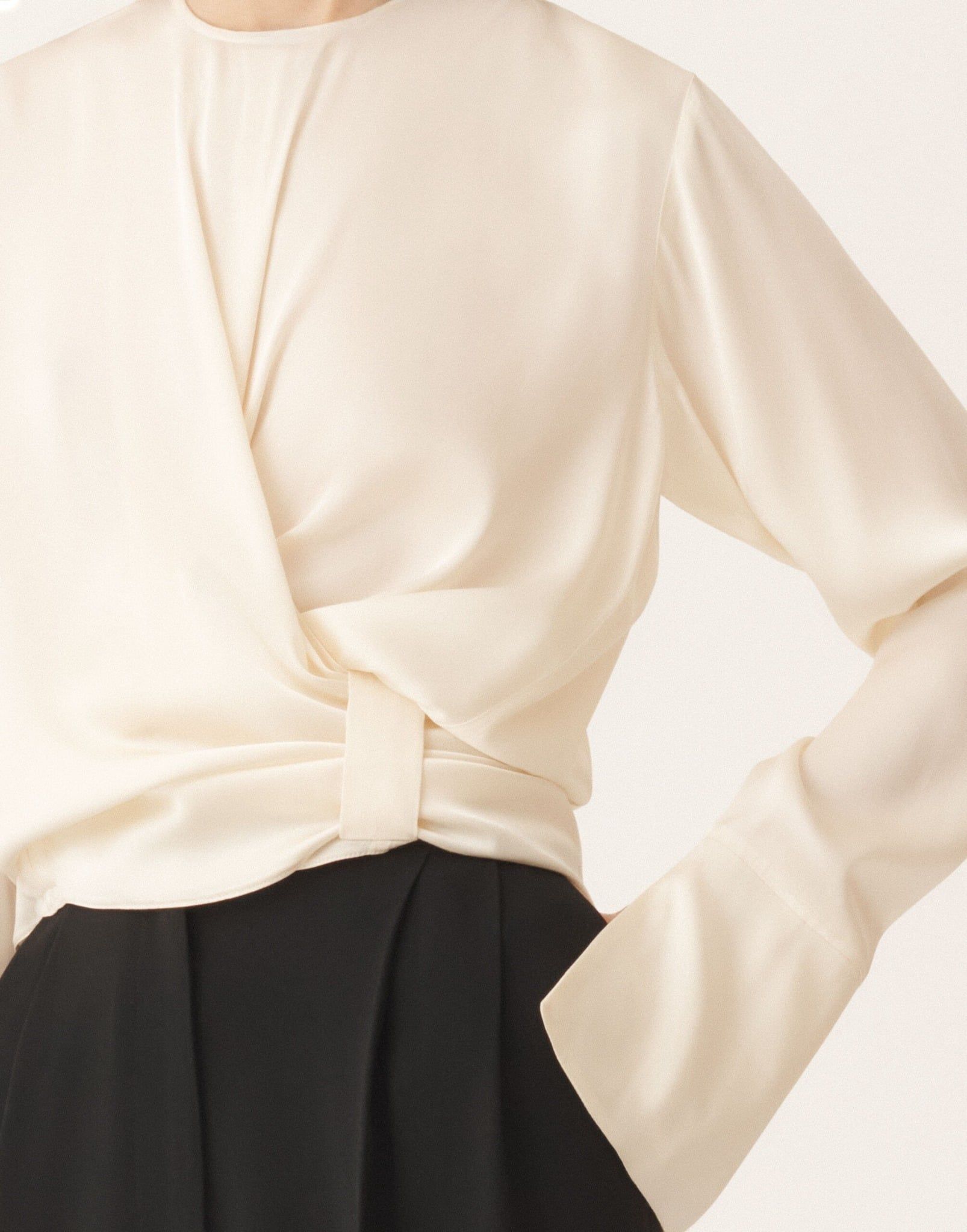 Áo kiểu nữ dày tay cổ tròn màu trắng ngà chất lụa, gâu may ghép 2 dải lụa to cùng màu