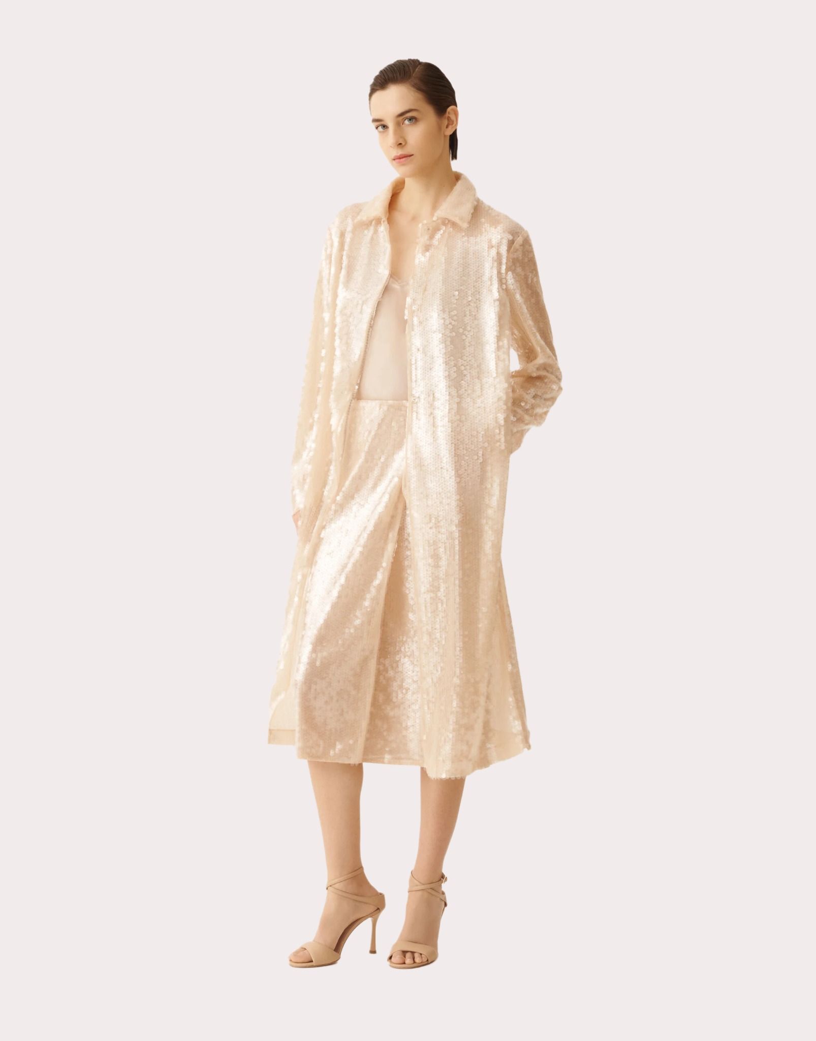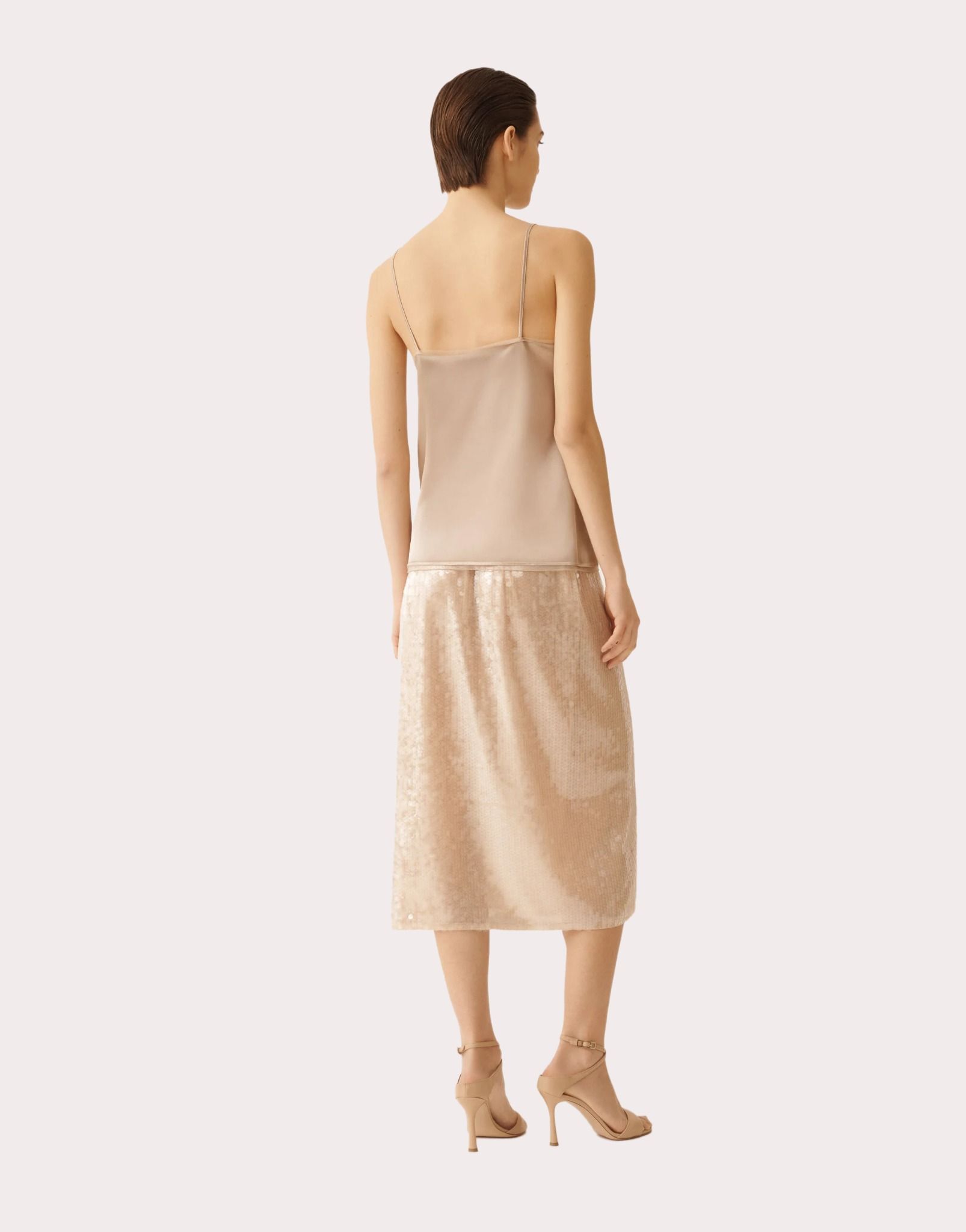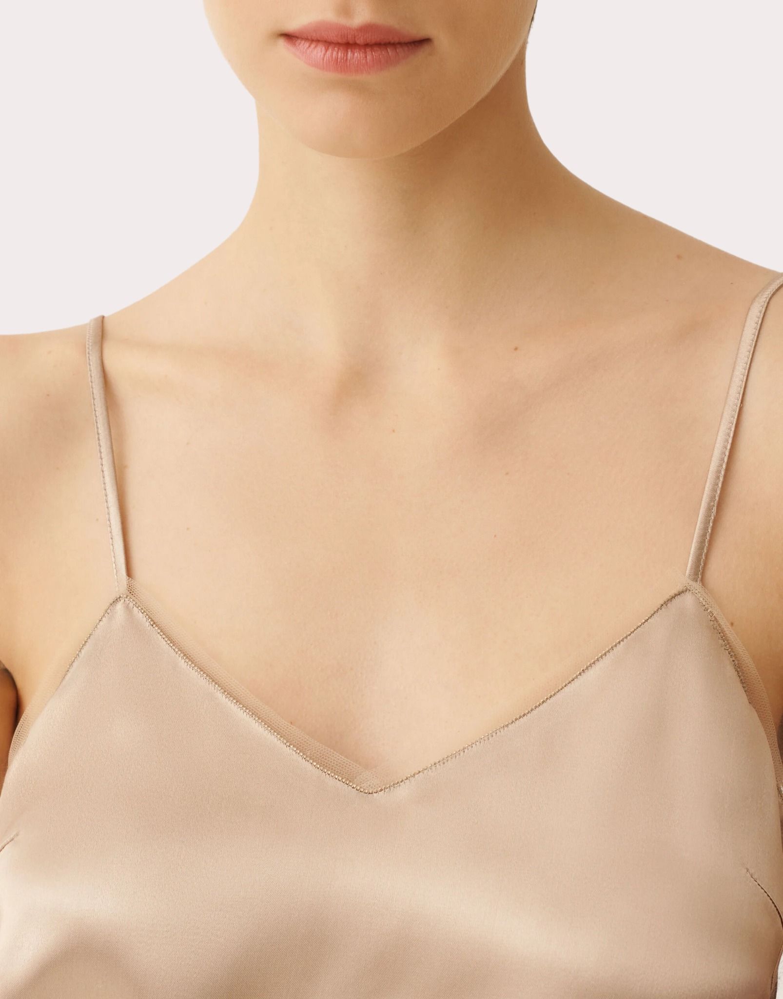 Áo 2 dây nữ màu nâu bóng, cổ và gâu pha ren và gắn cườm cùng màu