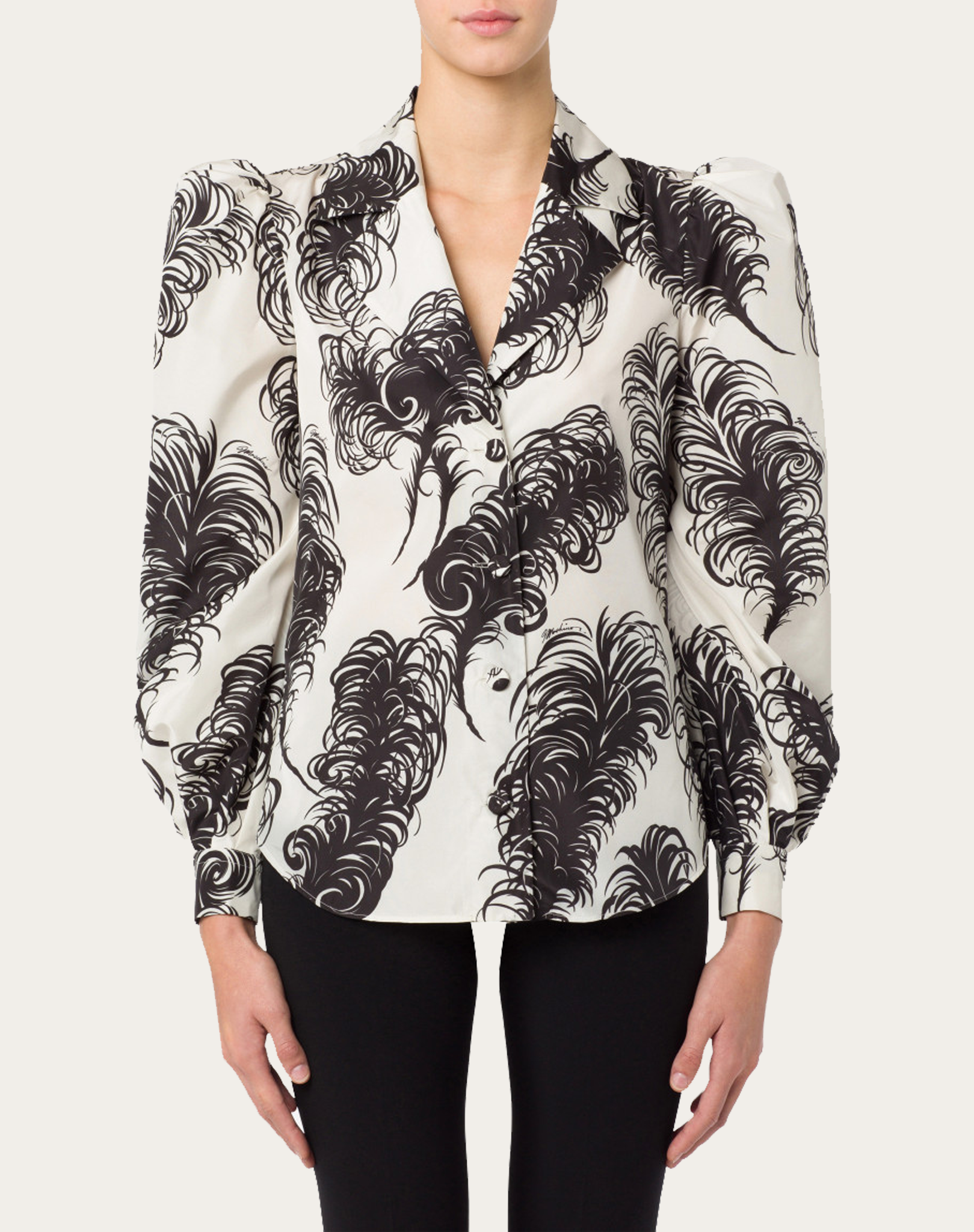 Áo kiểu tay phồng nền trắng họa tiết lông chim, thân trước cổ bẻ cài khuy