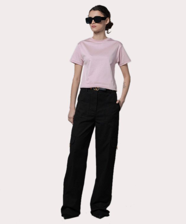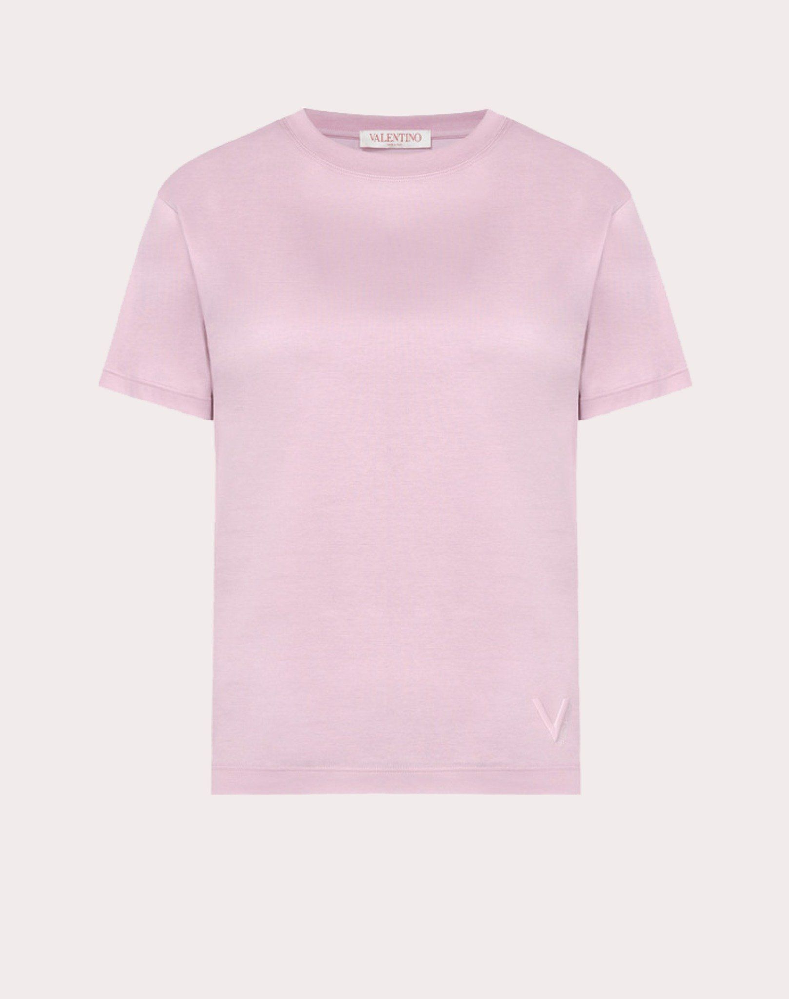 Áo phông nữ cộc tay màu hồng gấu thêu logo V cùng màu