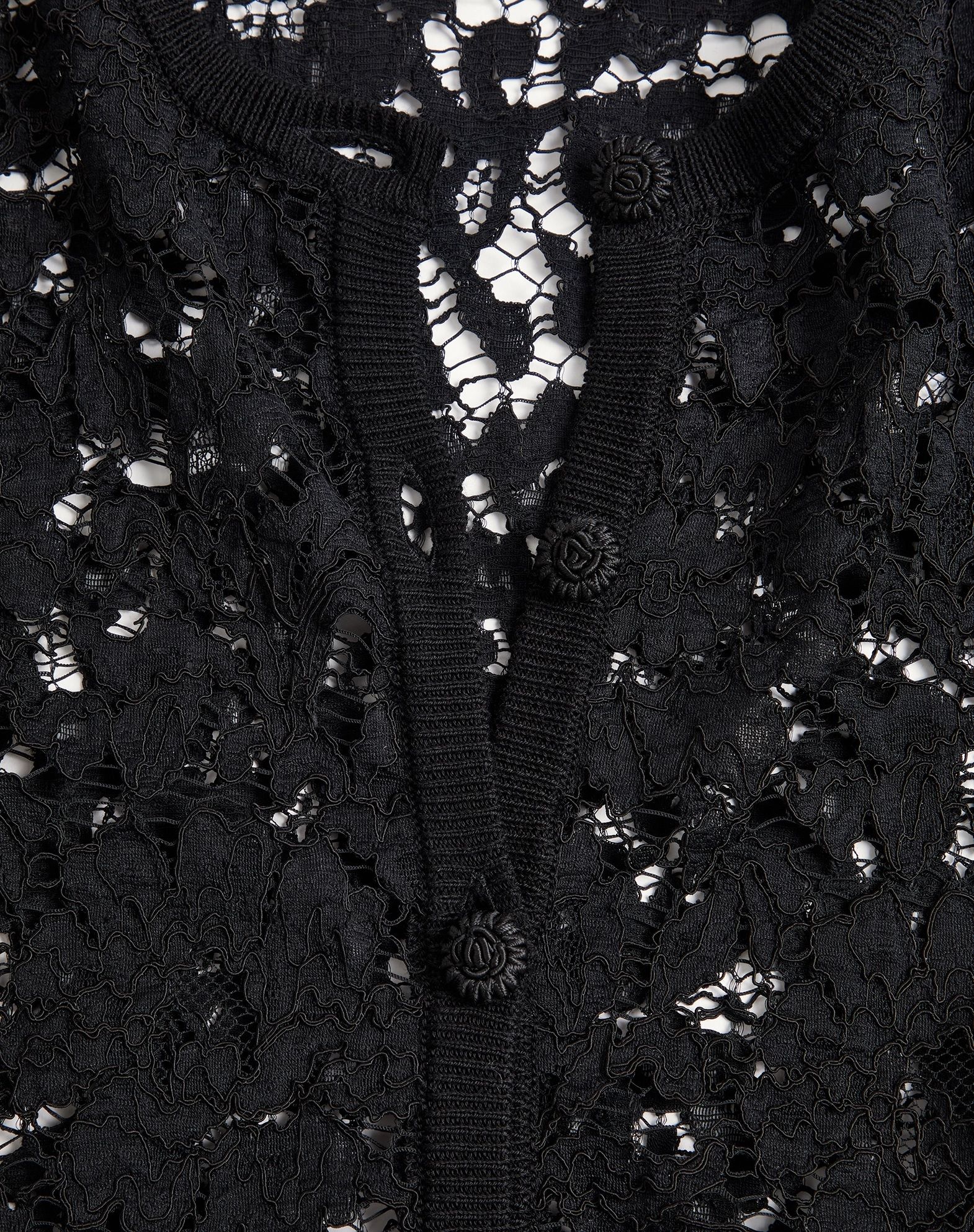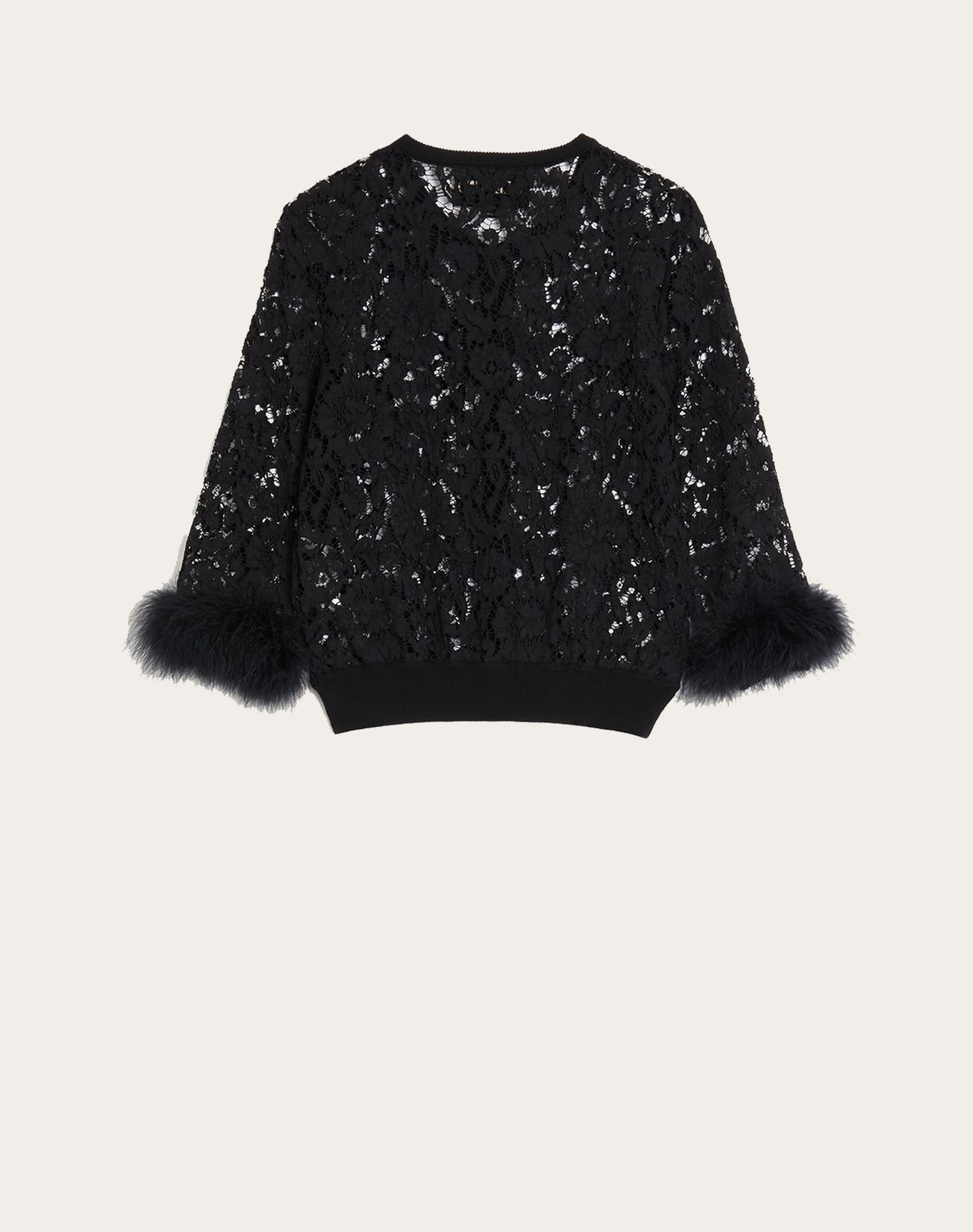 Áo nữ dài tay chất ren hoa màu đen, viền pha sợi cùng màu, cổ tay pha lông cùng màu