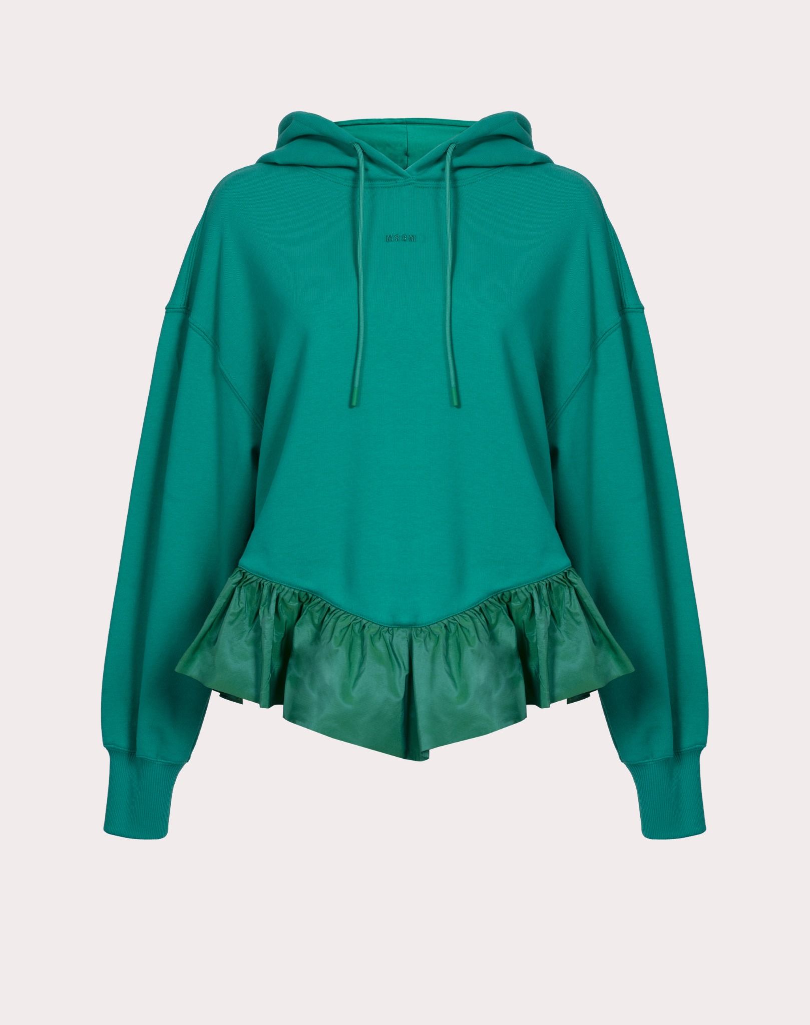 Áo hoodi nữ màu xanh lá cây, cổ tay bo chun, gấu may ghép bèo, ngực thêu chữ MSGM cùng màu