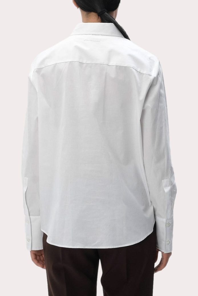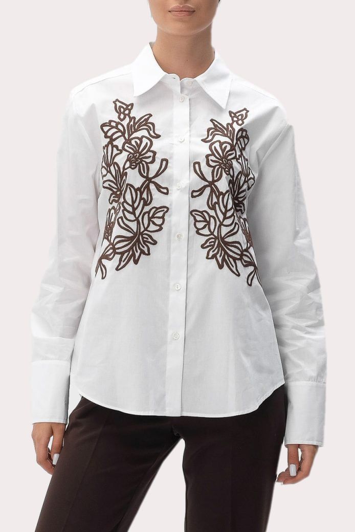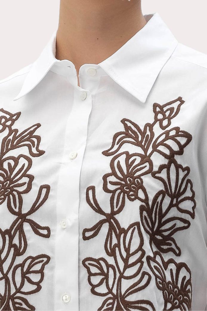 Áo sơ mi nữ dài tay cổ bẻ cài khuy màu trắng, 2 bên ngực thêu hoa đen
