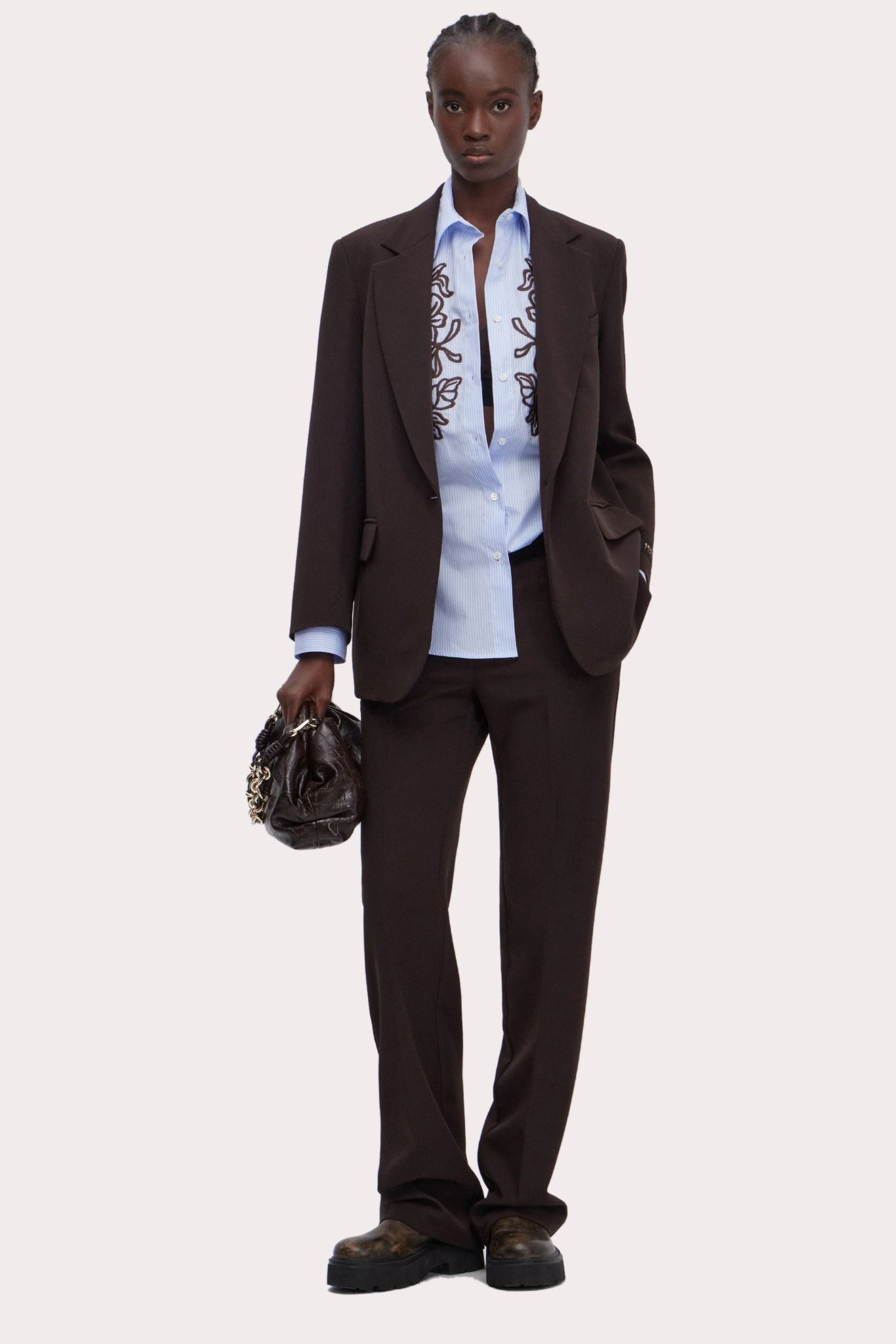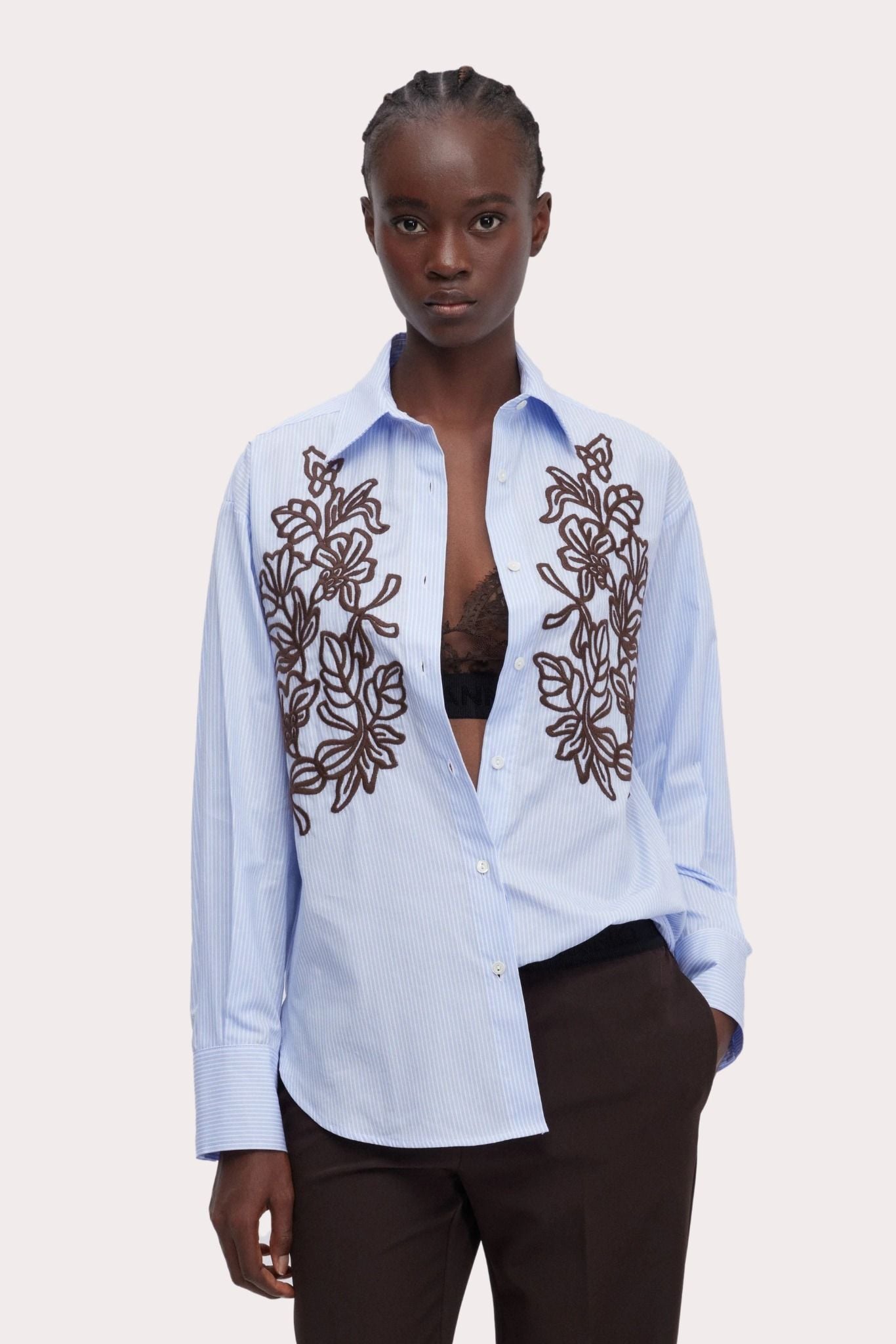 Áo sơ mi nữ dài tay cổ bẻ cài khuy kẻ xọc trắng xanh, 2 bên ngực thêu hoa đen