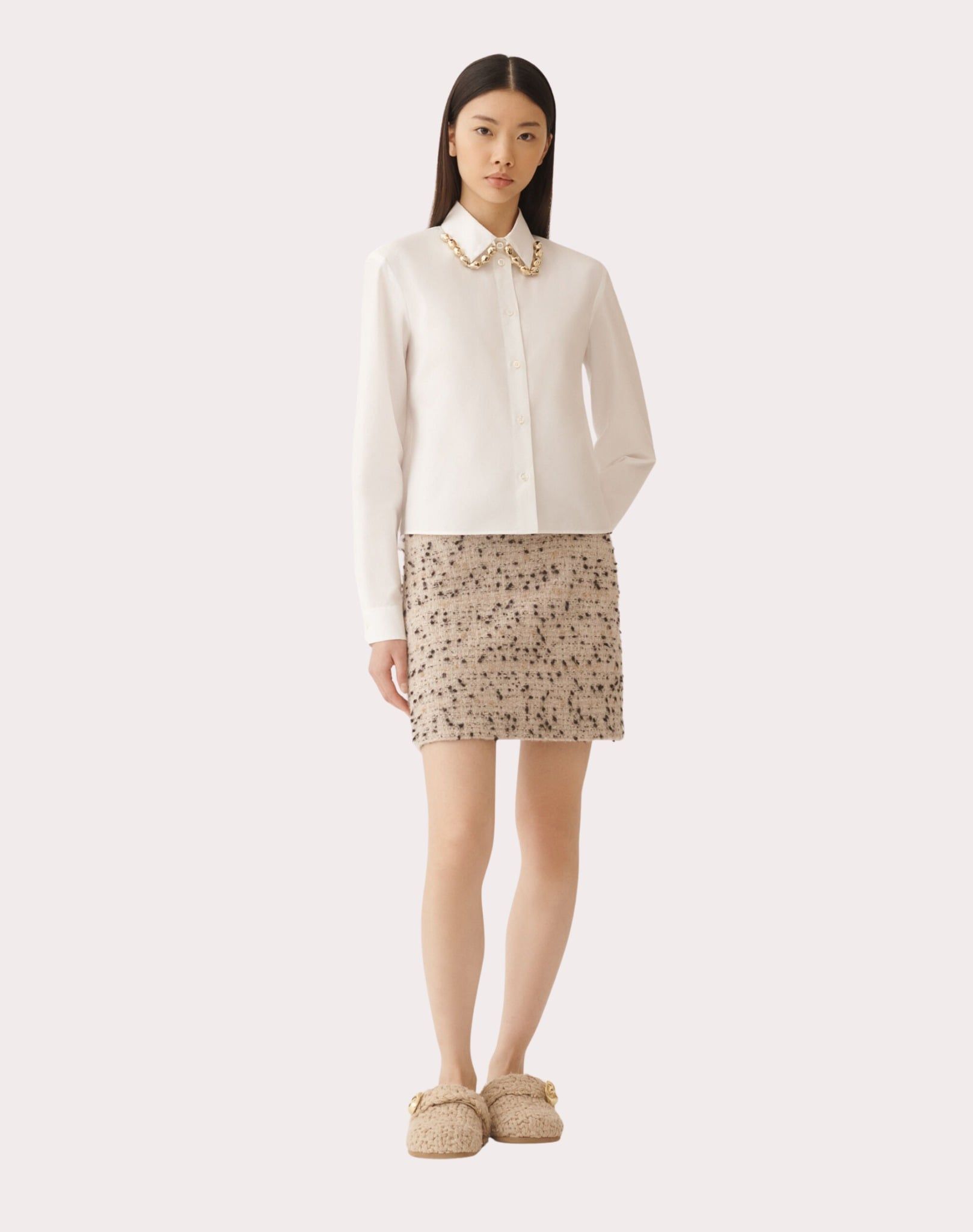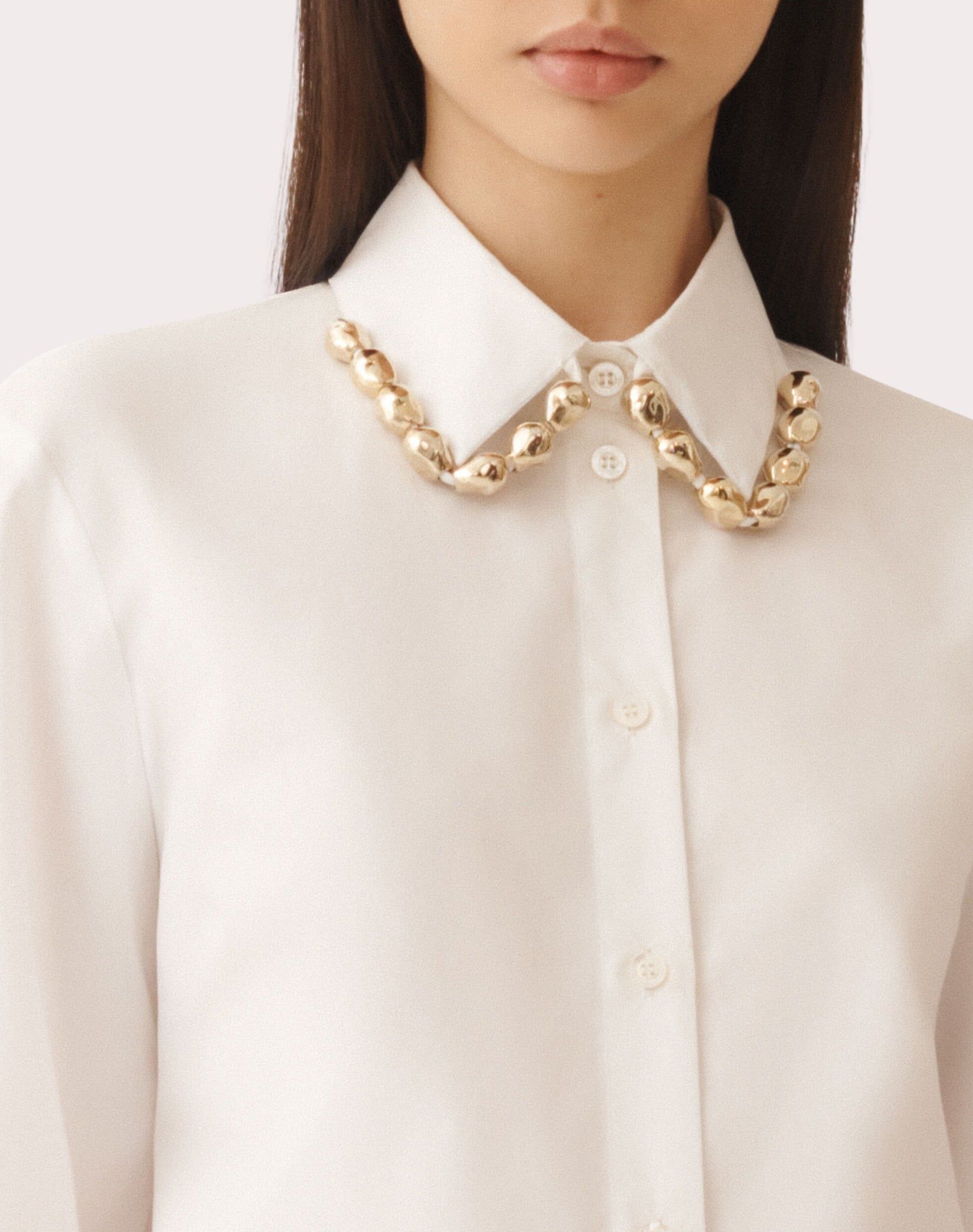 Áo sơ mi nữ dài tay cổ bẻ cài khuy màu trắng, viền cổ gắn hạt màu vàng