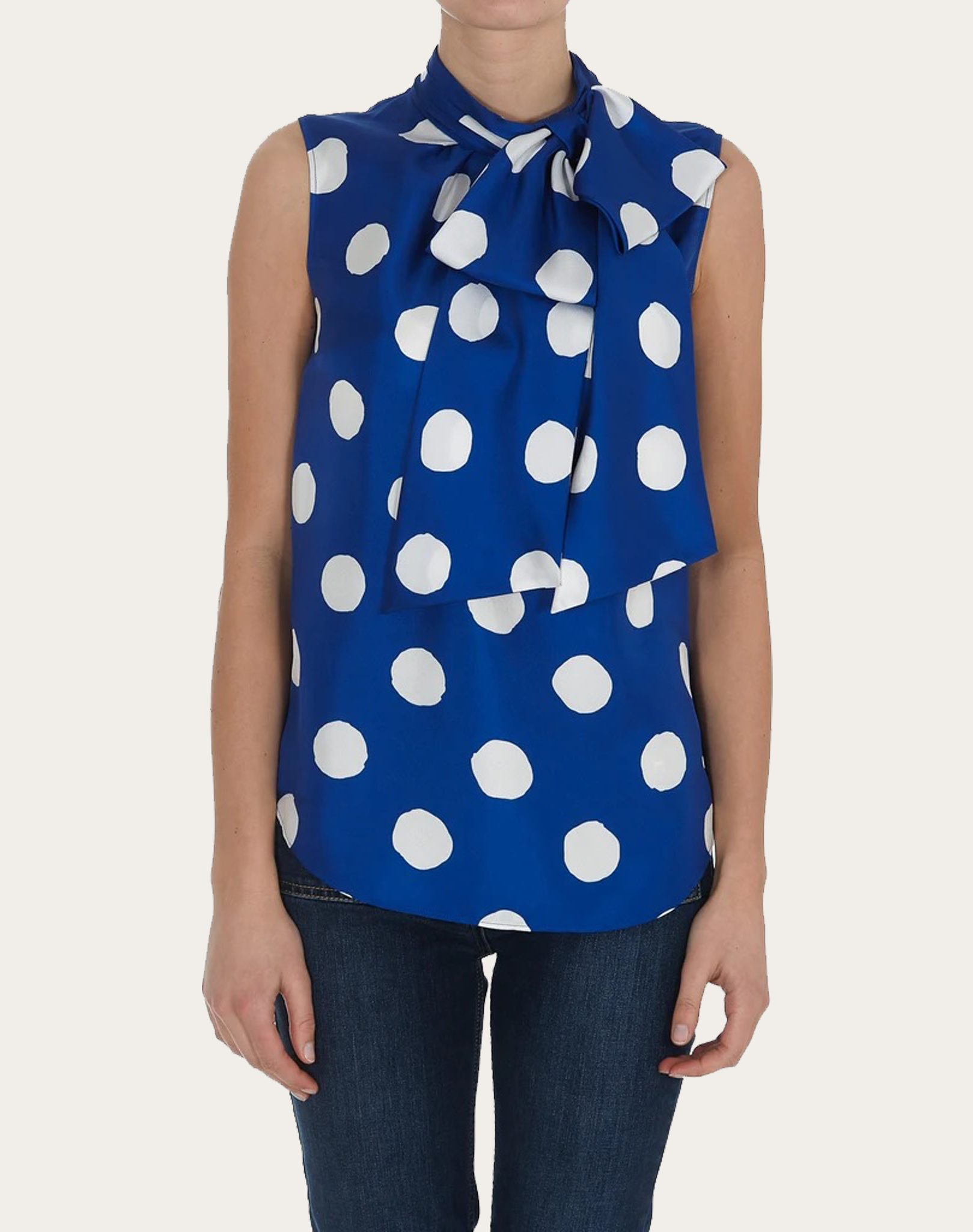 Áo sơ mi nữ chất liệu lụa nền xanh toàn thân chấm bi trắng