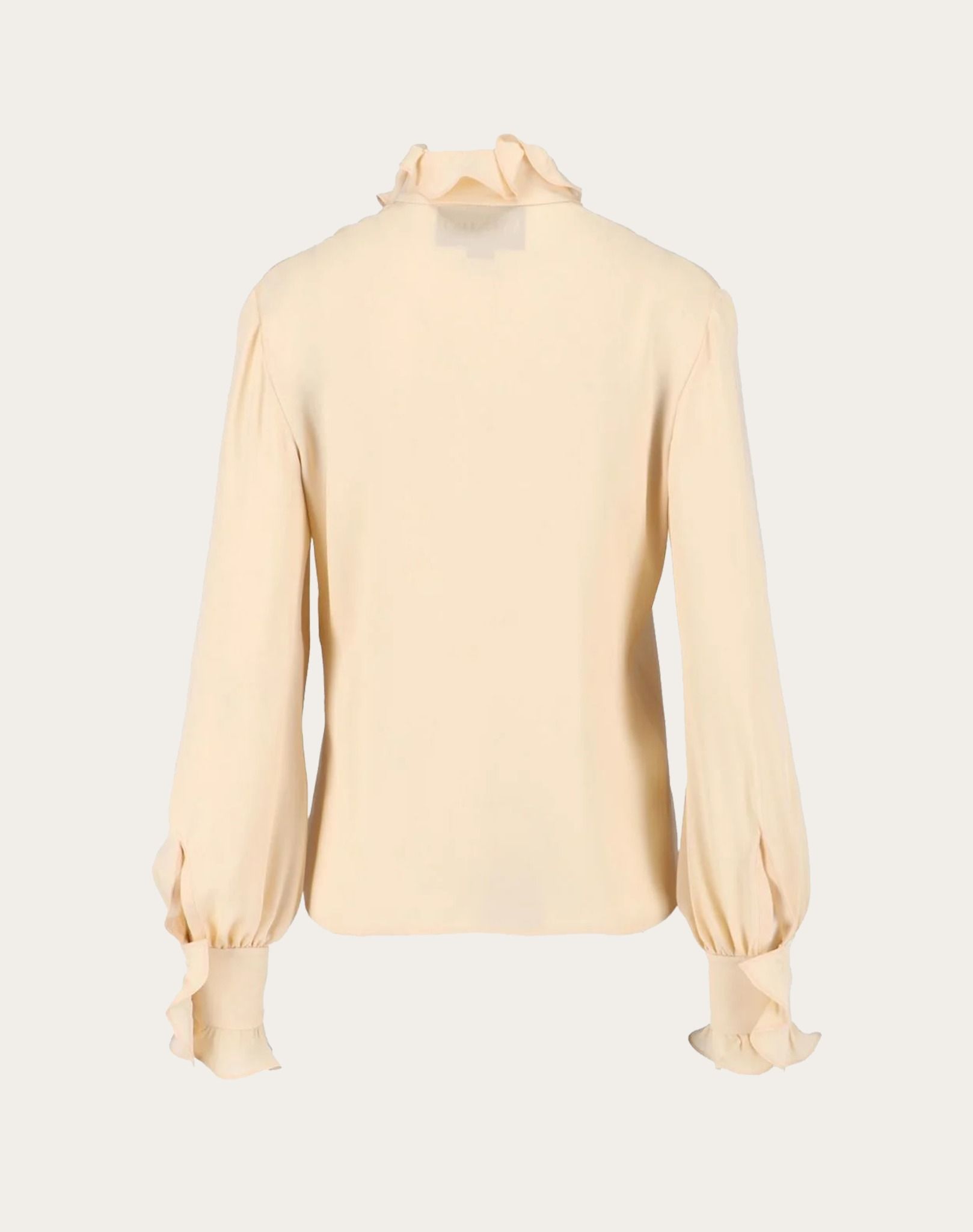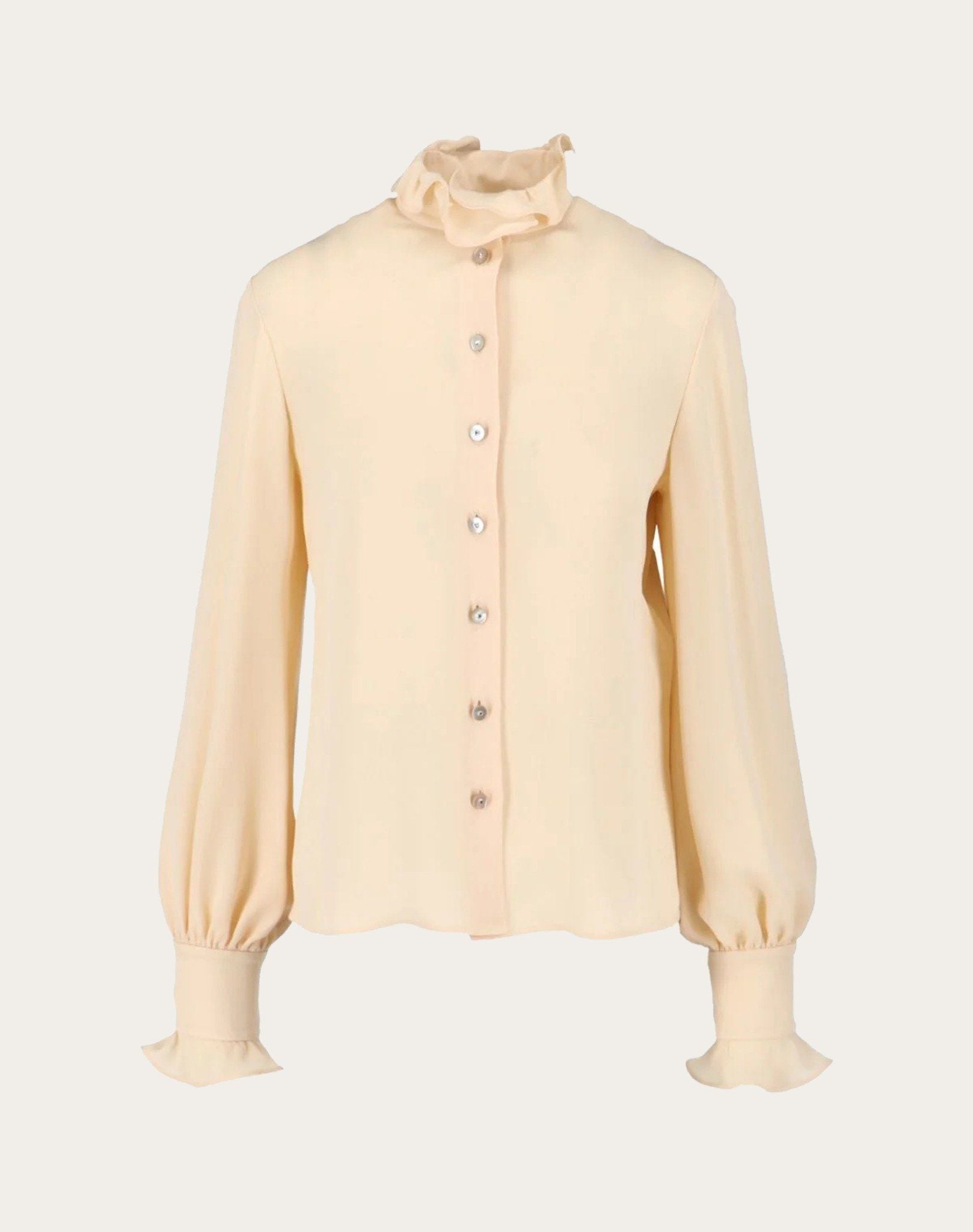 Áo sơ mi nữ dài tay màu be, cổ và cổ tay xếp bèo