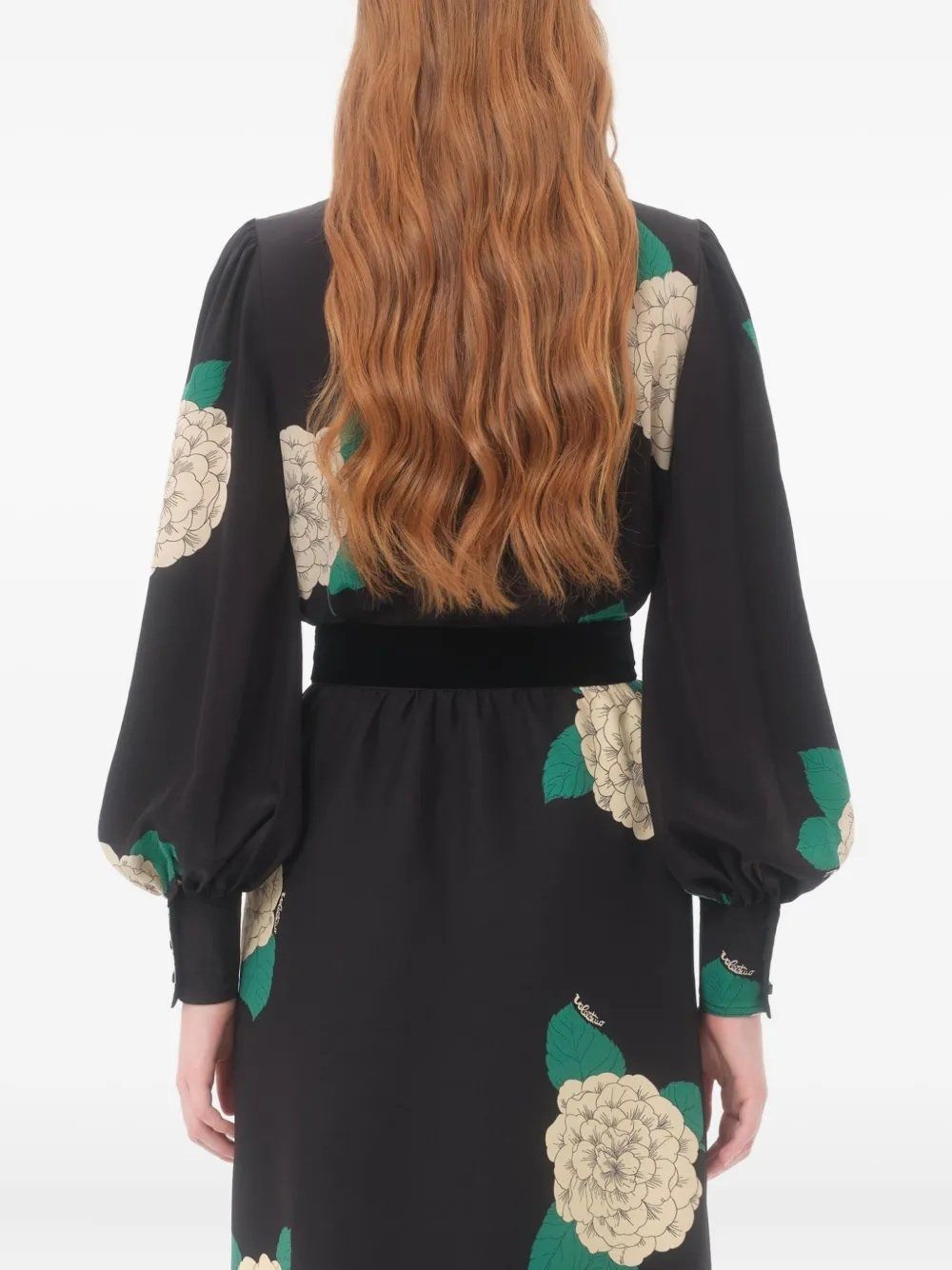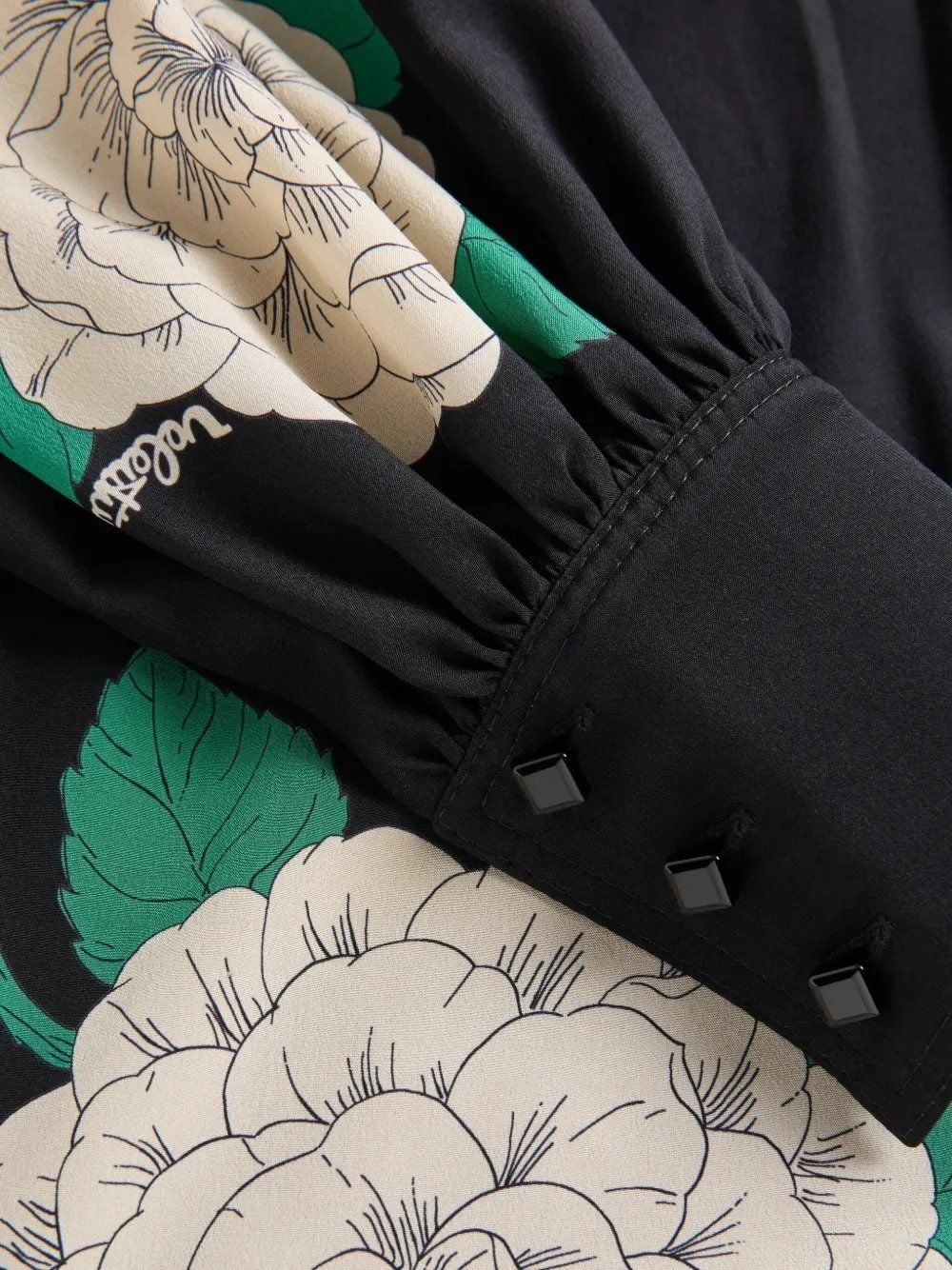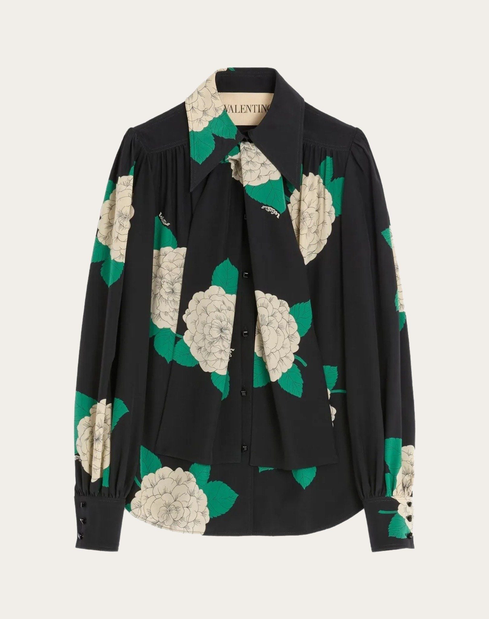 Áo sơ mi nữ dài tay cổ bẻ cài khuy màu đen toàn thân họa tiết hoa khổng tú cầu màu be lá xanh, cổ ghép đai buộc nơ