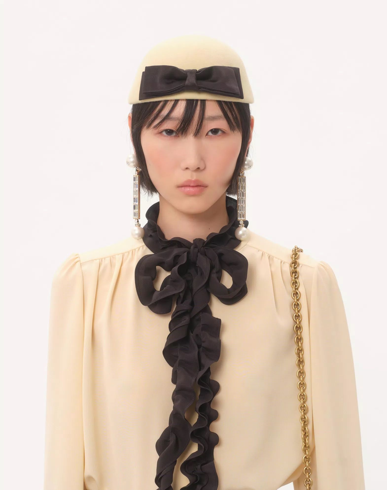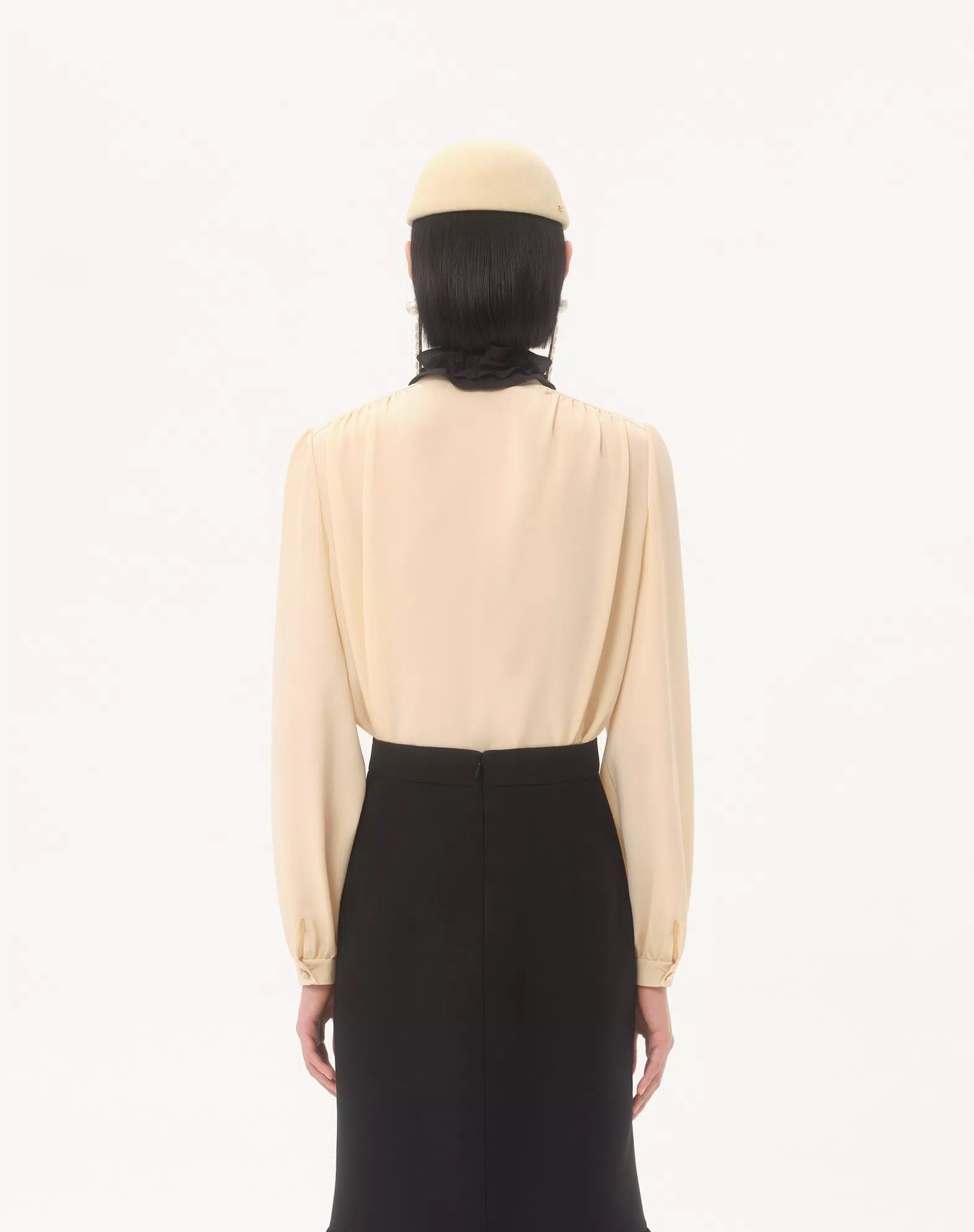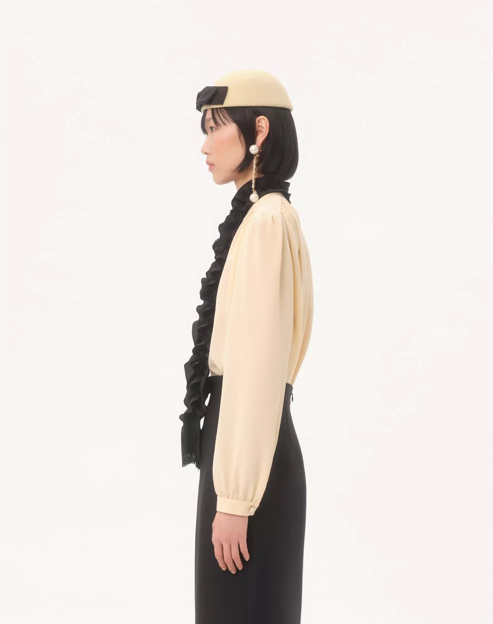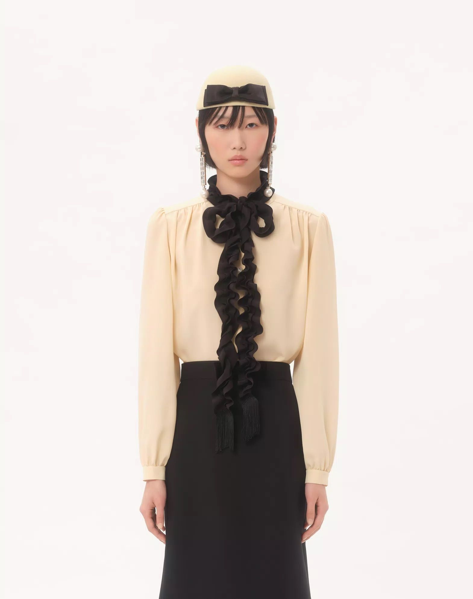 Áo sơ mi nữ dài tay màu kem vàng cài khuy dọc thân, cổ may ghép dải bèo buộc nơ mầu đen , đầu tua rua