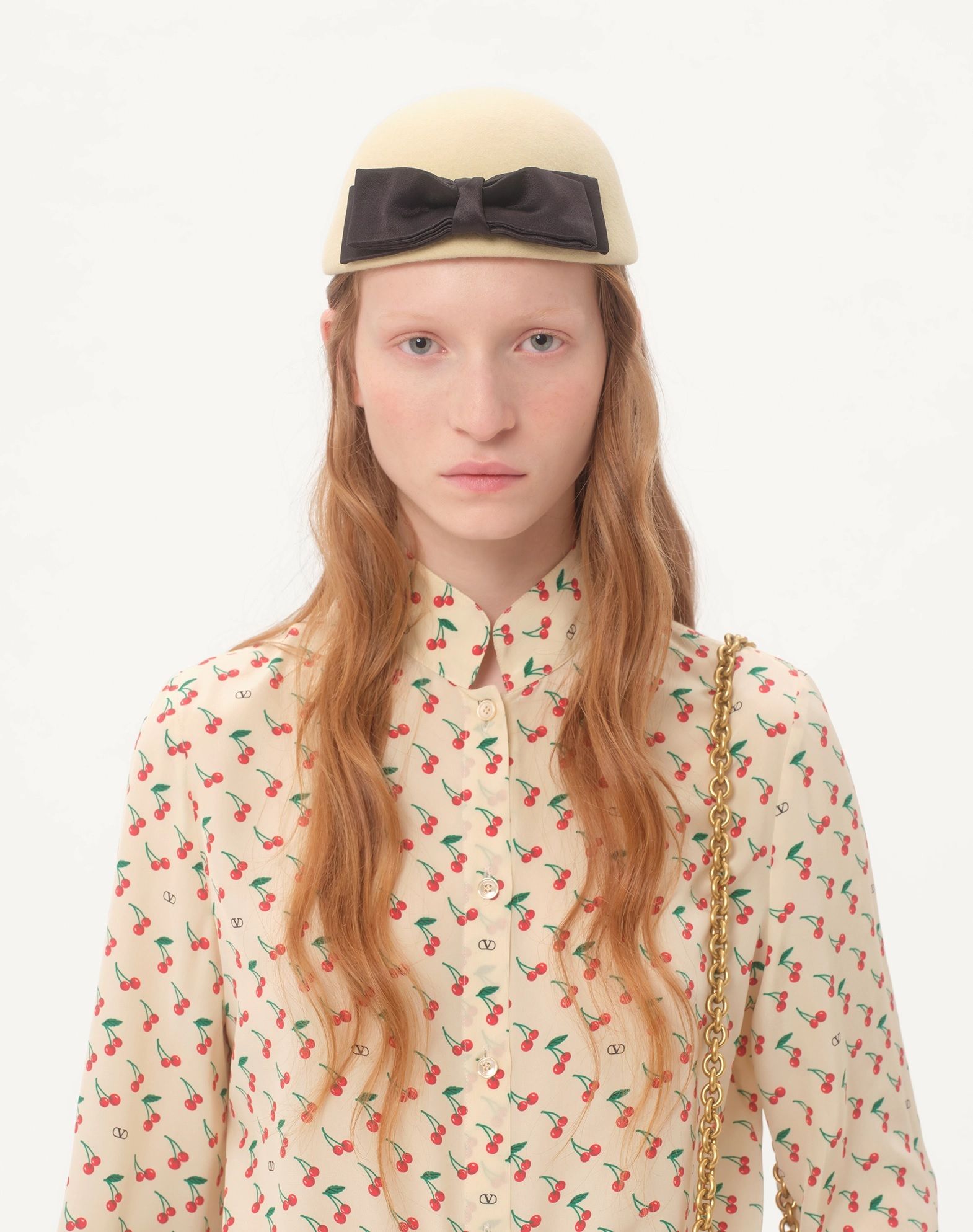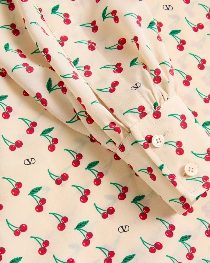 Áo sơ mi nữ dài tay màu be toàn thân in họa tiết quả chery màu đảo