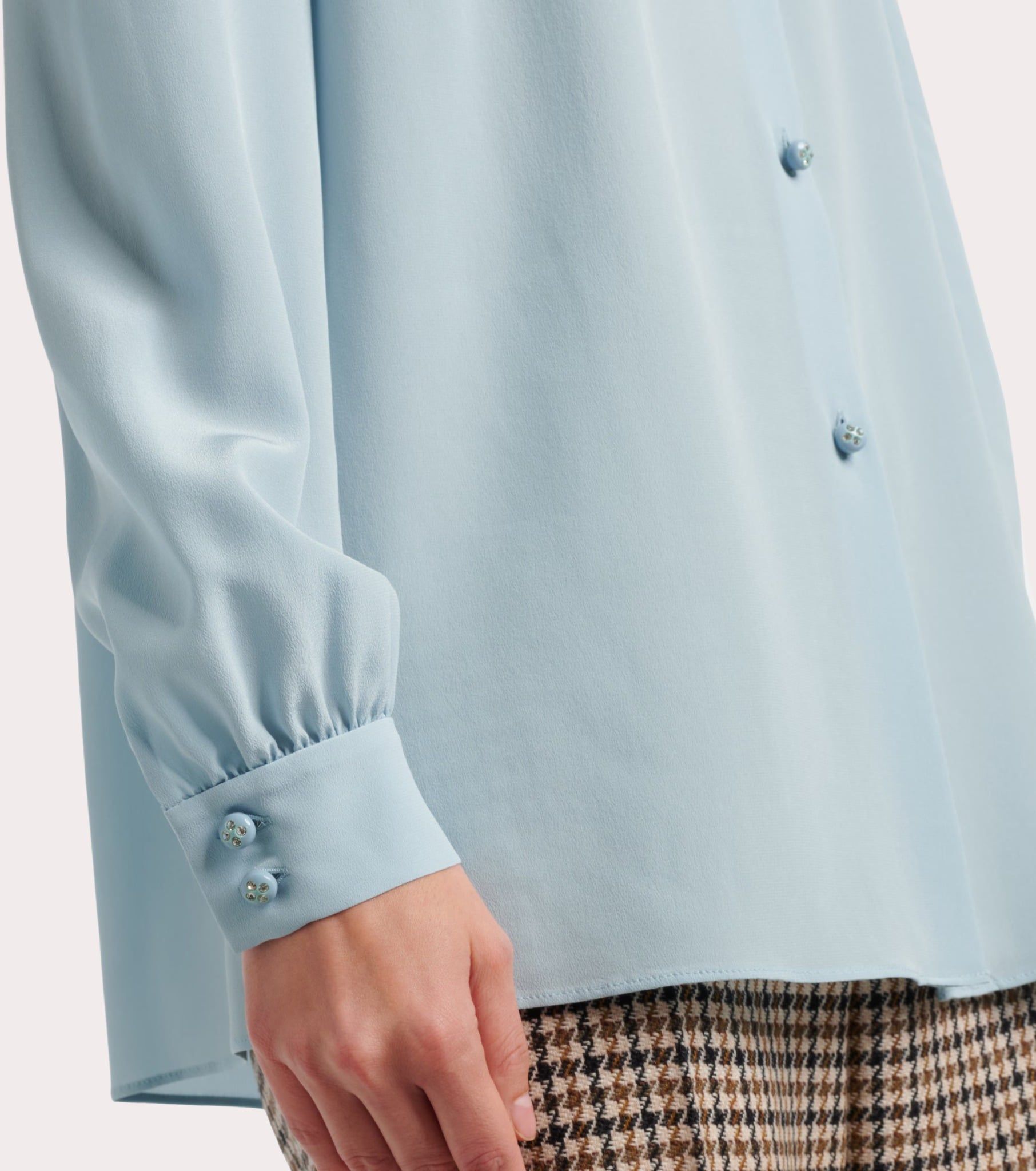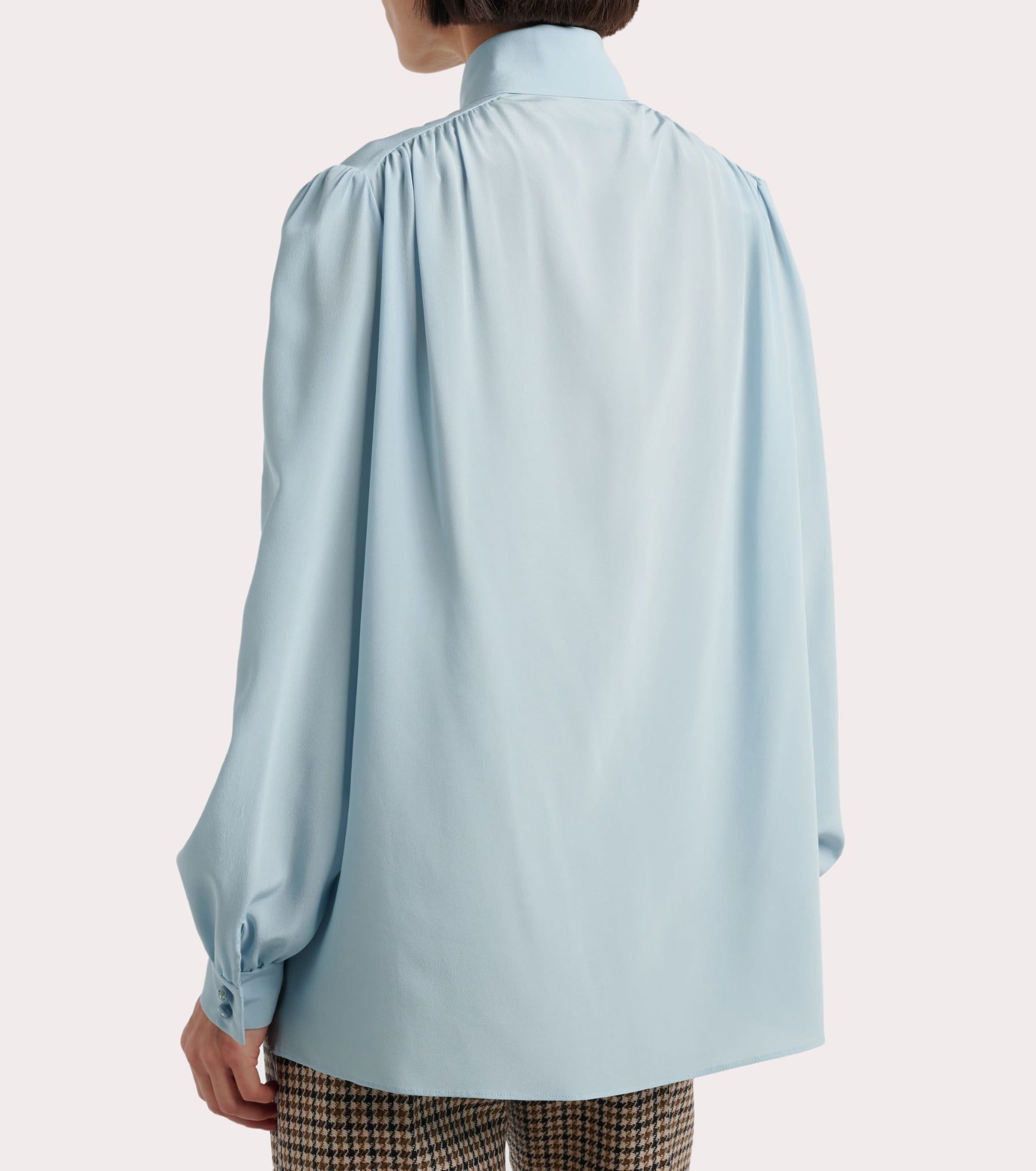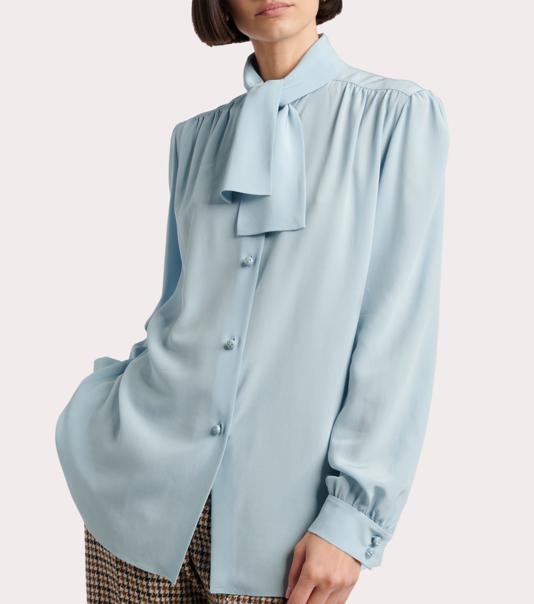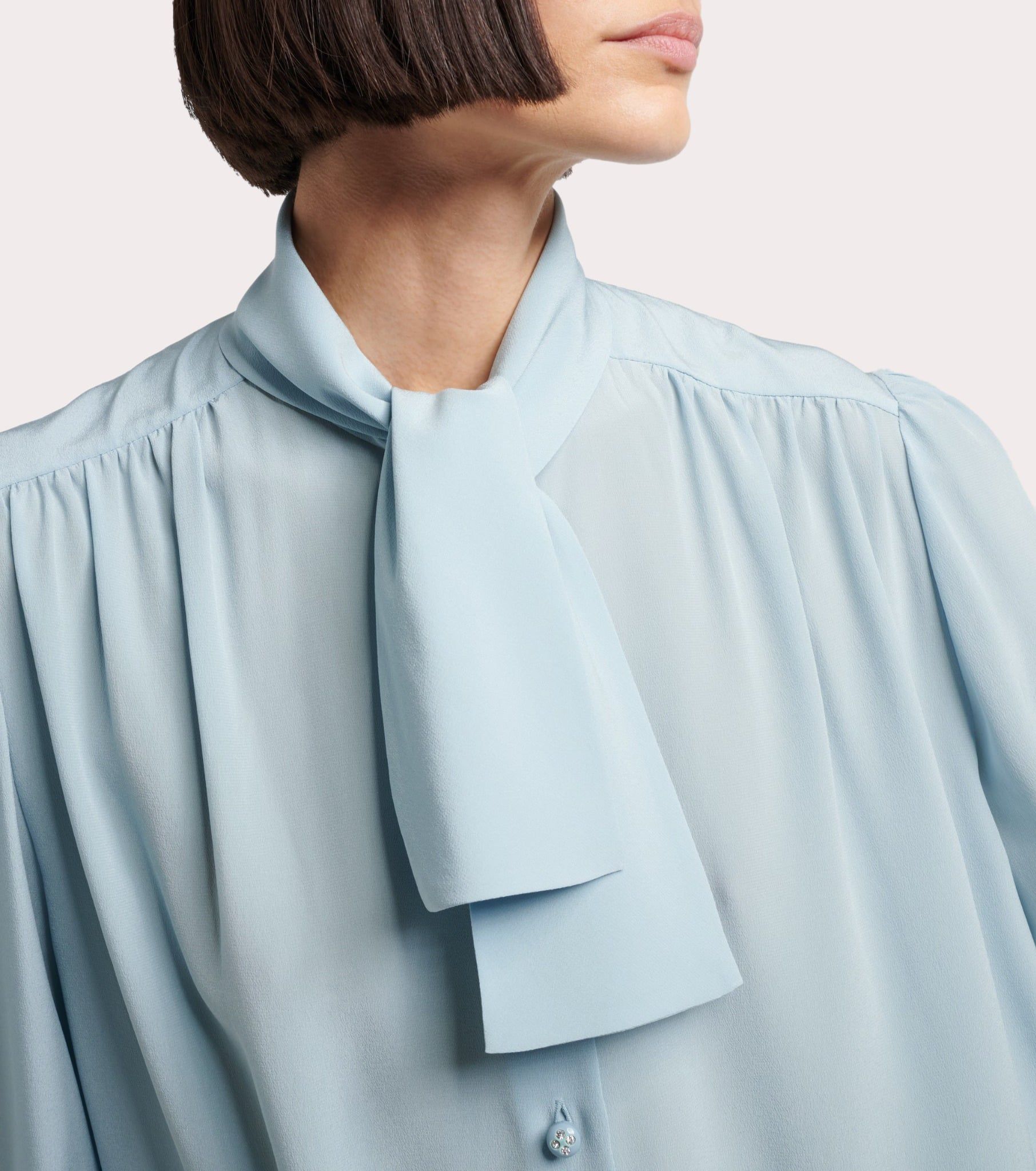 Áo sơ mi nữ dàu tay màu xanh da trời, cổ ghép đai cùng màu buộc nơ