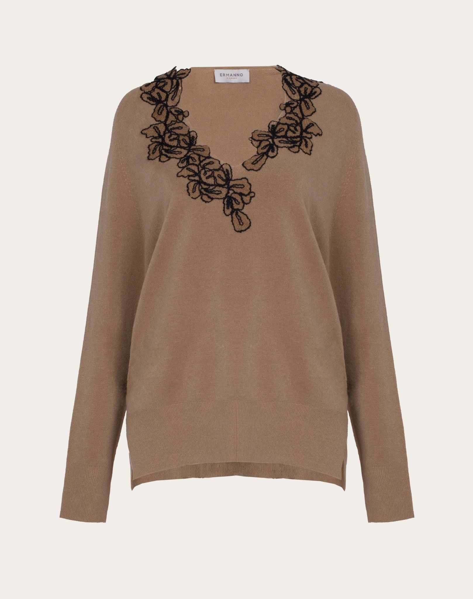 Áo sợi nữ dài tay màu nâu nhạt cổ V sâu, xung quanh cổ pha ren hoa đen nền màu nâu