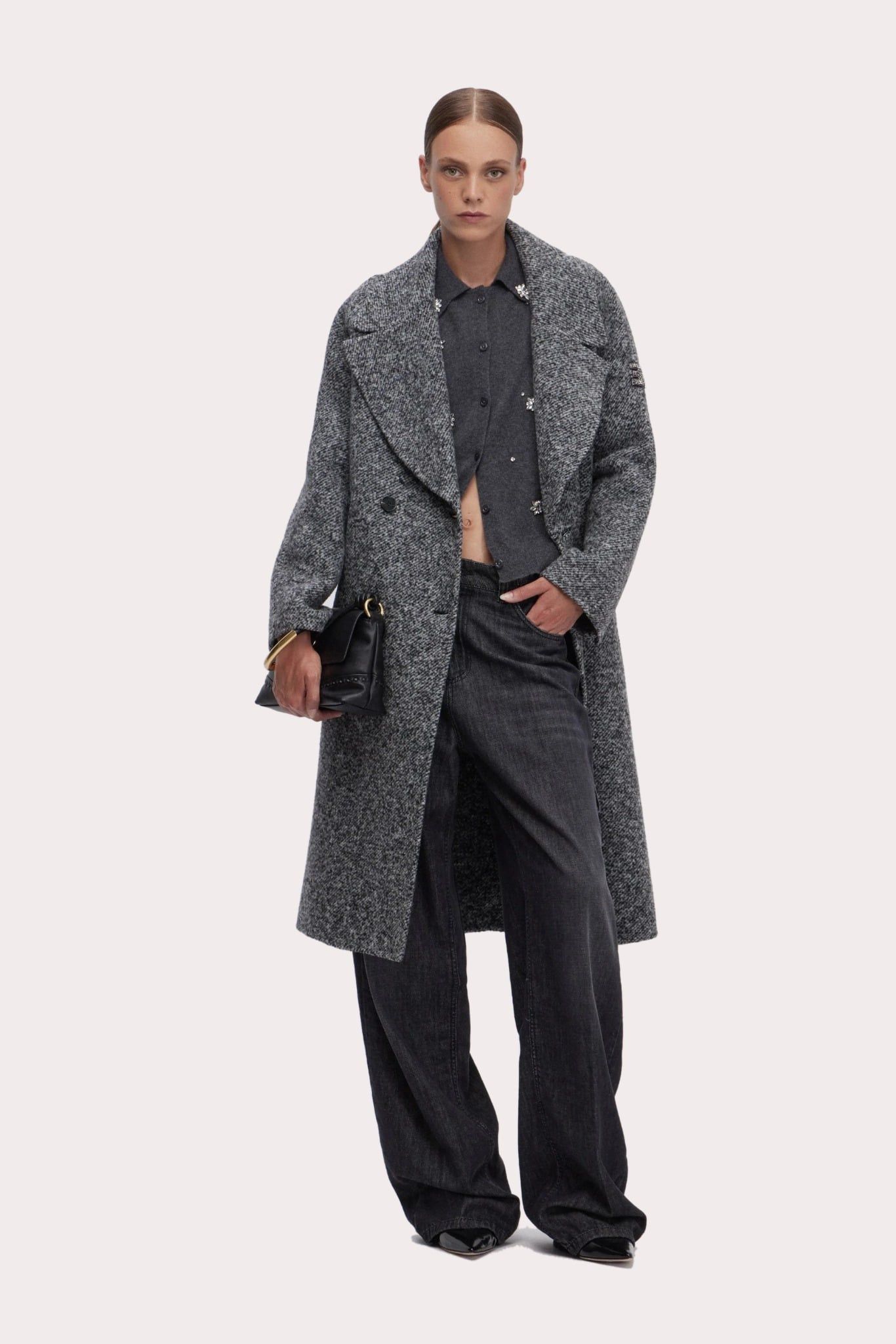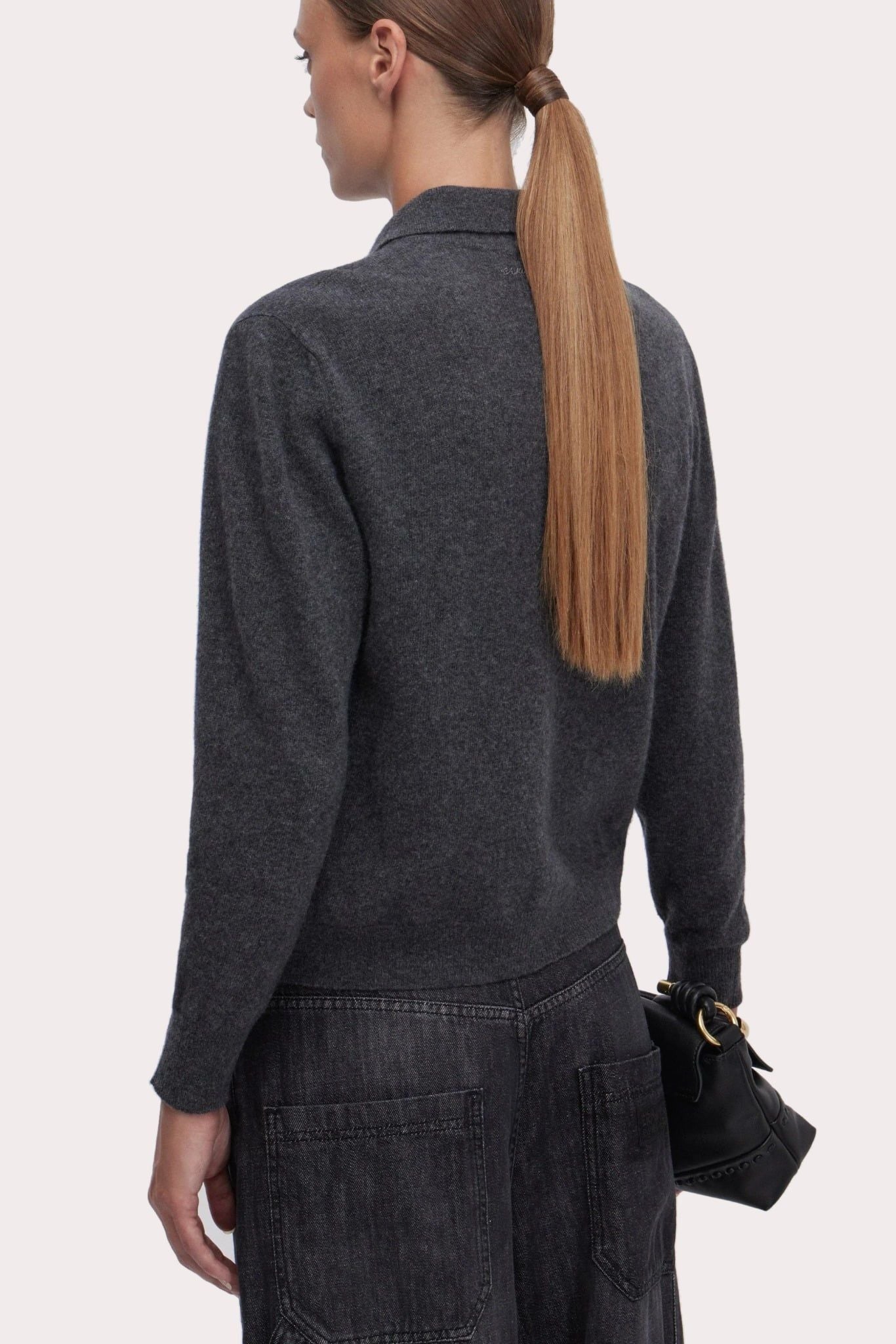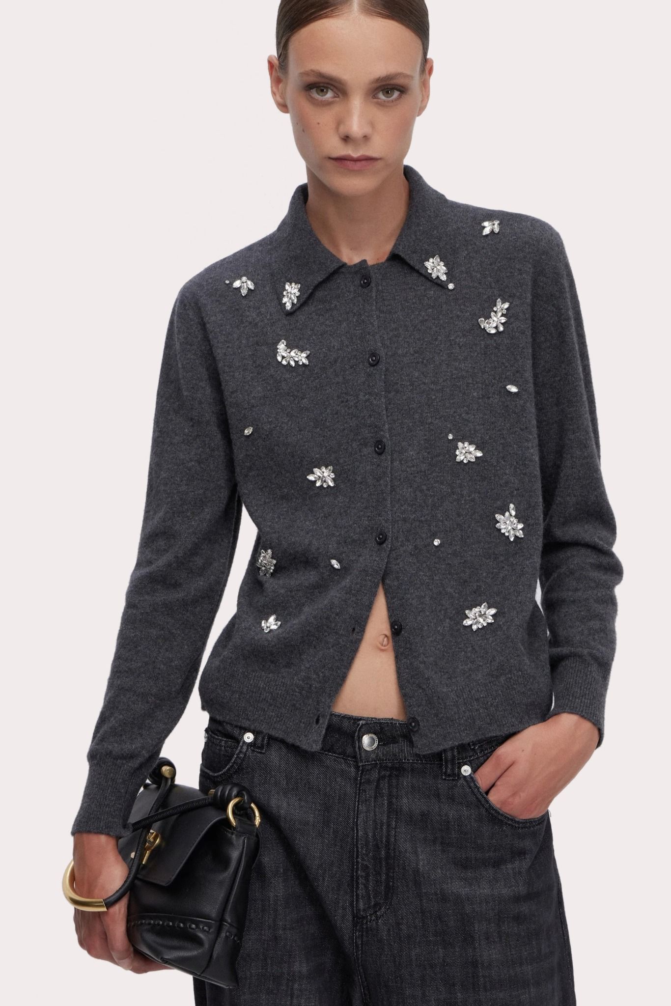 Áo sợi nữ dài tay cổ bẻ cài khuy màu ghi, thân trước đính đá trắng tạo hoa