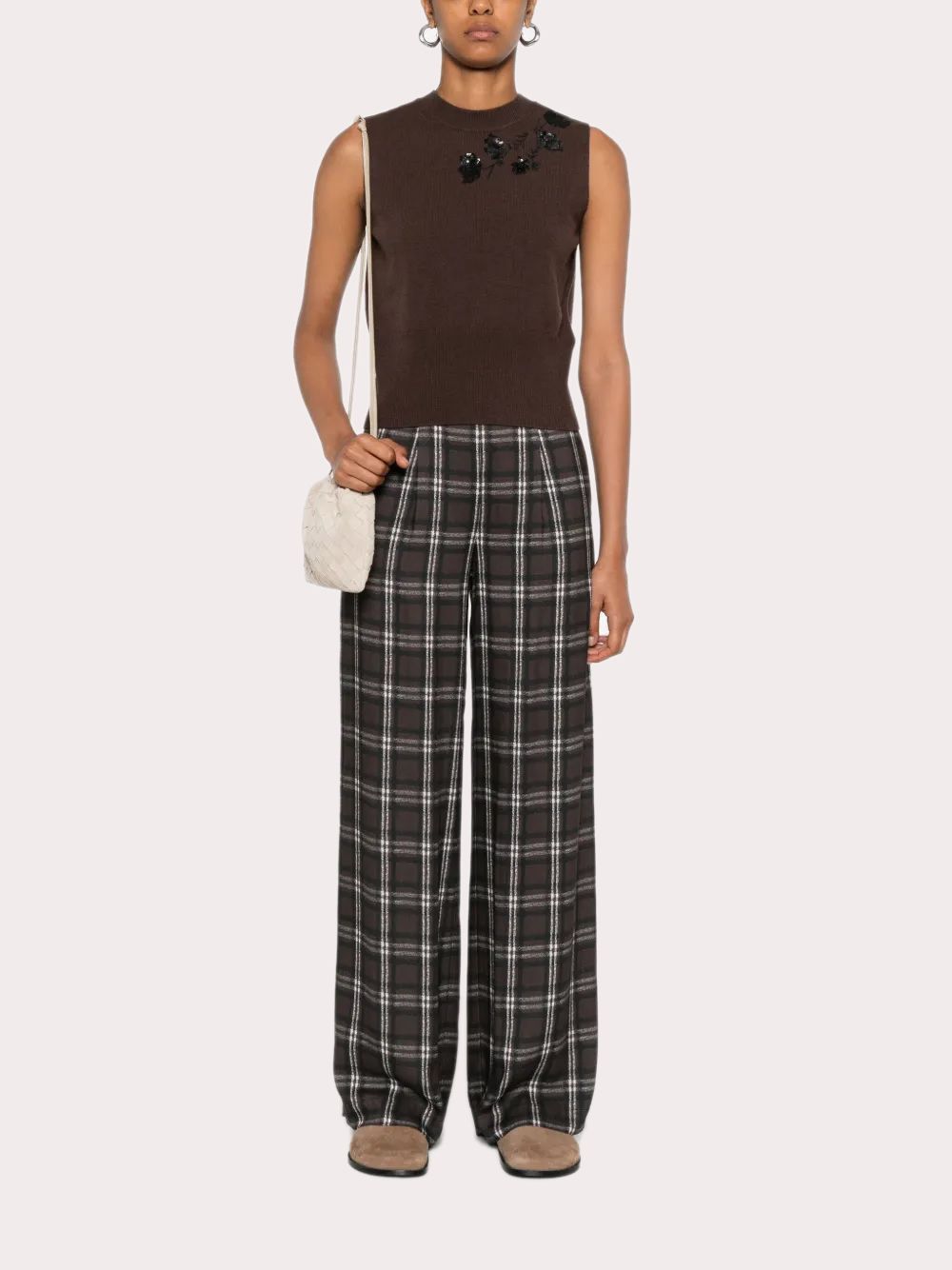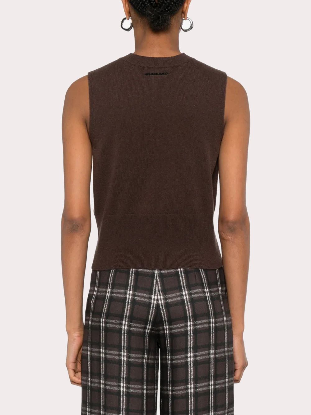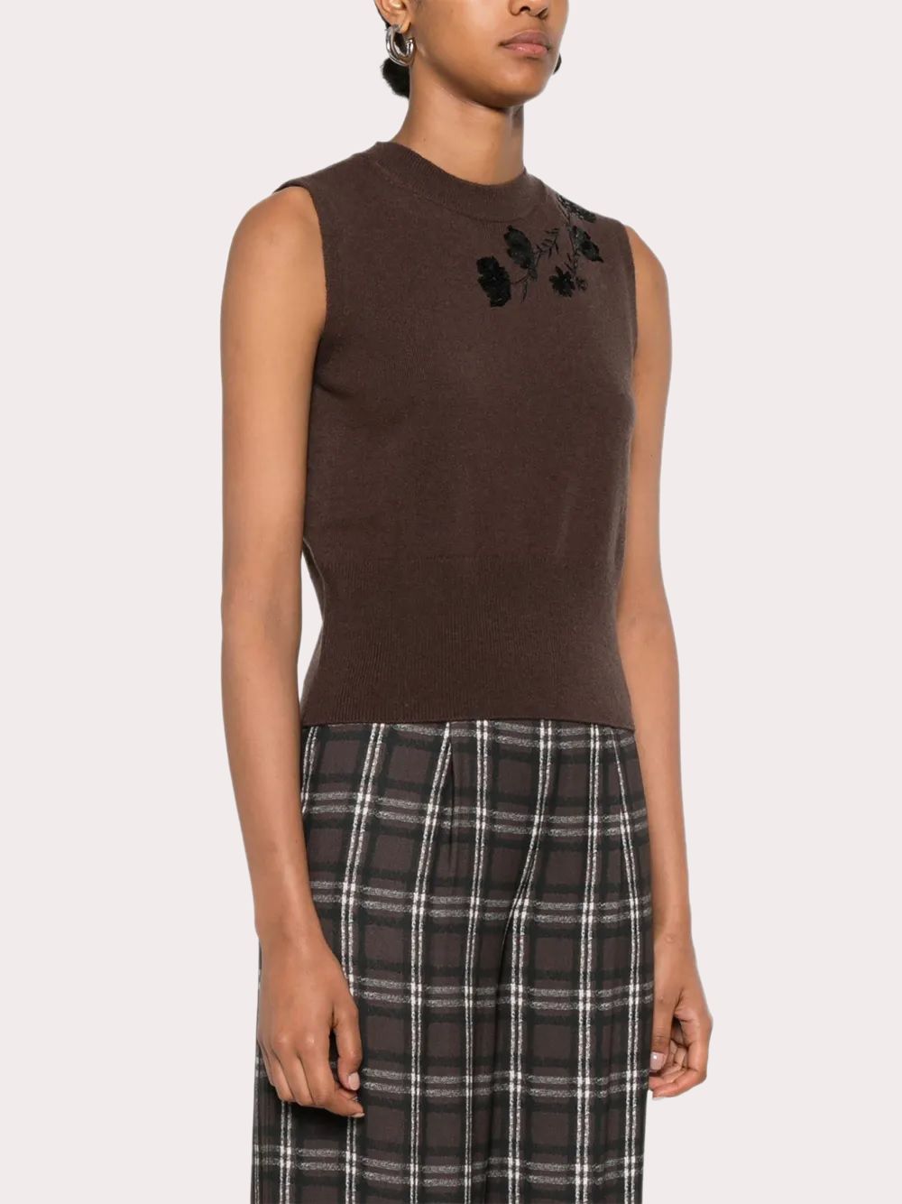Áo sơi nữ sát nách màu nâu, vai trái đính cườm đen tạo hình cành hoa