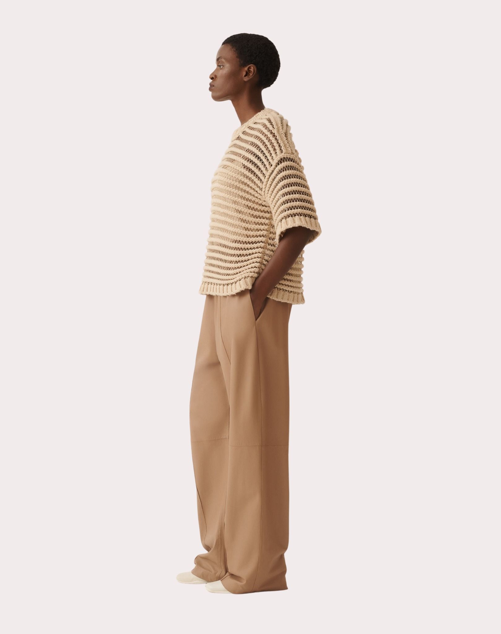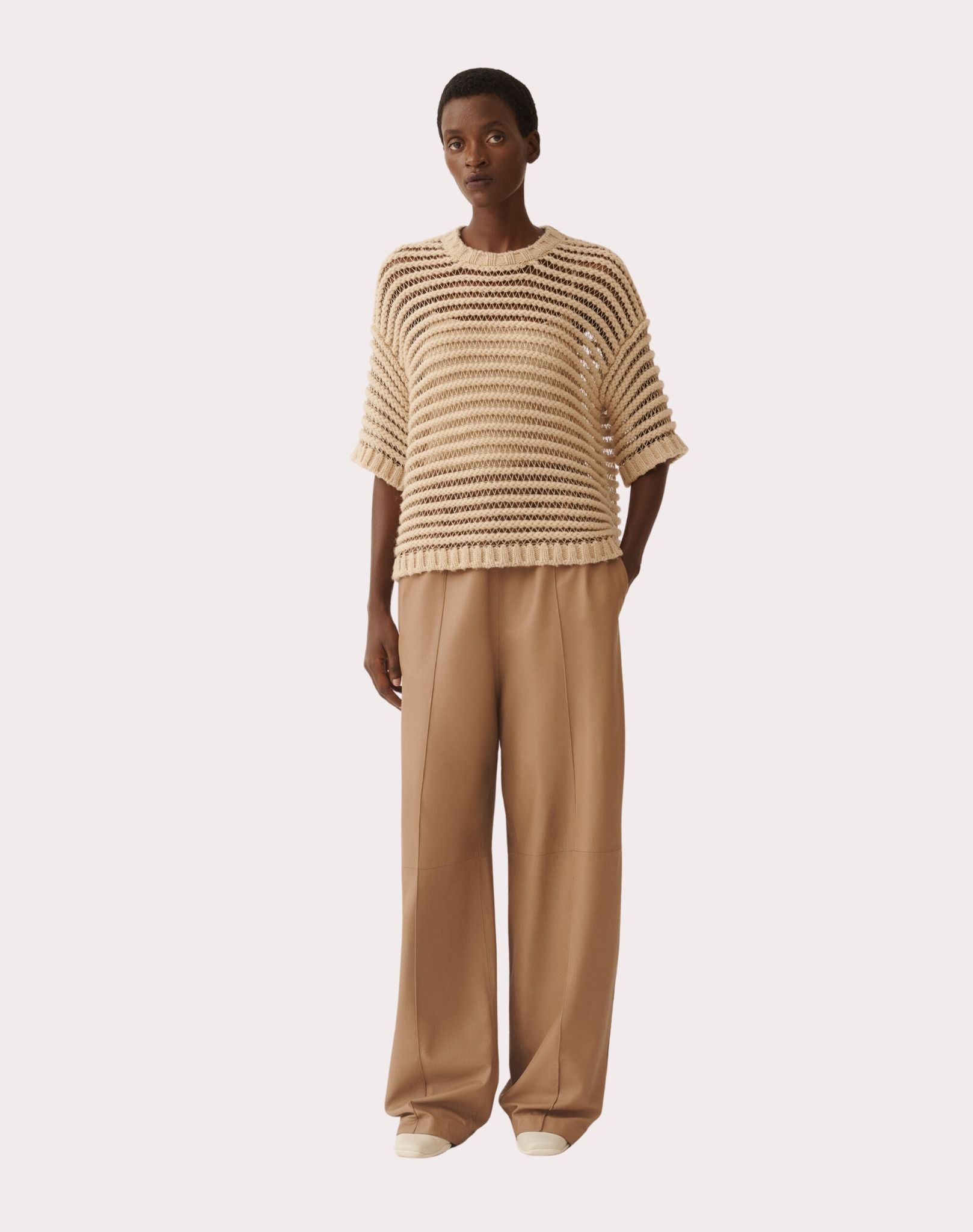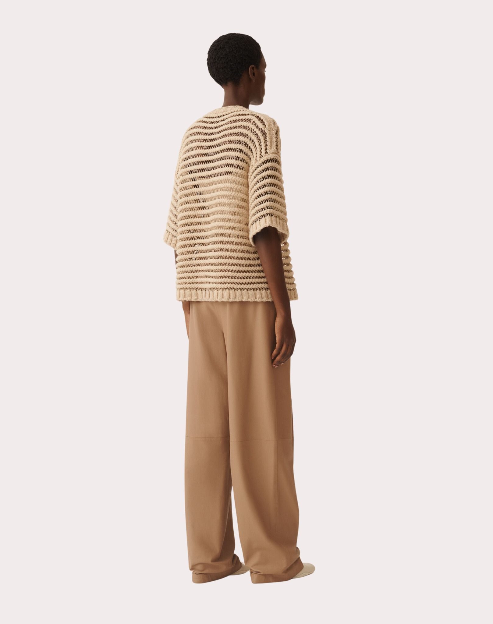 Áo sợi nữ cộc tay cổ tròn màu nâu ne, toàn thân dệt kẻ ngang kiểu lưới
