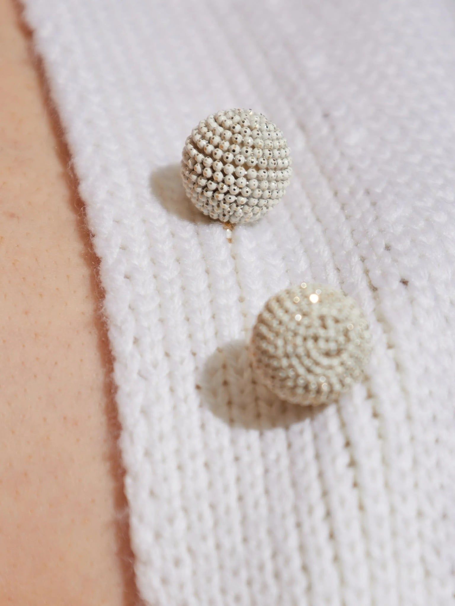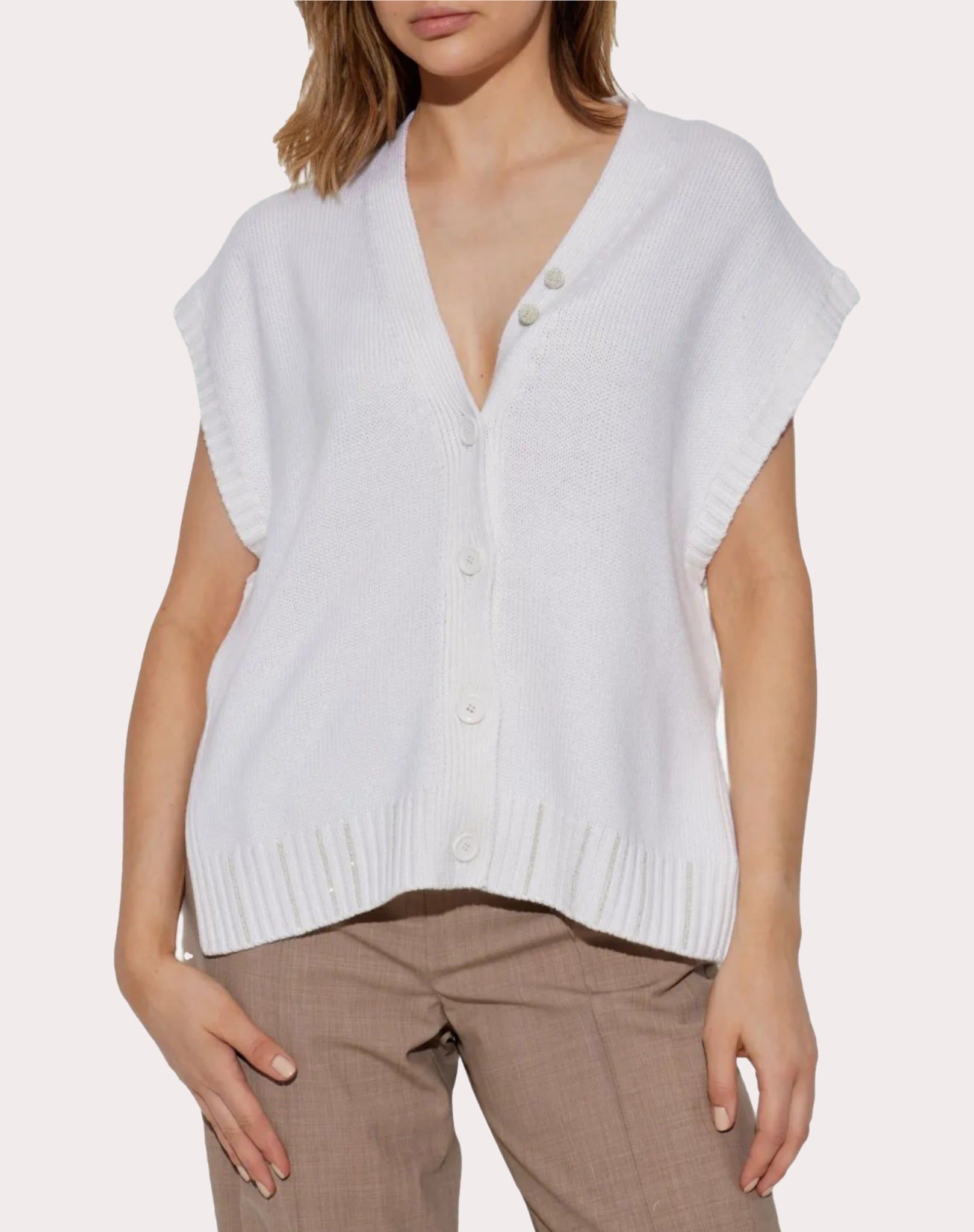 Áo cardigan nữ màu trắng, sát nách, cài 3 khuy, nẹp trái gắn thêm 2 khuy