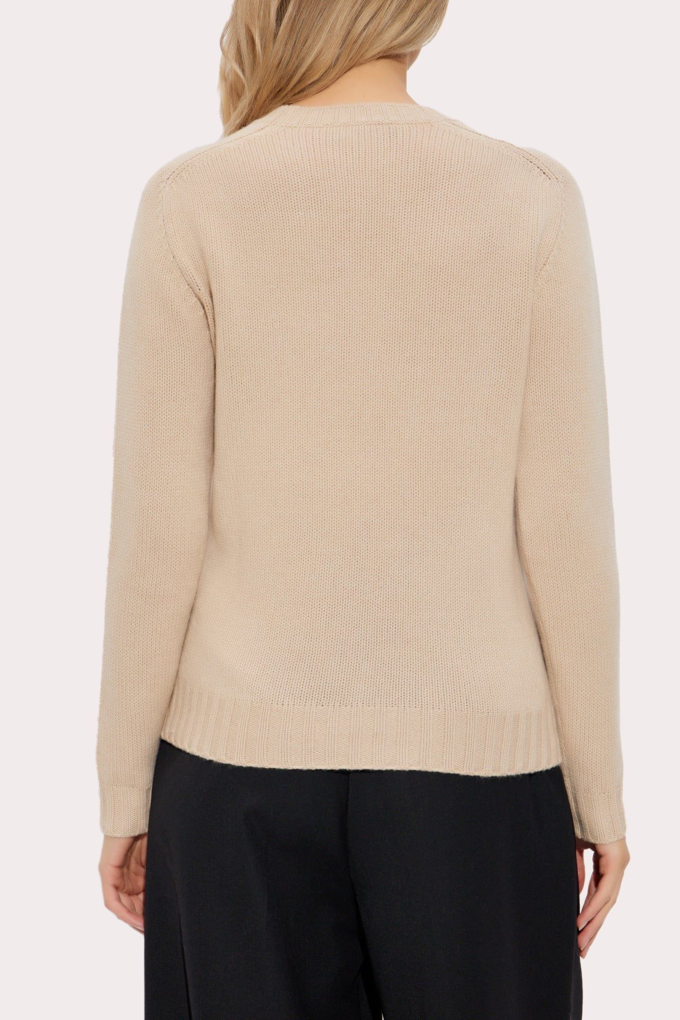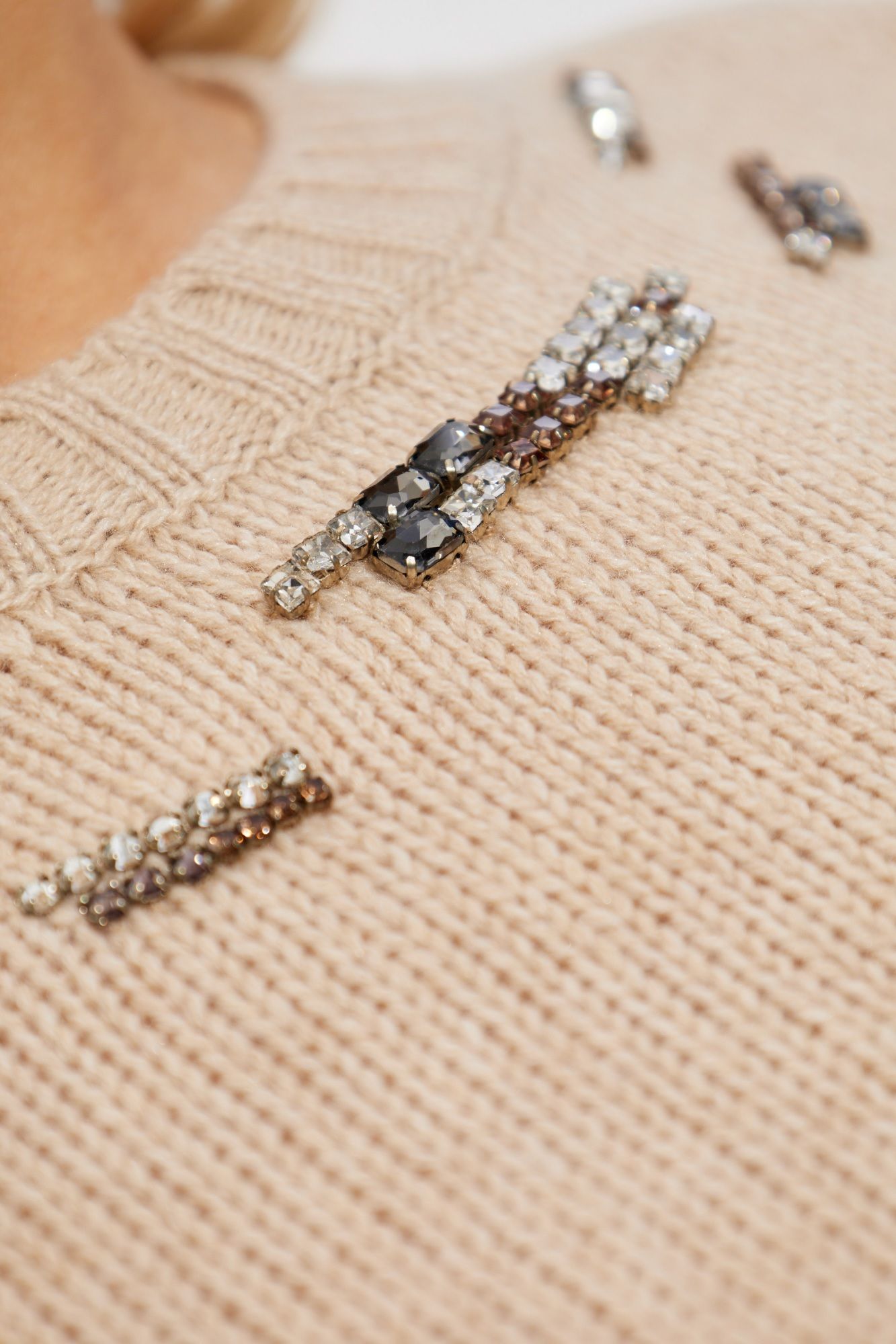Áo sợi nữ dài tay cổ tròn màu be, vùng cổ đính đá trắng