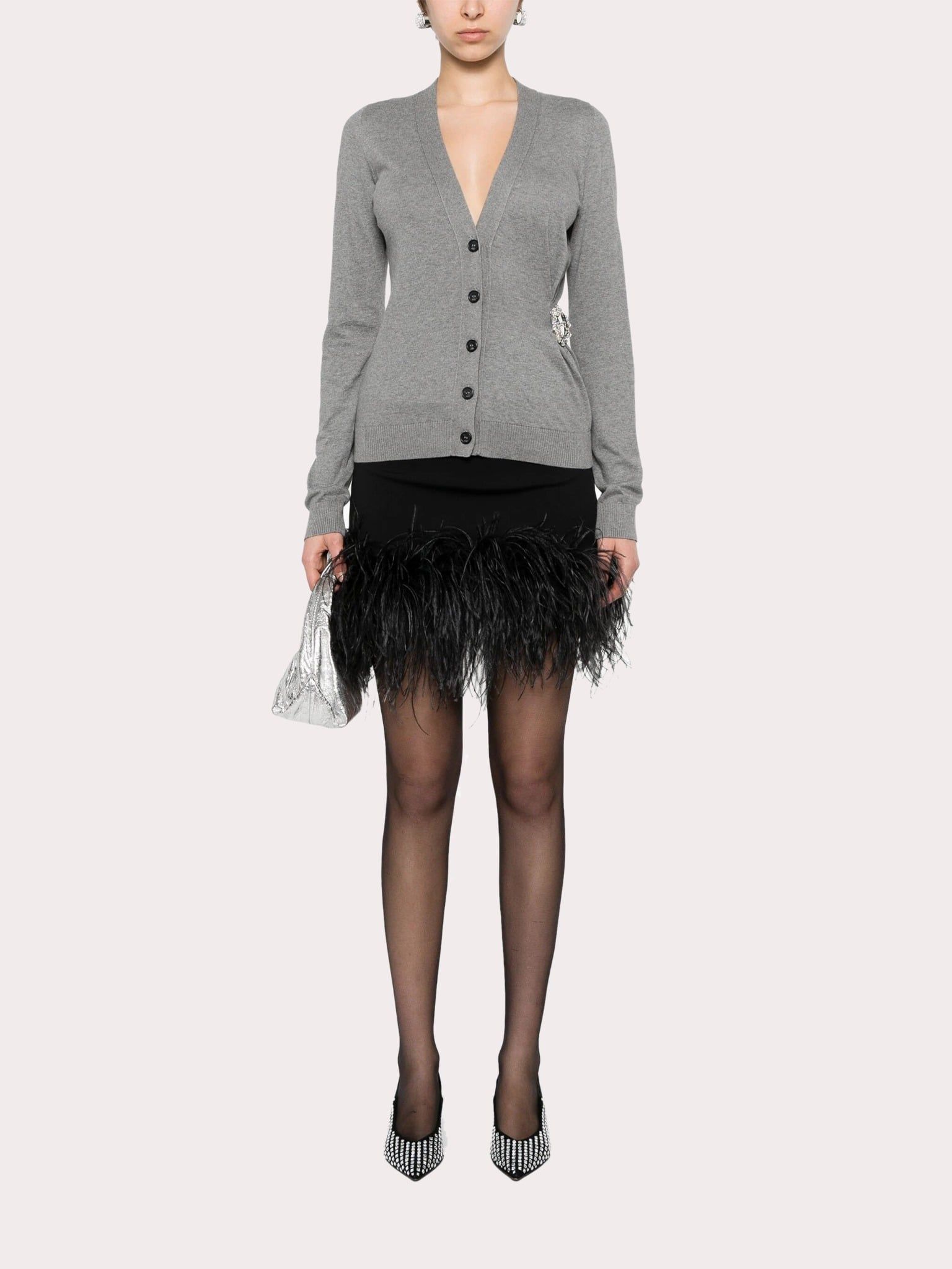 Áo sợi nữ dài tay cổ V cài khuy dọc thân màu ghi, eo trái cài rúm bằng 1 vòng đá màu trắng