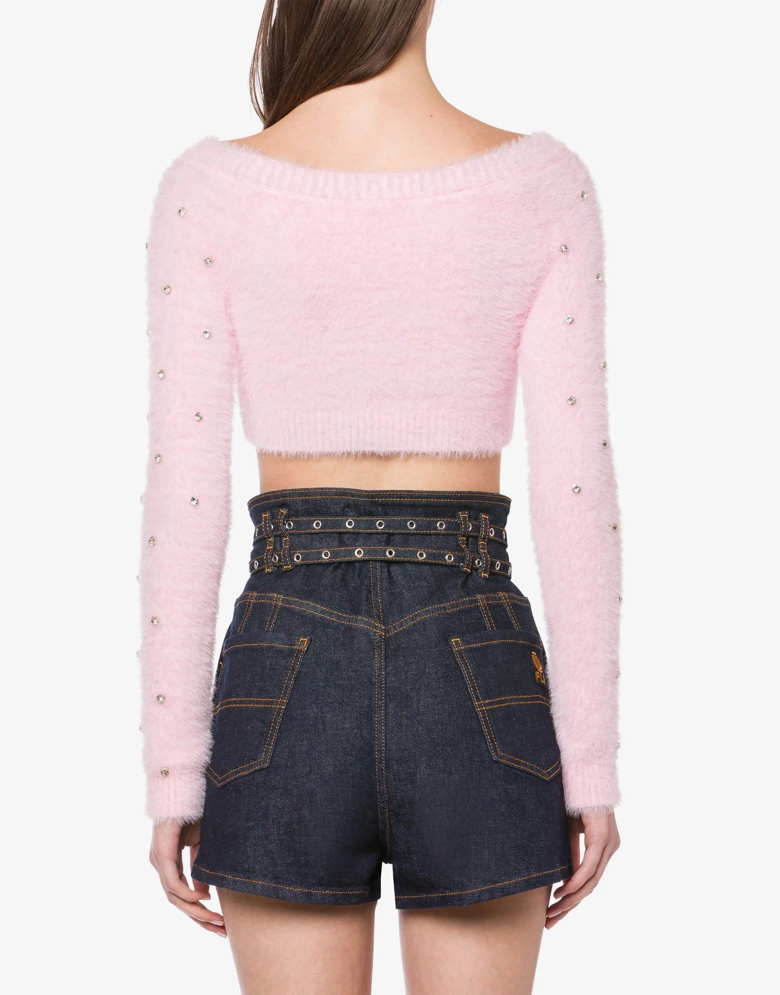 Áo len nữ dài tay màu hồng chất xù dáng croptop toàn thân đính đá trắng