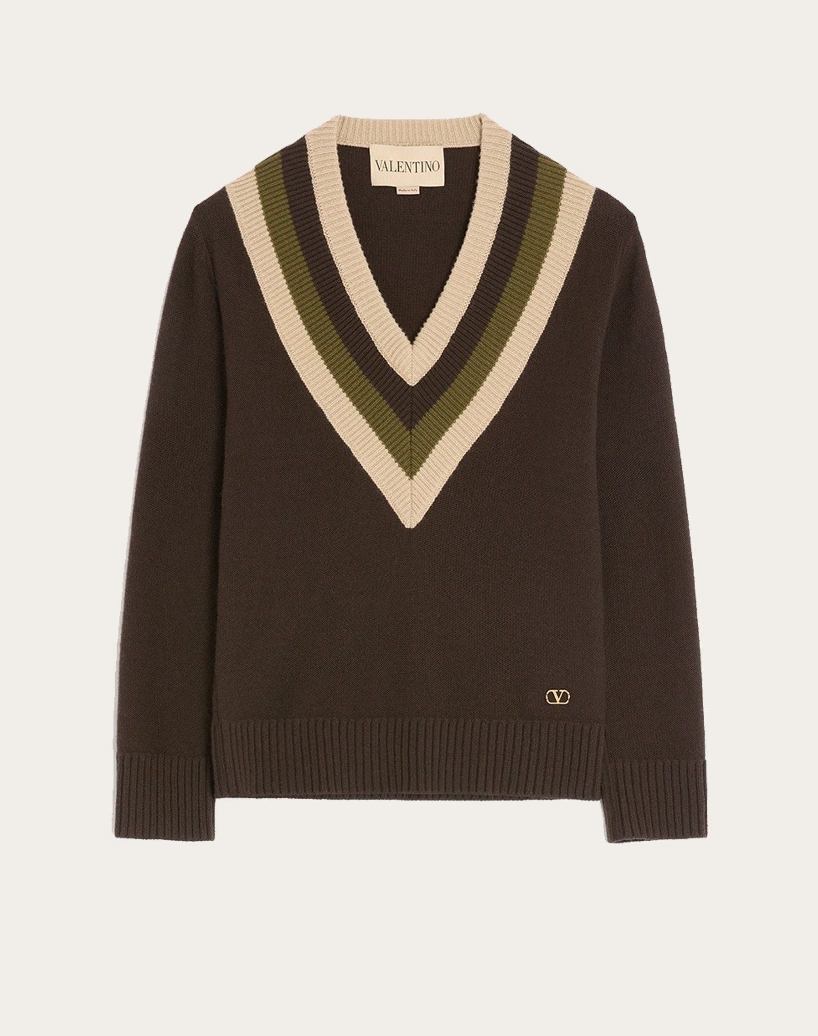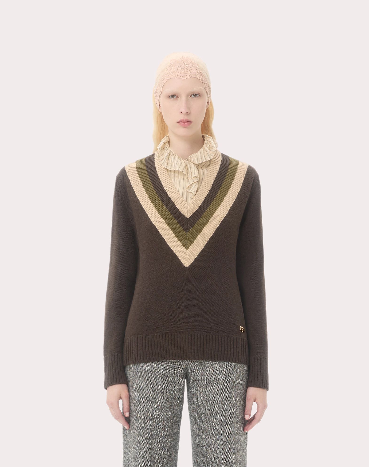 Áo sợi nữ dài tay màu nâu, cổ V, cổ pha sợi màu be + xanh + nâu tạo chữ V, gấu gắn logo nhỏ màu vàng