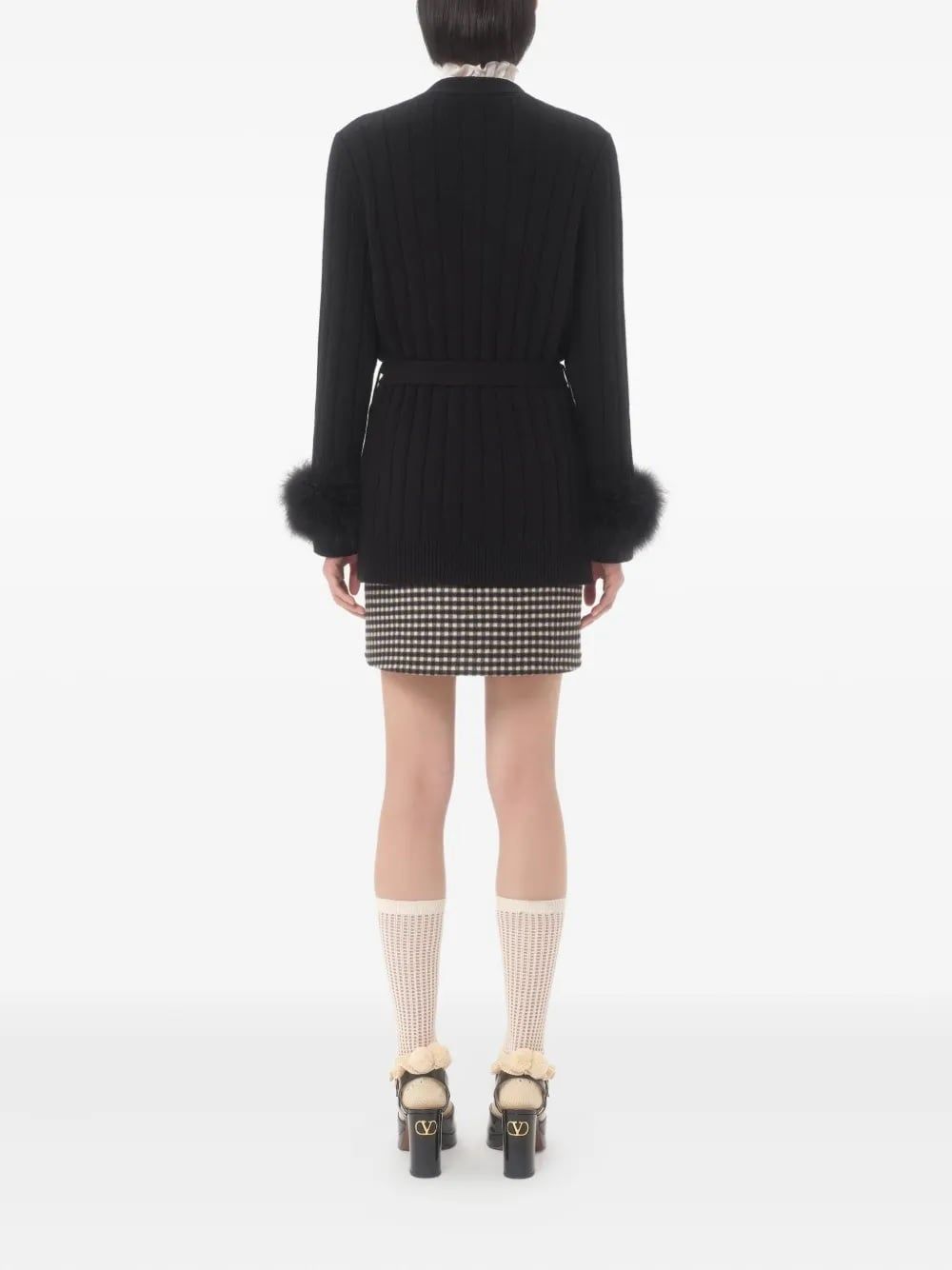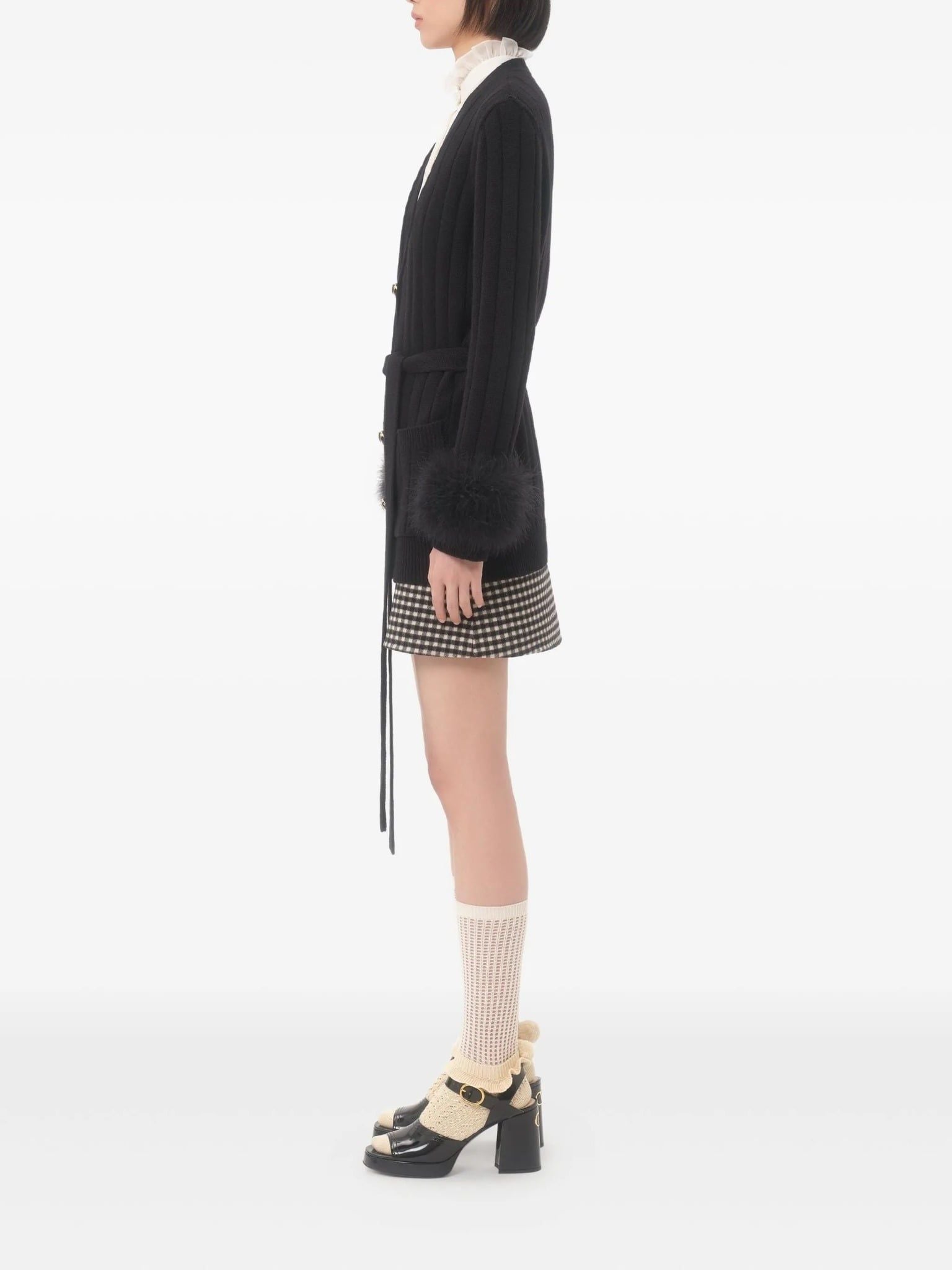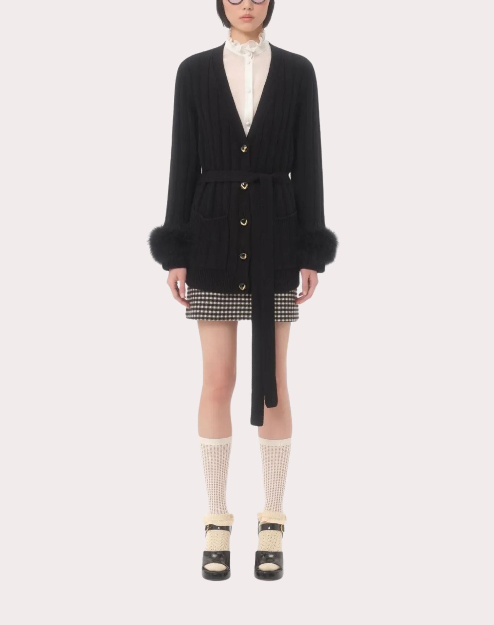 ÁO CADIGAN DÀI TAY DÁNG DÀI MÀU ĐEN , CỔ V CÀI KHUY VÀNG PHÍA TRƯỚC , TAY PHỐI LÔNG CÙNG MÀU , TRƯỚC CÓ 2 TÚI KÈM ĐAI RỜI