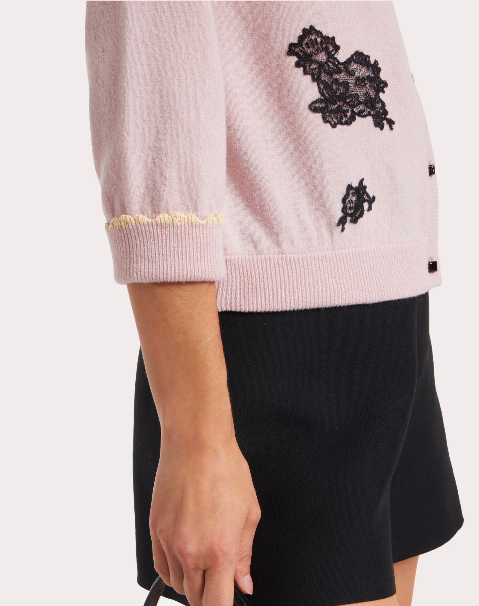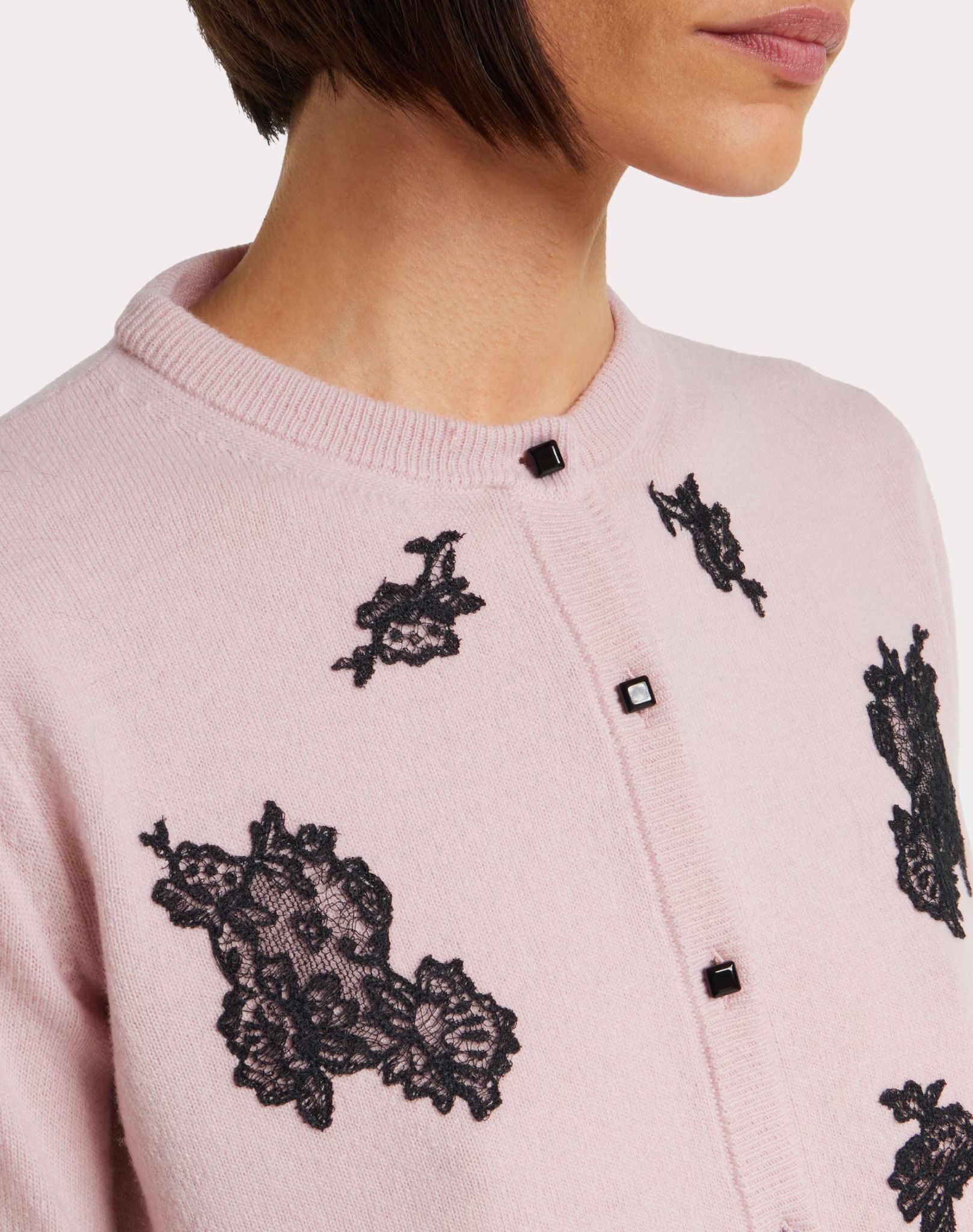 ÁO LEN NỮ DÀI TAY CÀI KHUY CỔ TRÒN MẦU HỒNG , THÂN TRƯỚC THÊU REN HOA ĐEN