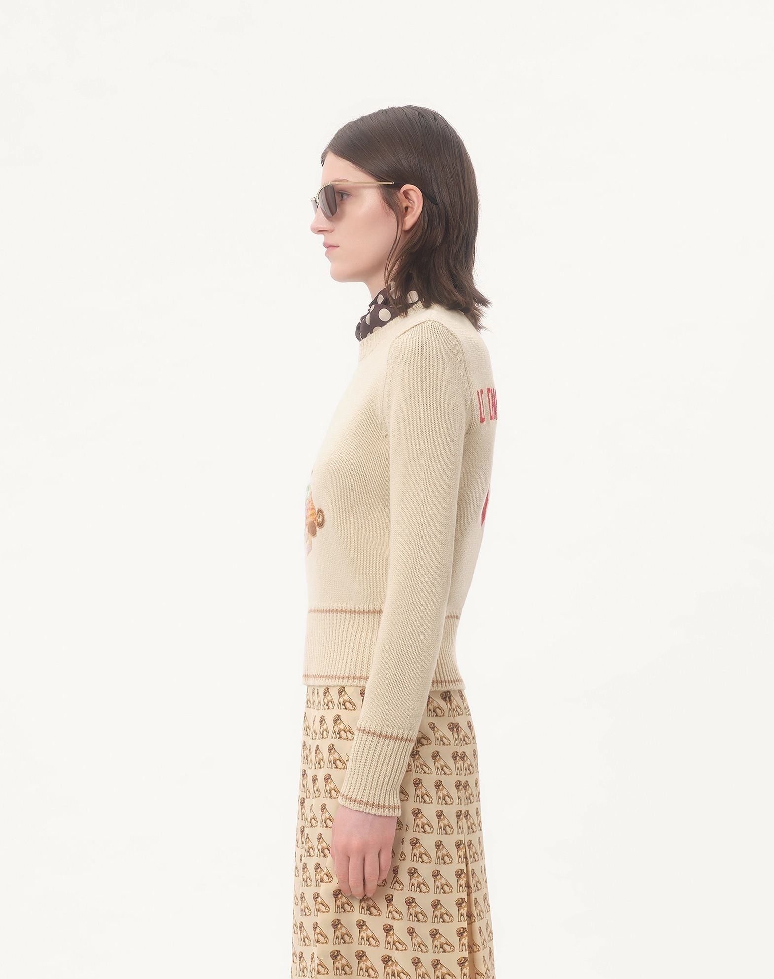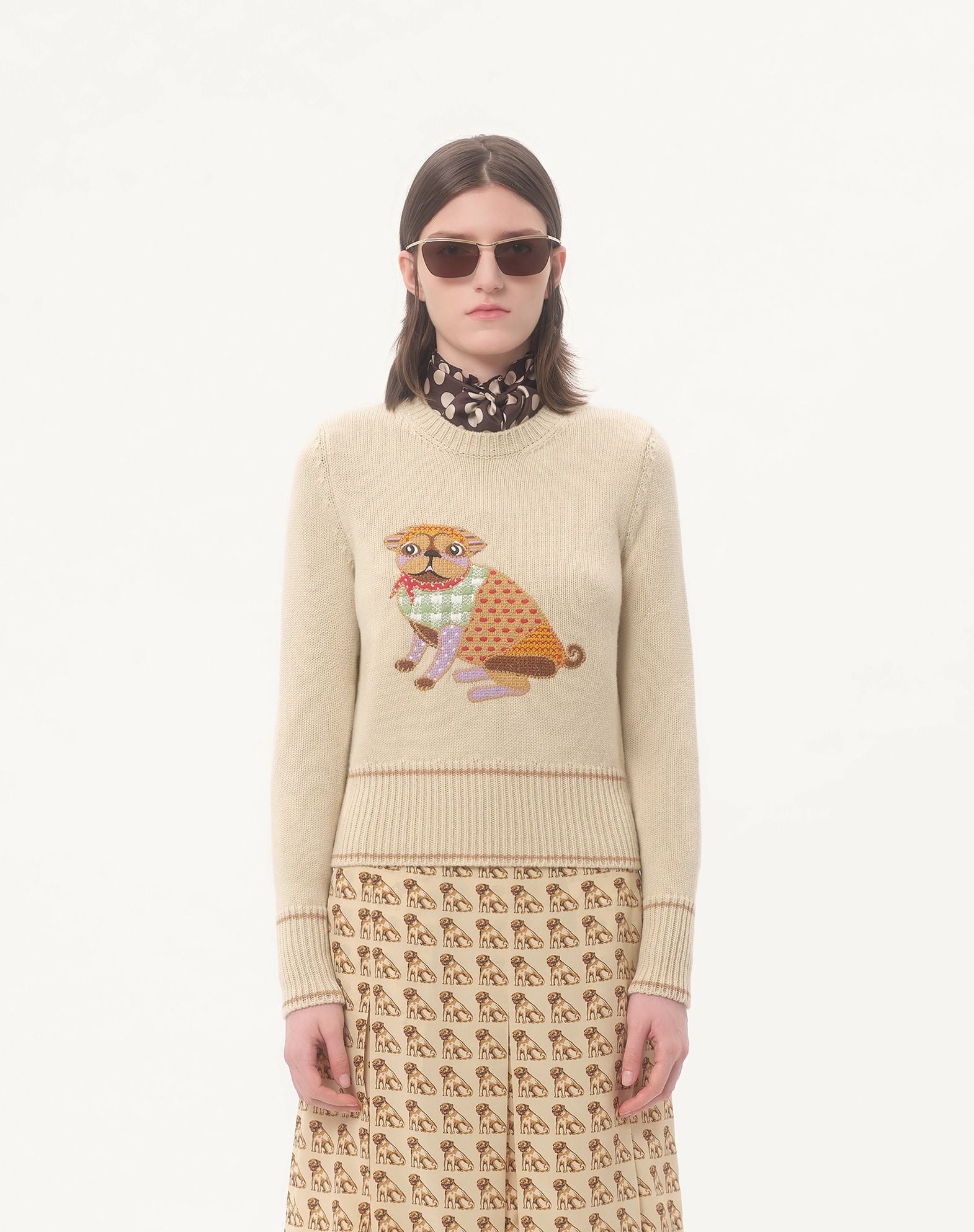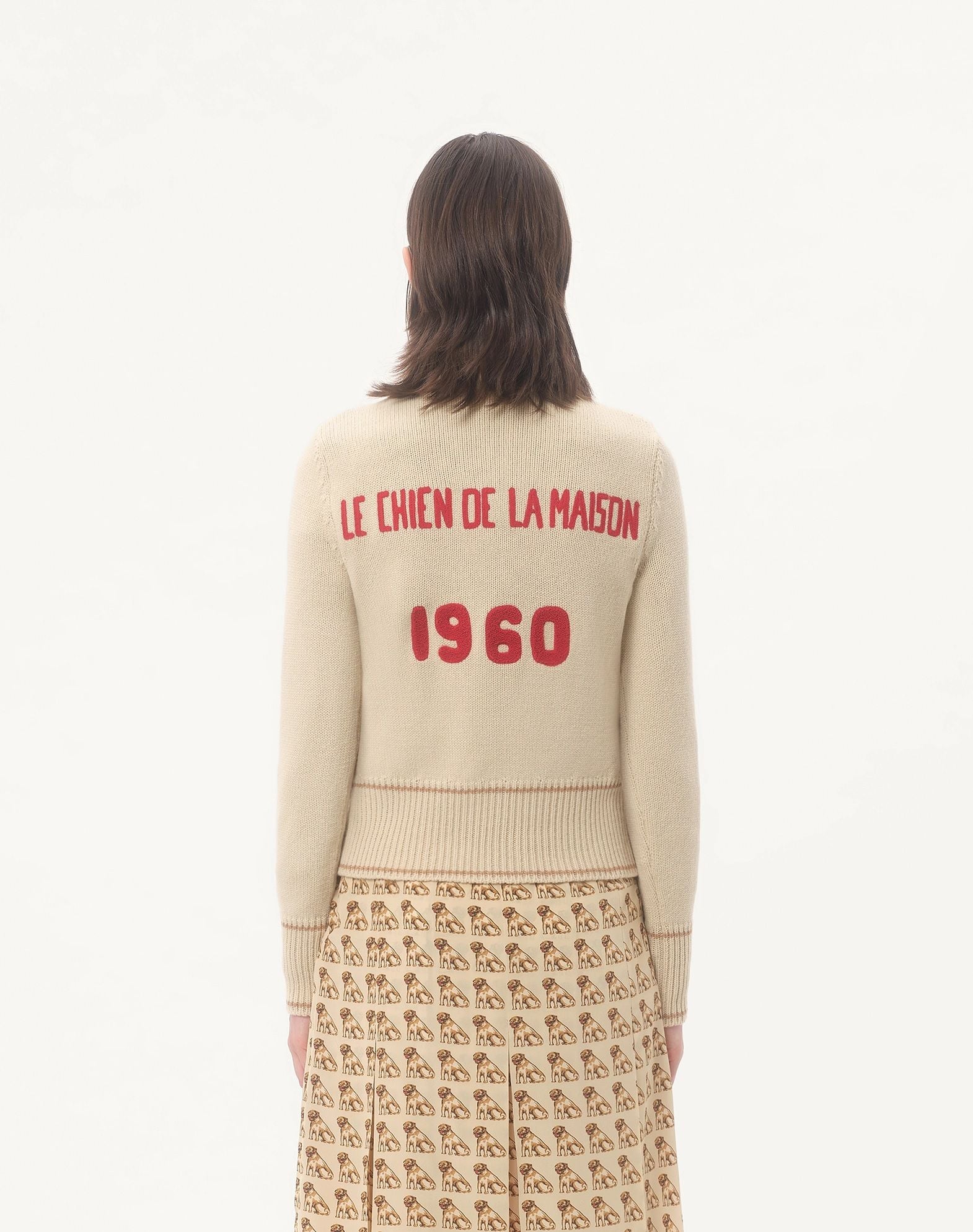ÁO LEN NỮ CỔ TRÒN DÀI TAY MẦU BE , THÂN TRƯỚC THÊU NỔI HÌNH CON CHÓ NHIỀU MẦU , THÂN SAU THÊU CHỮ ĐỎ