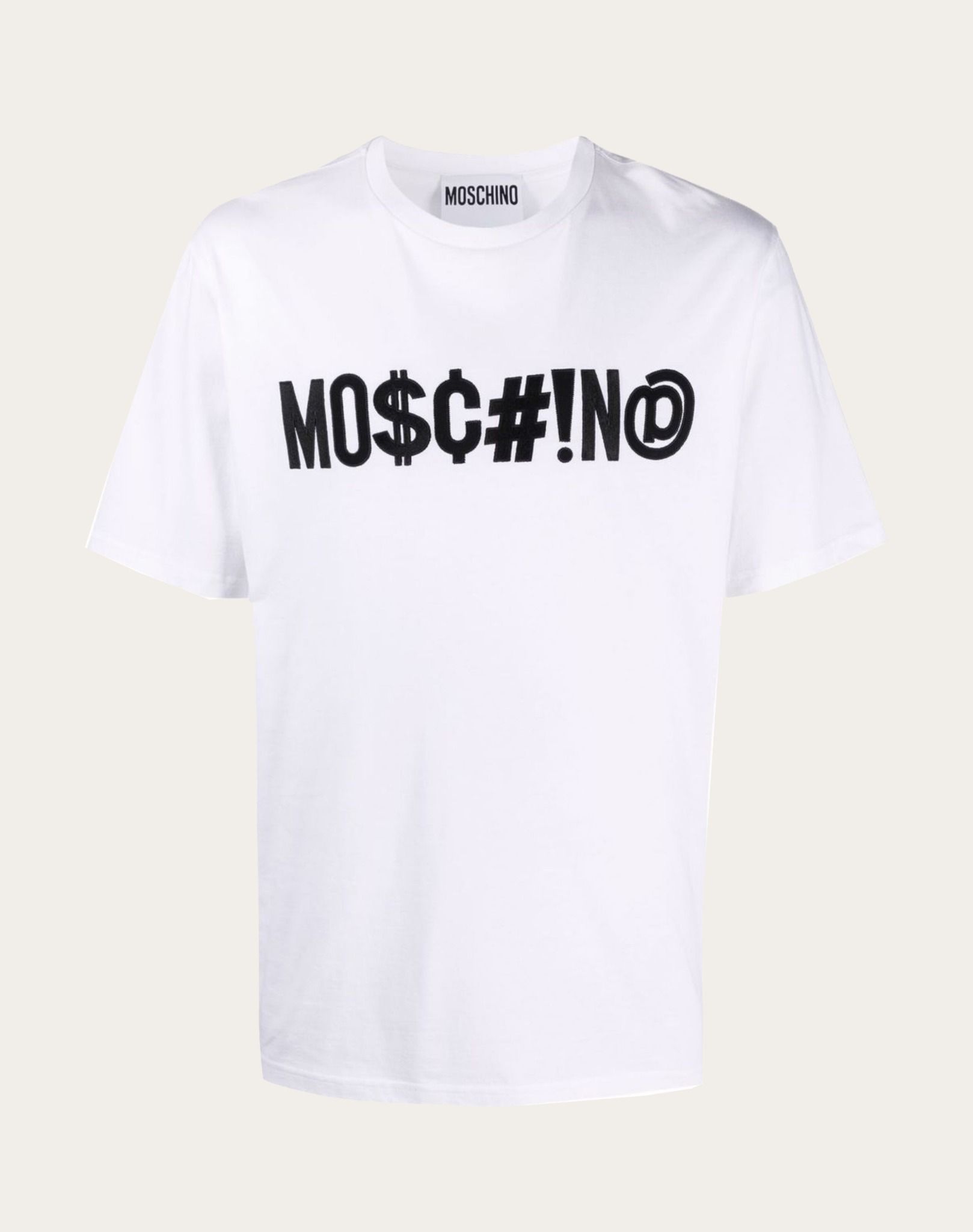 Áo phông nam cộc tay màu trắng cổ tròn ngực thêu chữ Moschino cách điệu màu đen