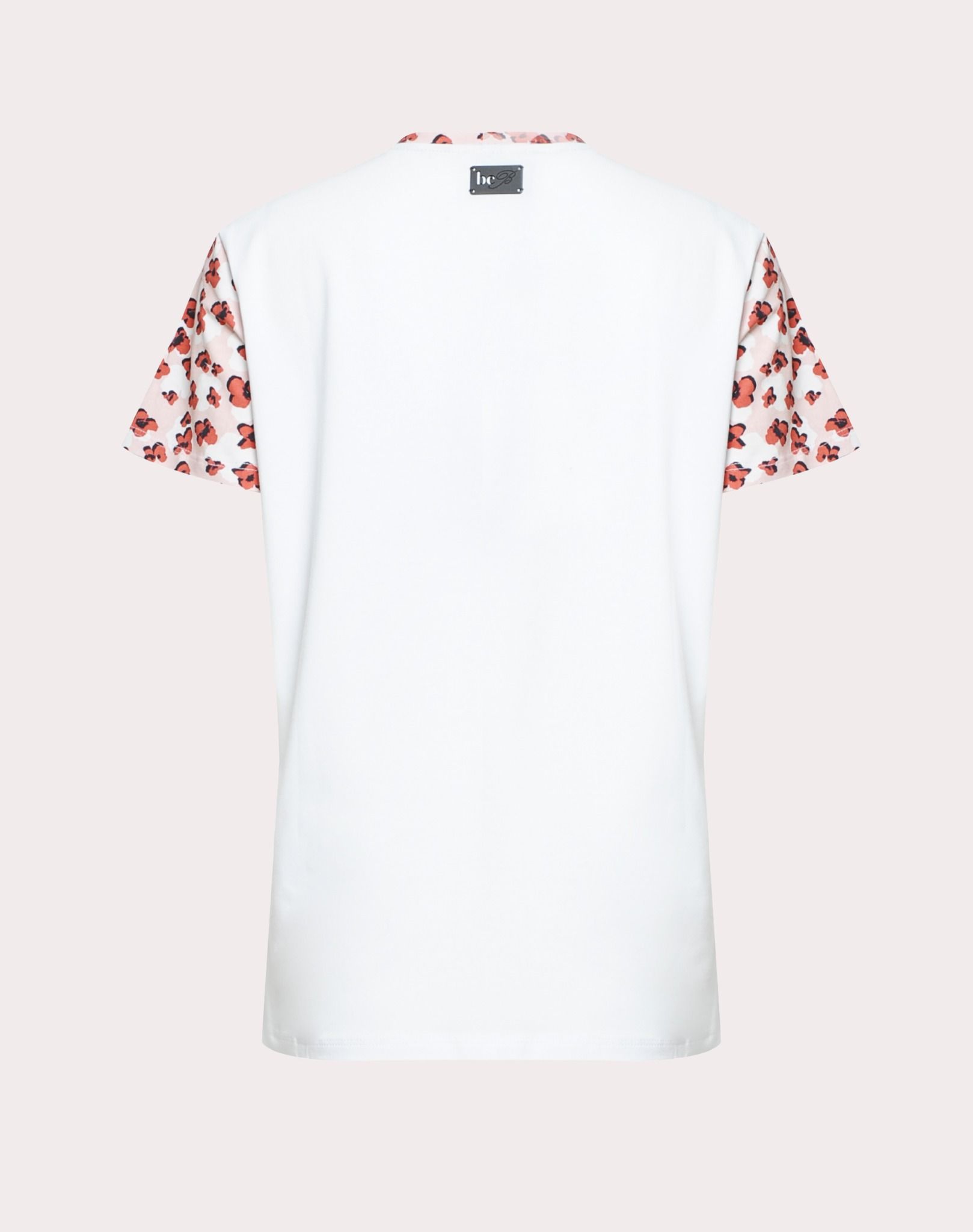 Phông nữ cộc tay màu trắng viền xung quanh cổ nền hồng họa tiết hoa đỏ trắng