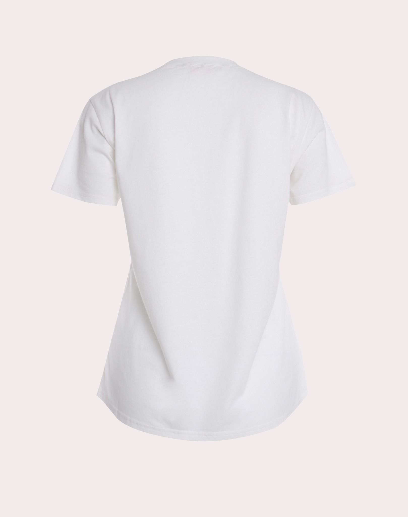 Áo phông nữ cộc tay màu trắng kem, giữa ngực in chữ màu đỏ
