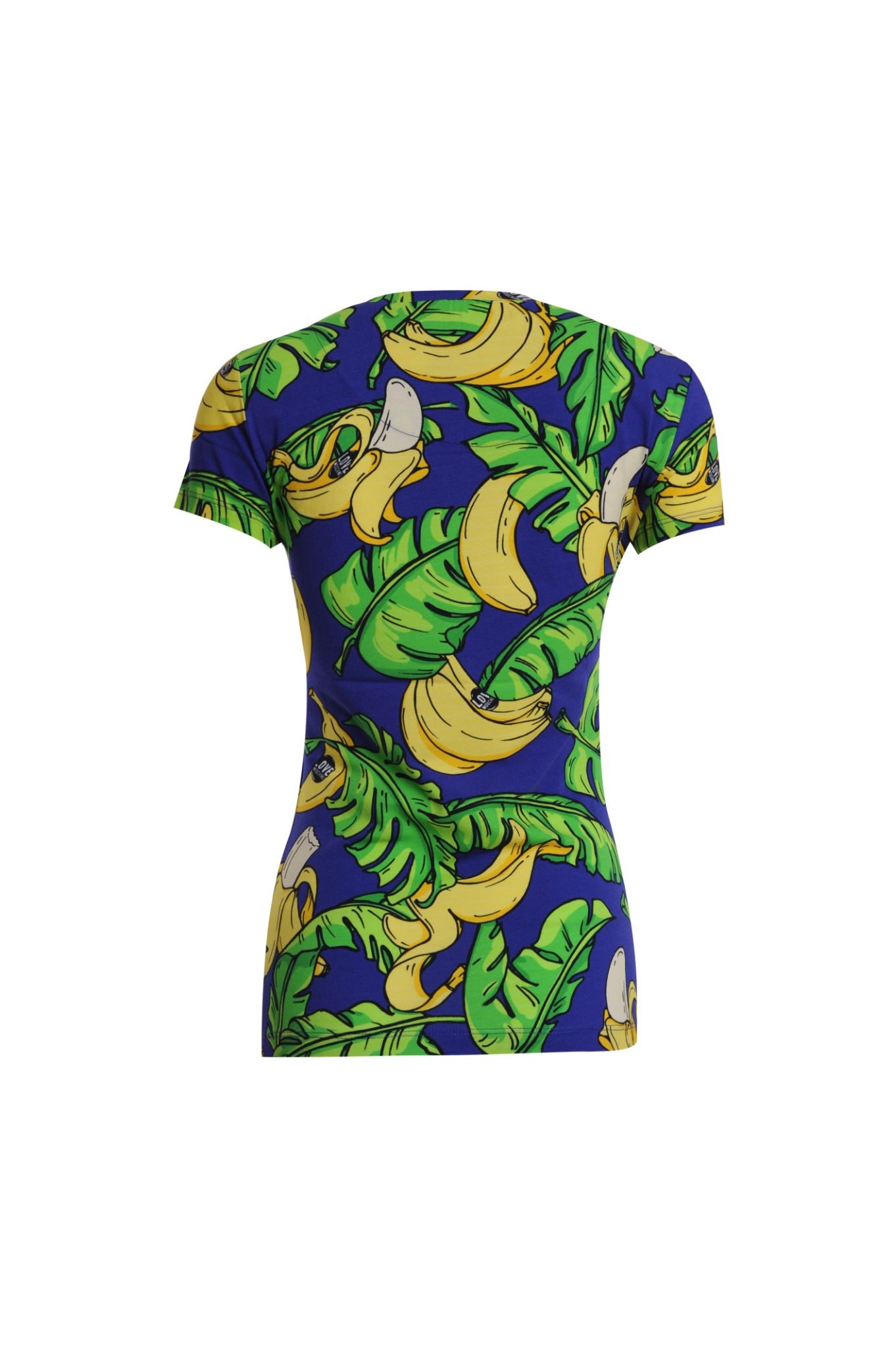 Áo phông nữ cộc tay nền màu tím, toàn thân in hình lá và quả chuối