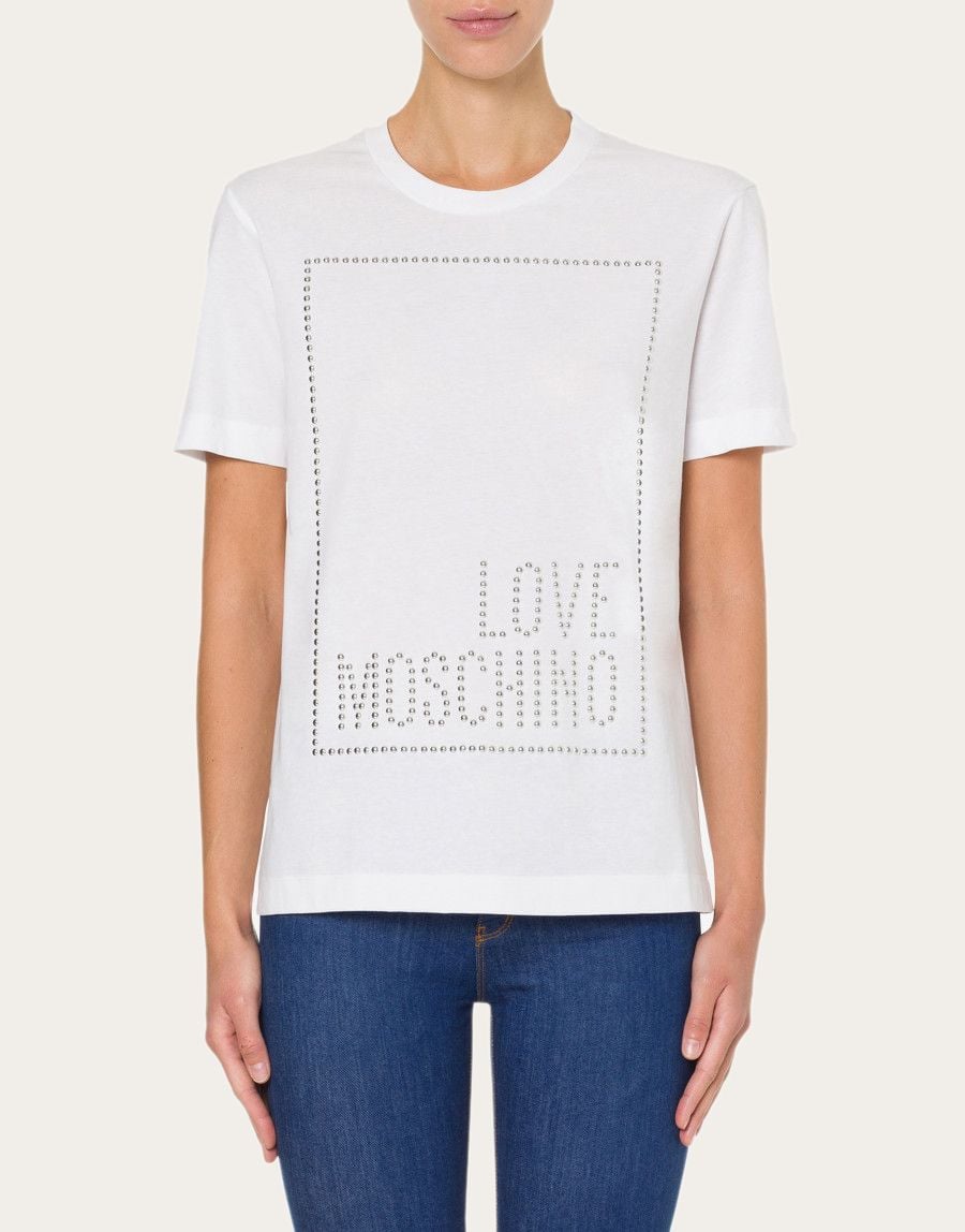 Áo phông nữ cộc tay màu trắng thân trước đính đinh tán tạo hình chữ Love Moschino trong khung