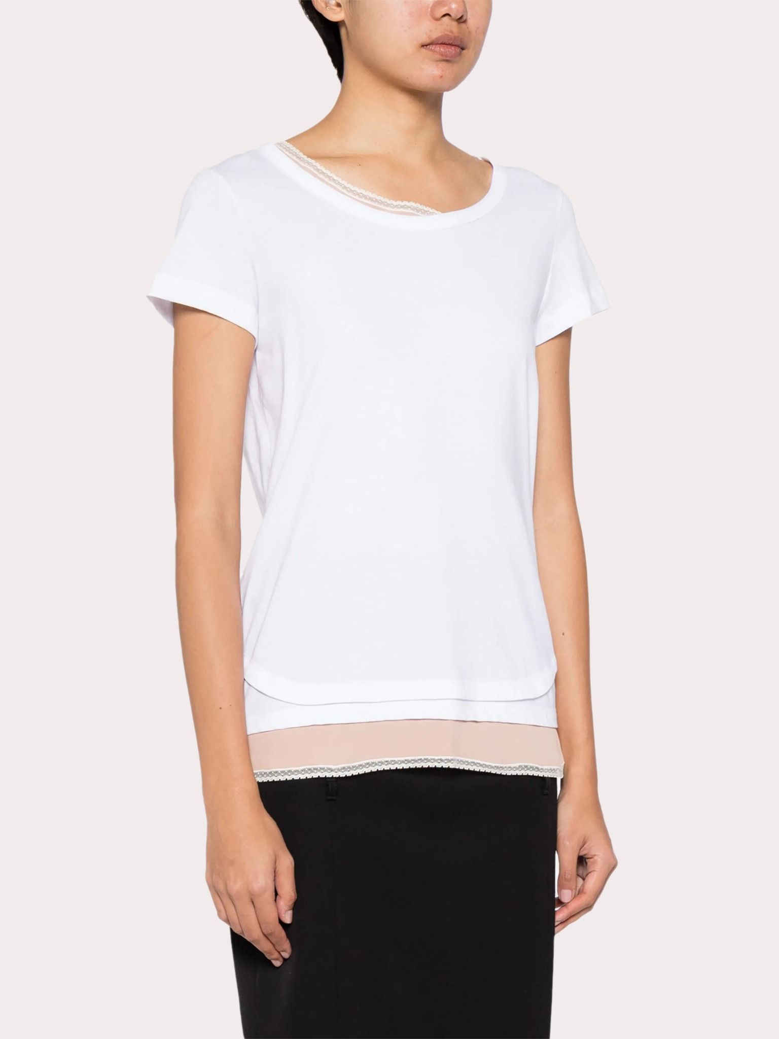 Áo phông nữ côc tay cổ tròn màu trắng, nửa cổ phải và gấu pha vải màu hồng và ren màu be