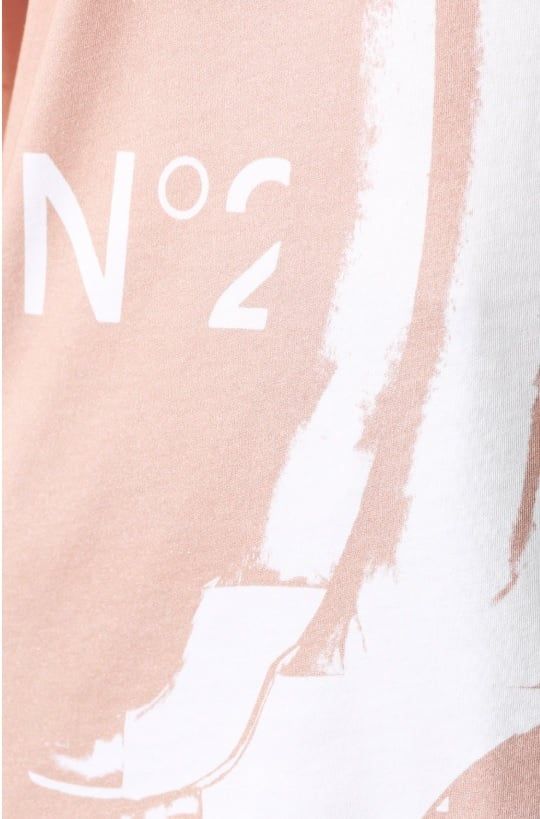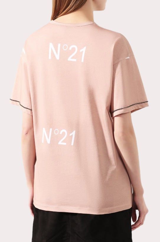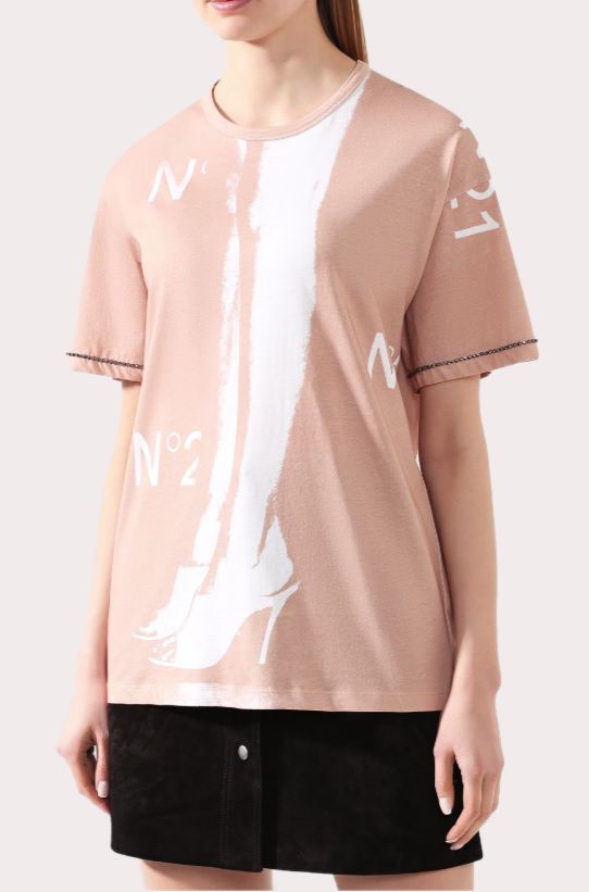 Áo phông nữ cộc tay màu hồng , tay chạy đá mà đen , thân trước in hình đôi chân và chữ N21 màu trắng